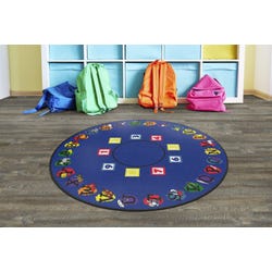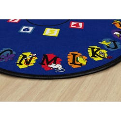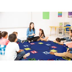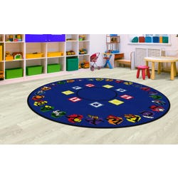 Flagship Carpets Super Circle Round Carpet is perfect for gathering students for circle time or storytime. It has a complete alphabet along with a visual image to associate each letter with a sound. This bright classroom carpet also features numerals 1 - 9 in its center for additional number recognition. Perfect for early education spaces such as playrooms, preschools, childcare centers, and classrooms with young children. For educational spaces first introducing literacy to their learners, look no further. Washable carpets feature skid-resistant backing to prevent slips and trips, and are treated with SCOTCHGARD-PROTECTOR for superior soil resistance and FORCE 5, a permanent anti-microbial agent to guard against odor, mildew, and mold. All Flagship Carpets are CRI Green Label Plus Certified. Backing contains synthetic (SBR) latex for those with latex allergies. Round rug is available in several sizes to match your space.Features