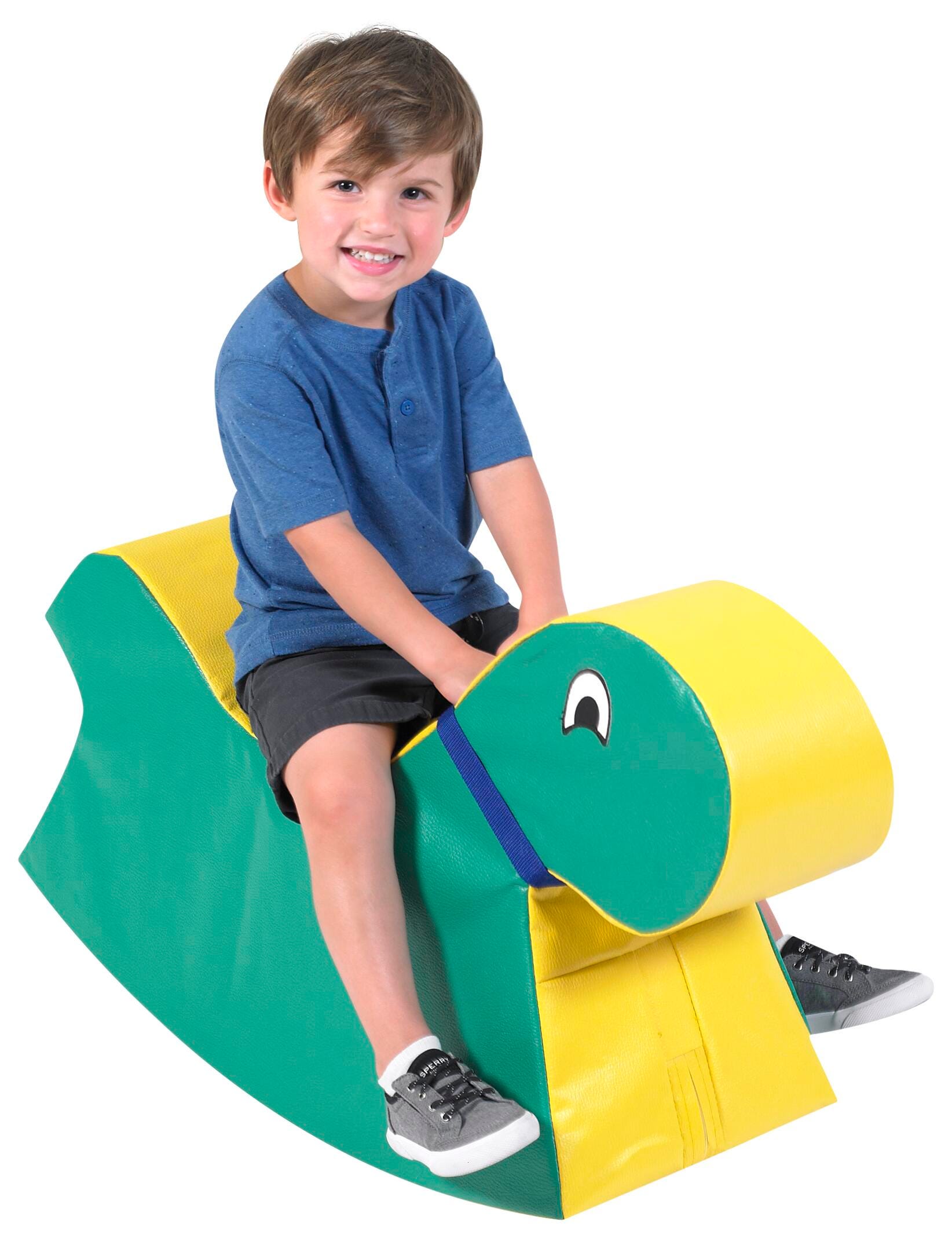 Green Big Rocky lends a friendly face to active play and active seating, perfect for getting the wiggles out in a controlled environment. This durable rocker has no hard edges, and lends the perfect foam seat for spaces like playrooms and reading corners. The cantilevered base helps prevent tipping and a high-density foam core that provides comfortable safe seating for your smallest students. Measures 33 L x 11 W x 20 H inches.Features