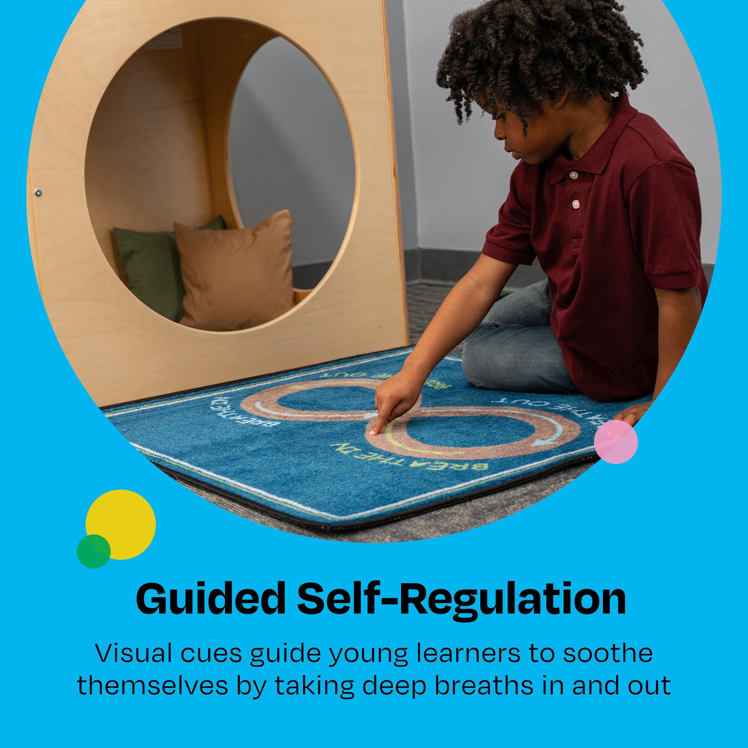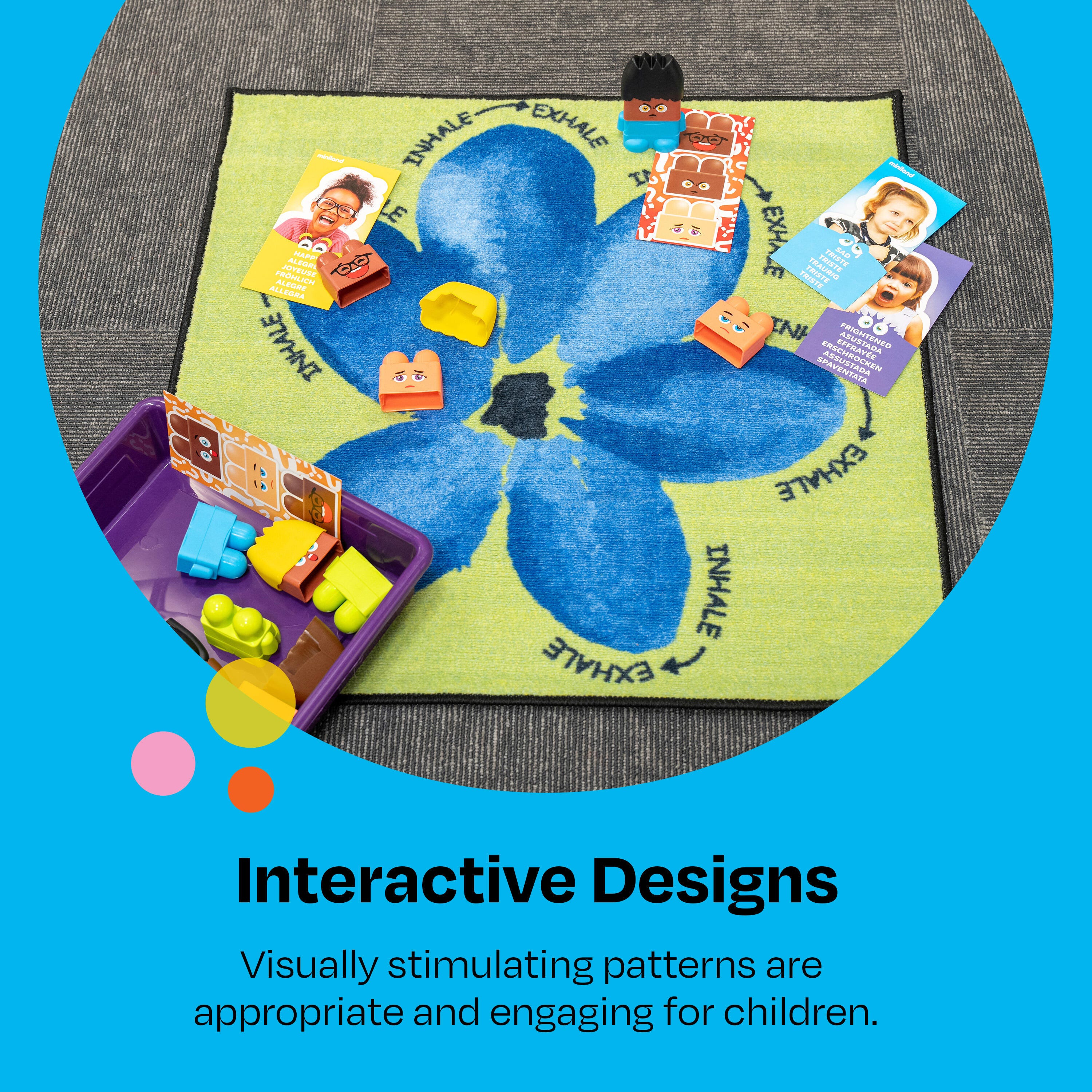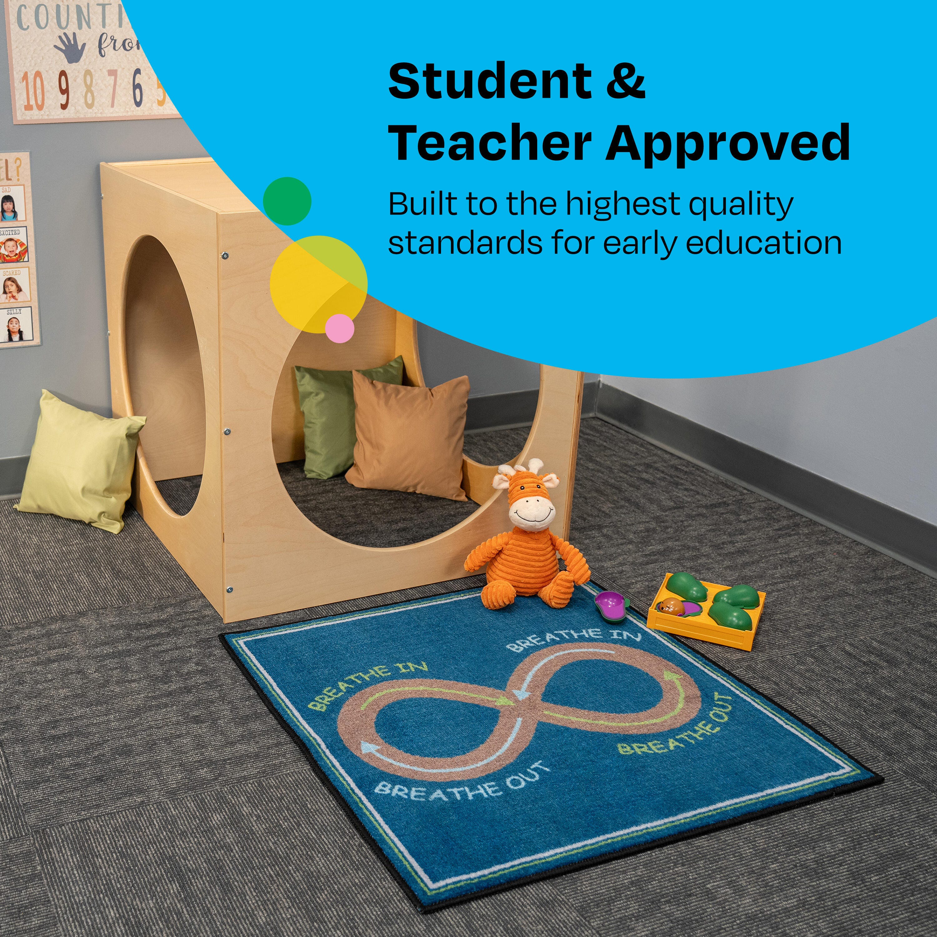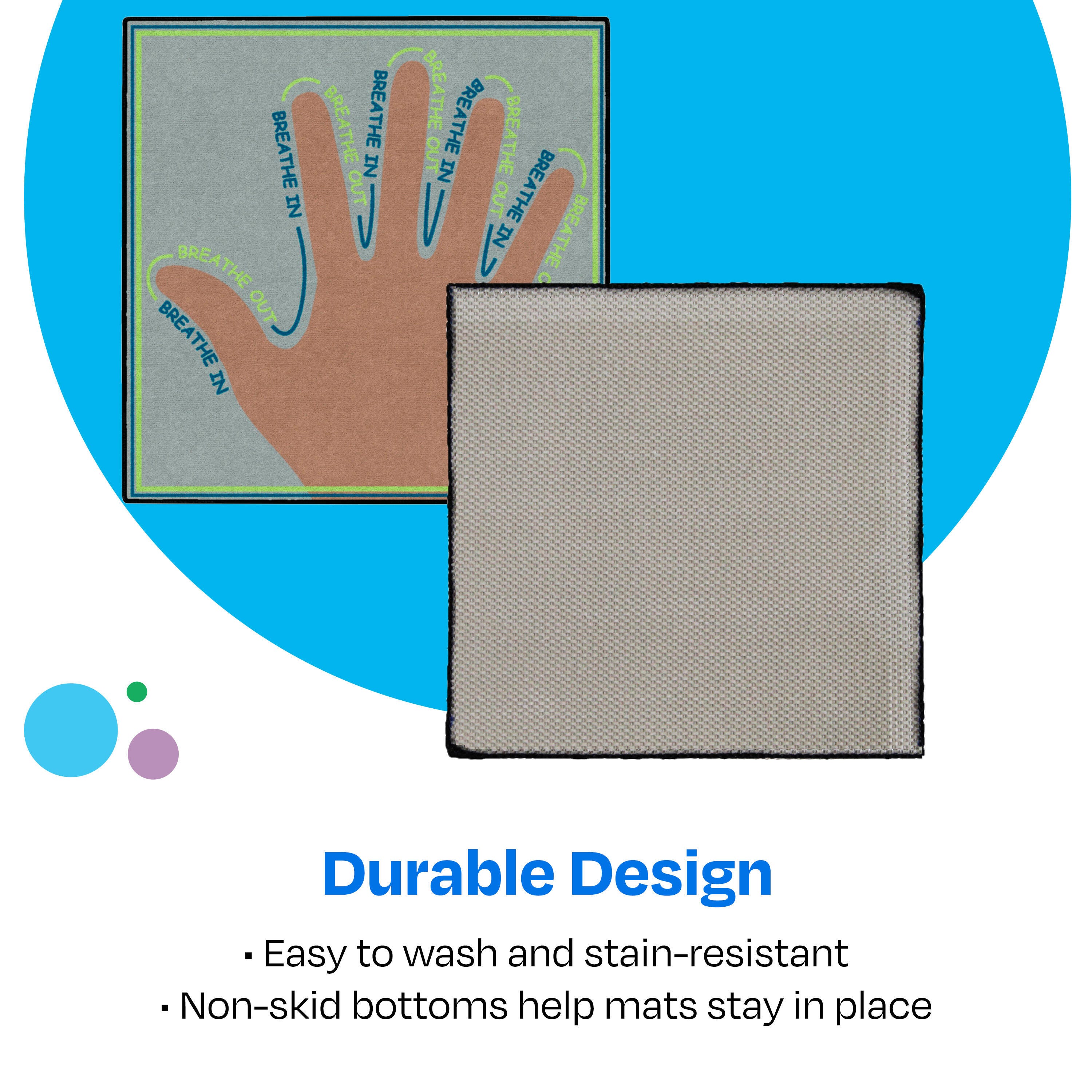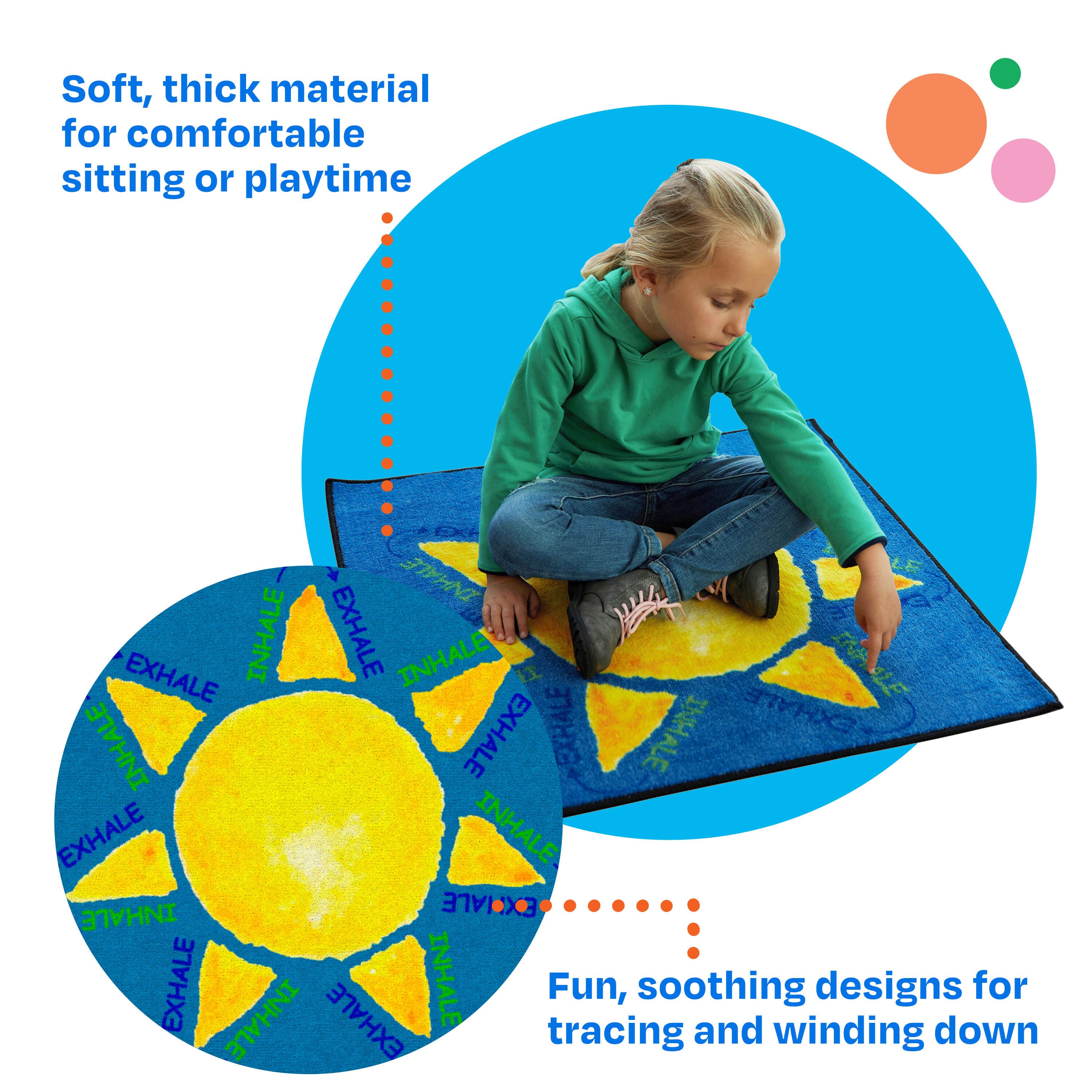 Childcraft® Breathe with Me Carpet Squares for classrooms are comfortable to sit on, play, or wind down. Each mat features calming, interactive designs for children. The carpet tiles have visual cues to guide young learners to soothe themselves by taking deep breaths in and out, a proven technique to help balance emotions and lower stress. The calming design helps support the development of important executive functions and social and emotional skills. Students can physically trace each design as they breathe for a more tactile and engaging experience. Made of high-quality materials, the large sitting carpets are washable, skid-resistant, and durable for everyday use. Appropriate for indoor or outdoor learning, simply fold up when done for compact storage.