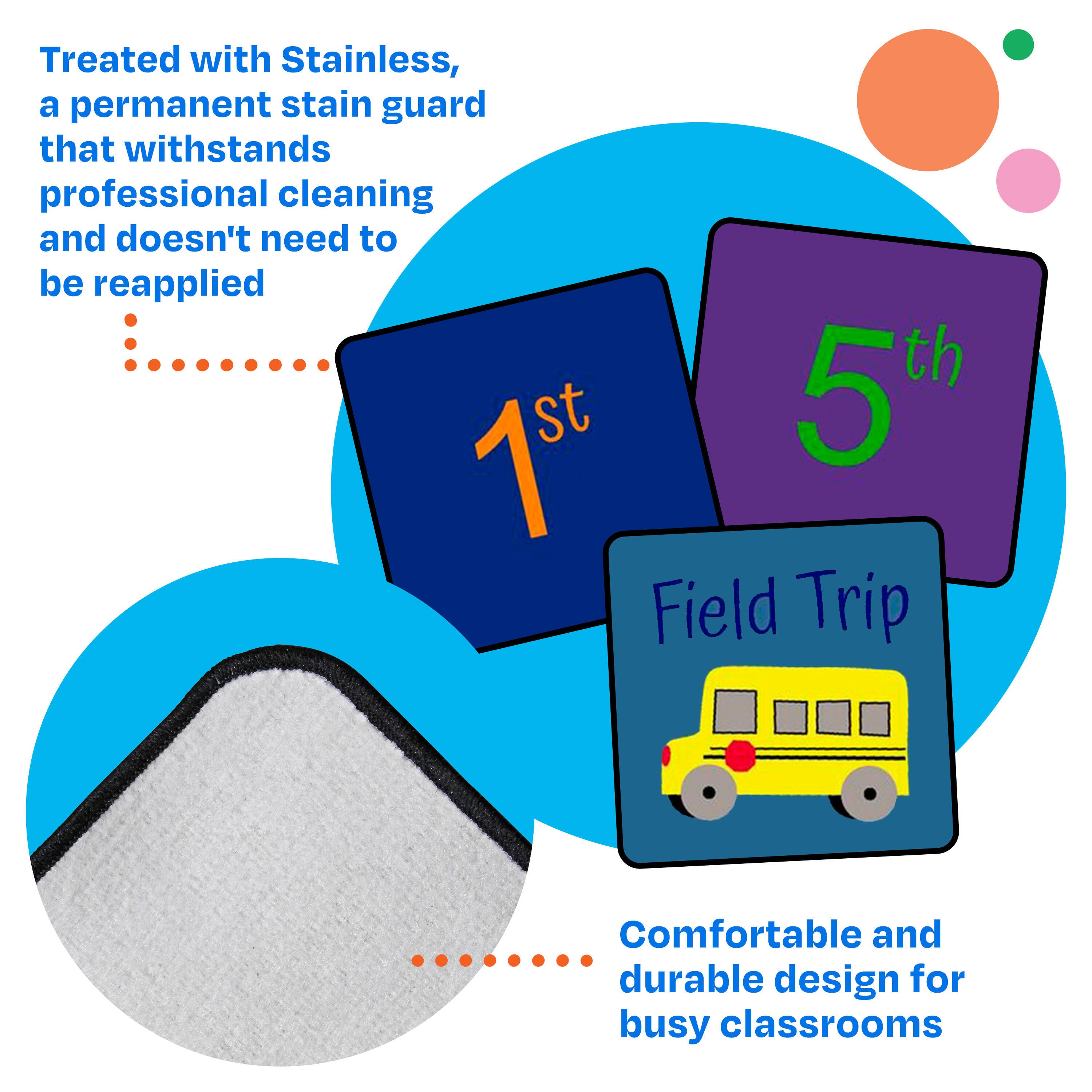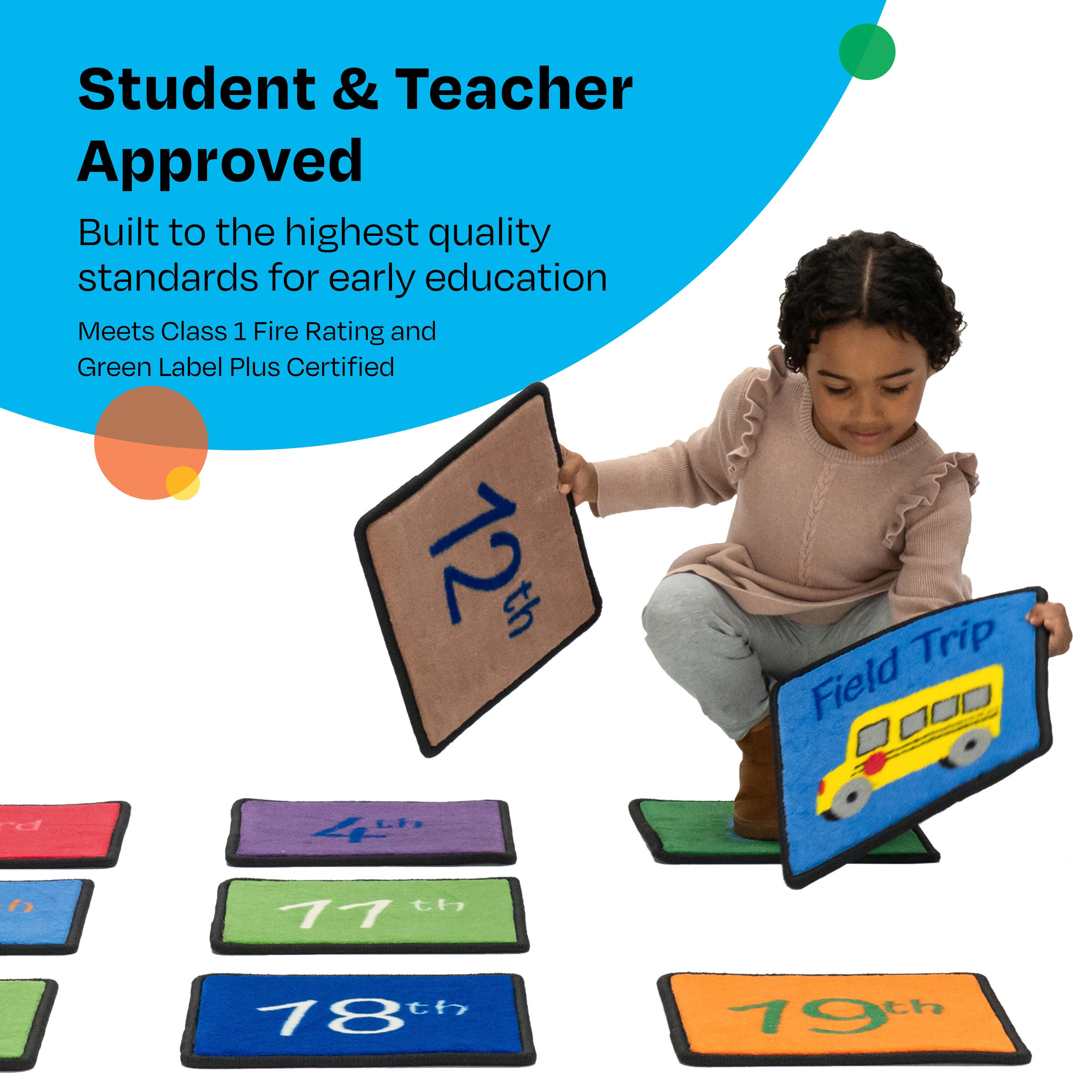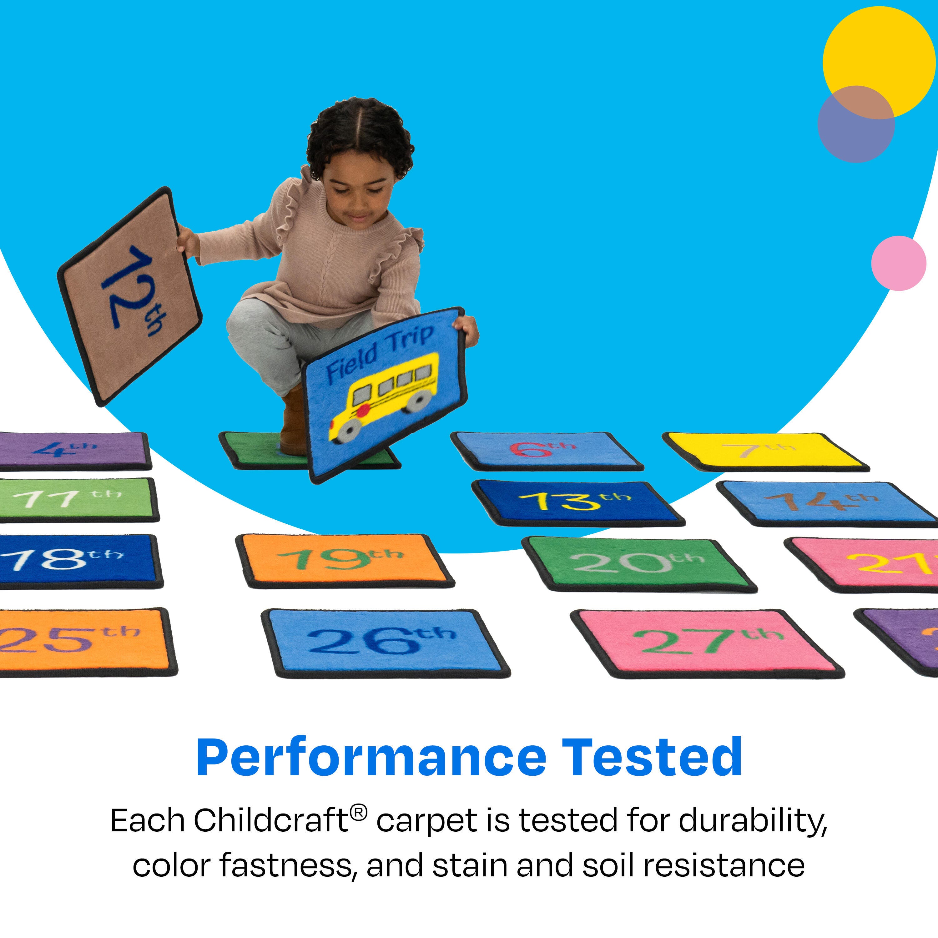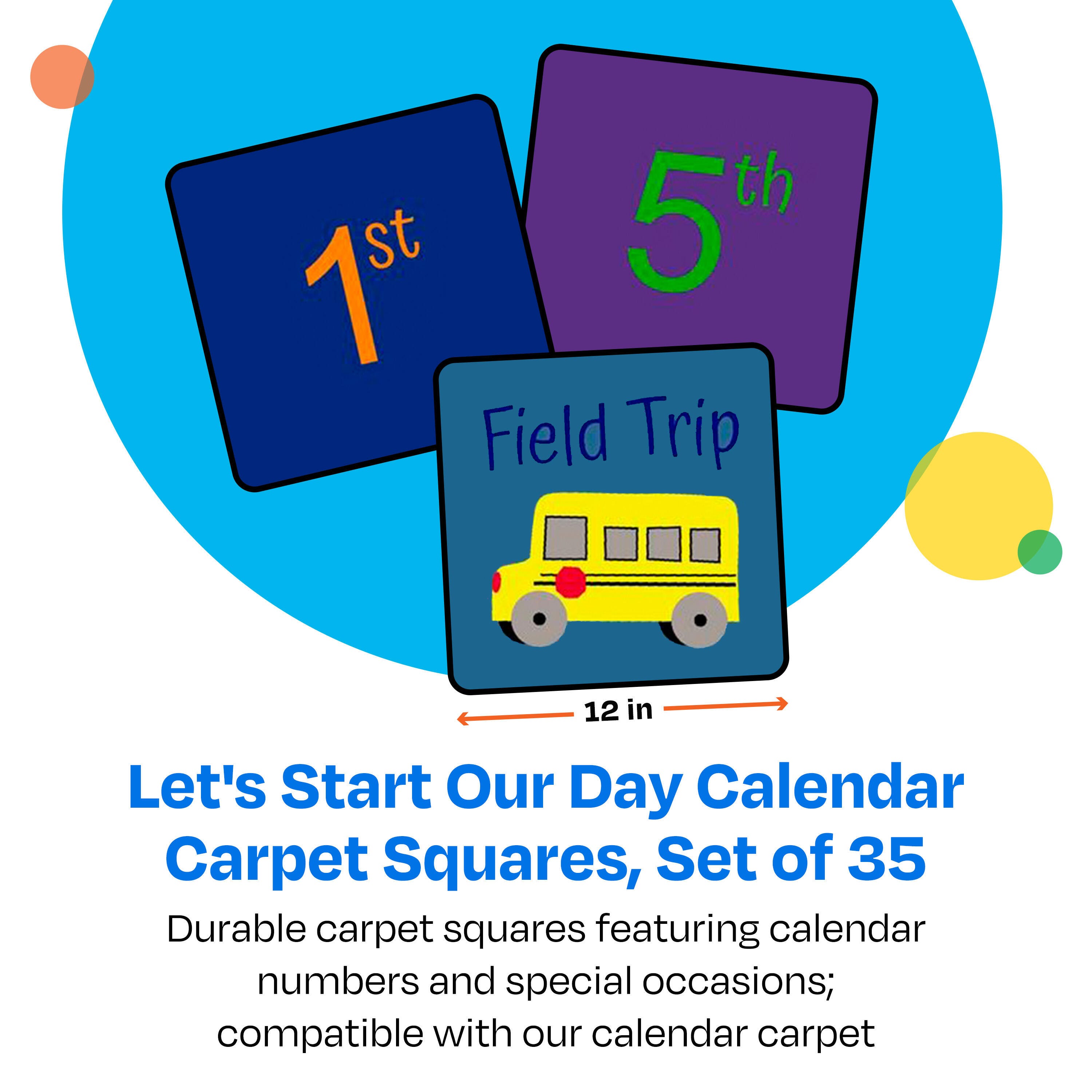 Childcraft® Let's Start Our Day Calendar Carpet Squares offer an engaging way for young learners to explore days, months, and special school events while reinforcing number recognition. Each 12 x 12 square features bold, easy-to-read numbers from 1st to 31st, along with special event markers such as "Field Trip" and a school bus graphic. These durable carpet squares complement the Childcraft Let's Start Our Day Calendar Carpet (sold separately) and can be rearranged daily for interactive calendar activities. See item number 4002149 for the matching full-size carpet. Each Childcraft carpet is performance tested for durability, color fastness, and stain and soil resistance for quality you can trust.Please Note: Childcraft® carpets are custom designs that are made to order and are therefore non-returnable.