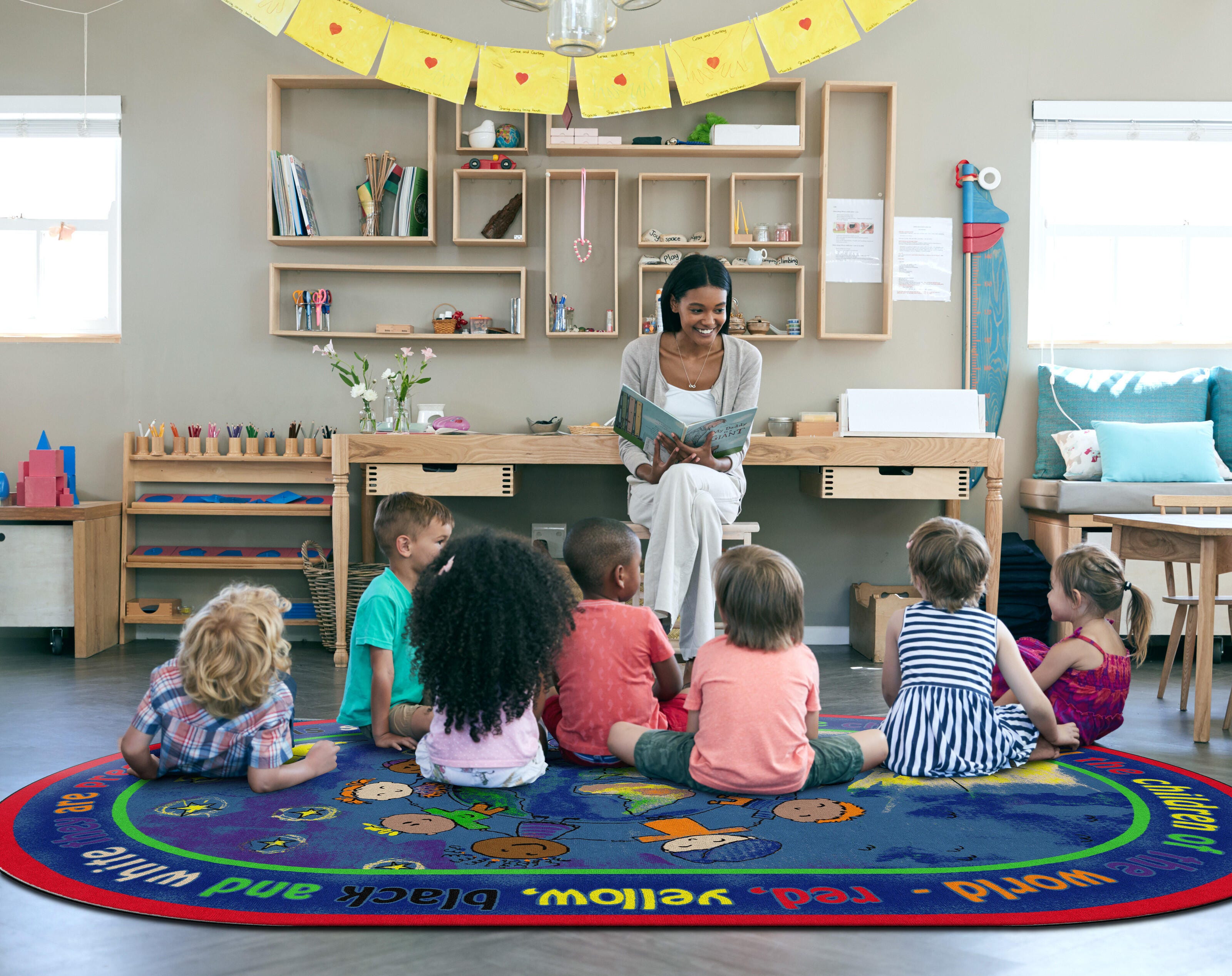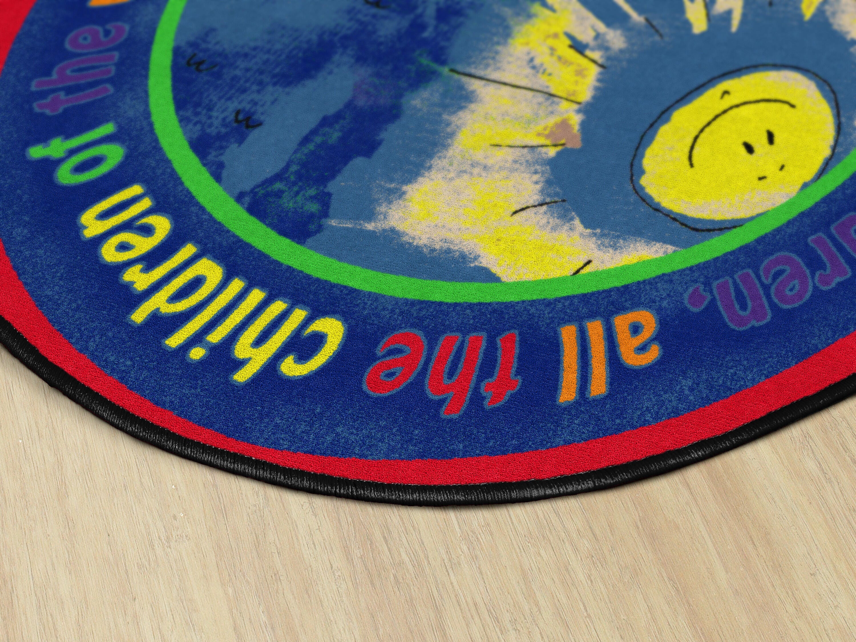 The Flagship Carpets All The Little Children Oval Carpet displays and image of children helping to celebrate diversity. The carpet is bordered by a colorful religious message meant to inspire children to embrace differences and come together. It can be used as an aesthetic area rug or a functional seating carpet based on your spaces needs. The edges are tightly bound and double-stitched for maximum strength, and the skid-resistant Action Bac woven backing system prevents wrinkles and bunching so it provides long-lasting use.This bright carpet is great for childcare centers, playrooms, churches, classrooms, and more!