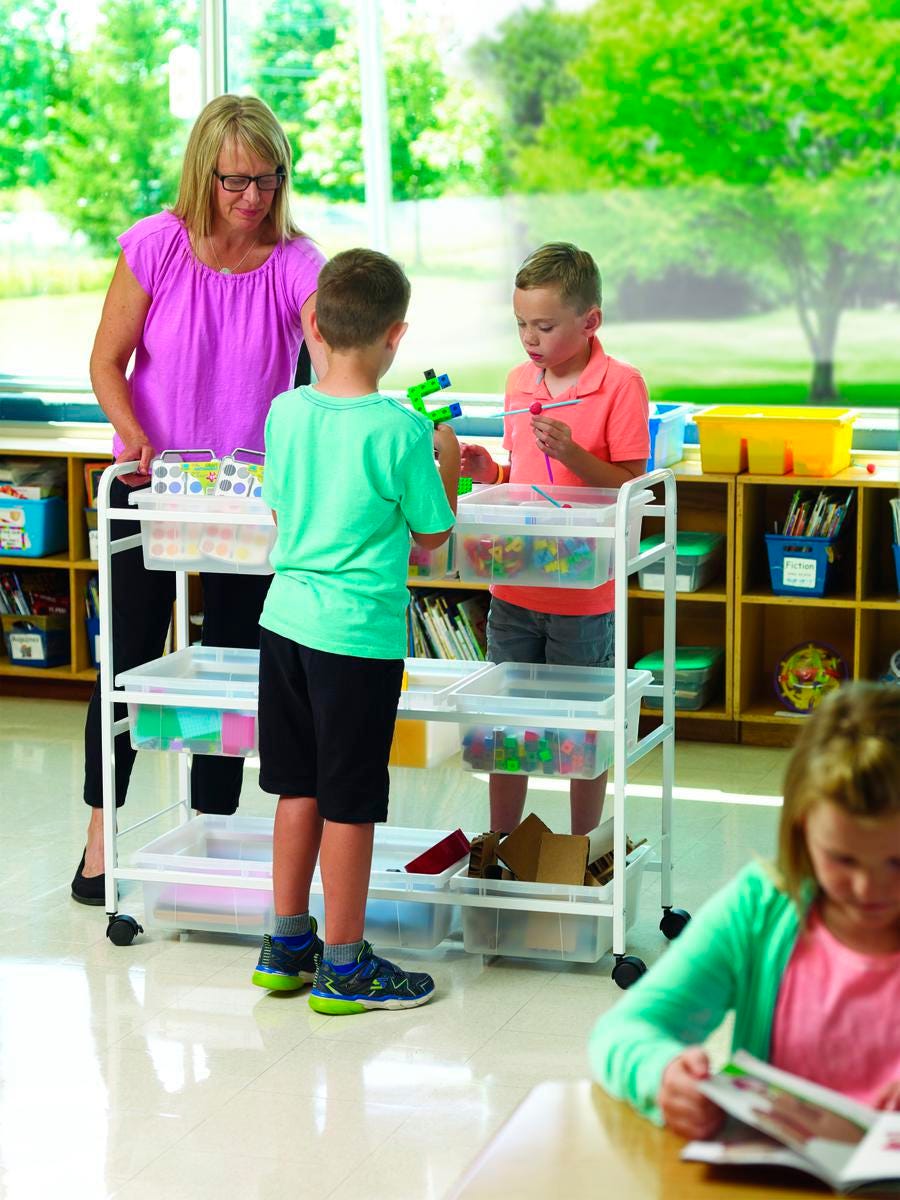 Copernicus Storage Carts feature various-sized tubs for the organization of multiple items and easily move between areas in the classroom.