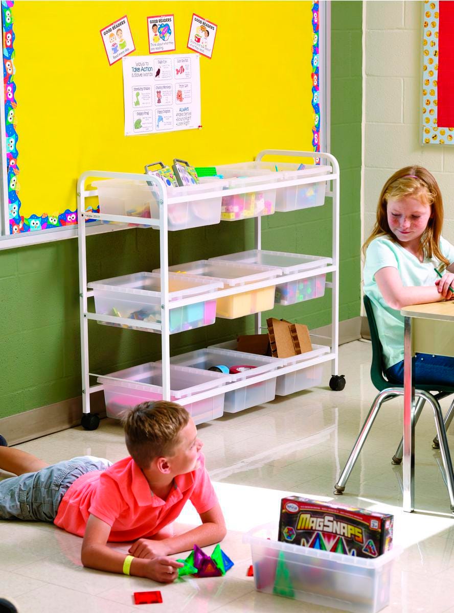 Description Teachers have told us they love clear tubs to help students (and themselves) keep everything orderly and visible. This cart is designed to hold up to 90 pounds and to be used in your busy STEM classroom. Lifetime frame and tub warranty.Features 3 Divided Tubs 6 Open Tubs 2-inch locking casters Tubs can be easily labeled (labels not included)