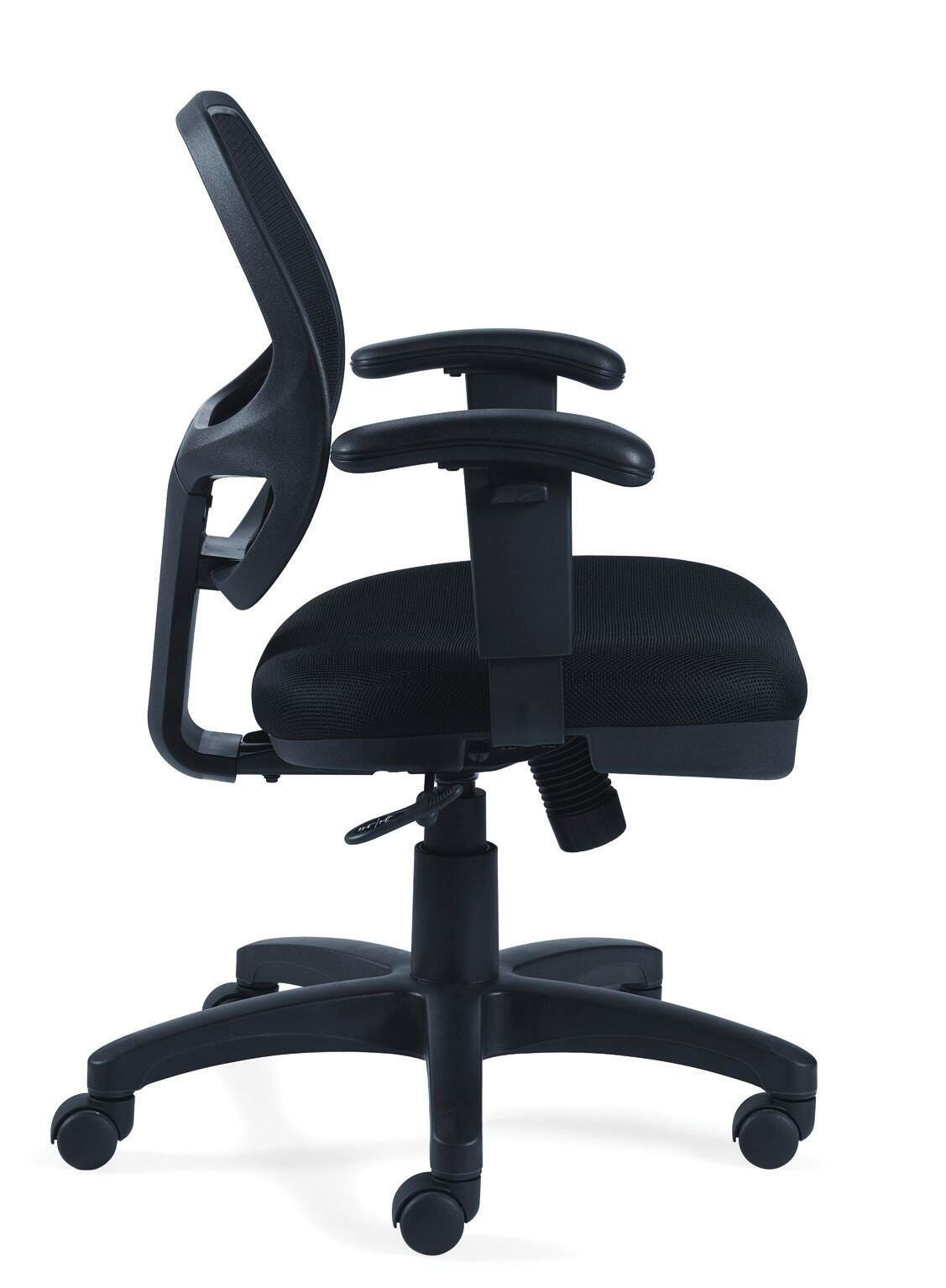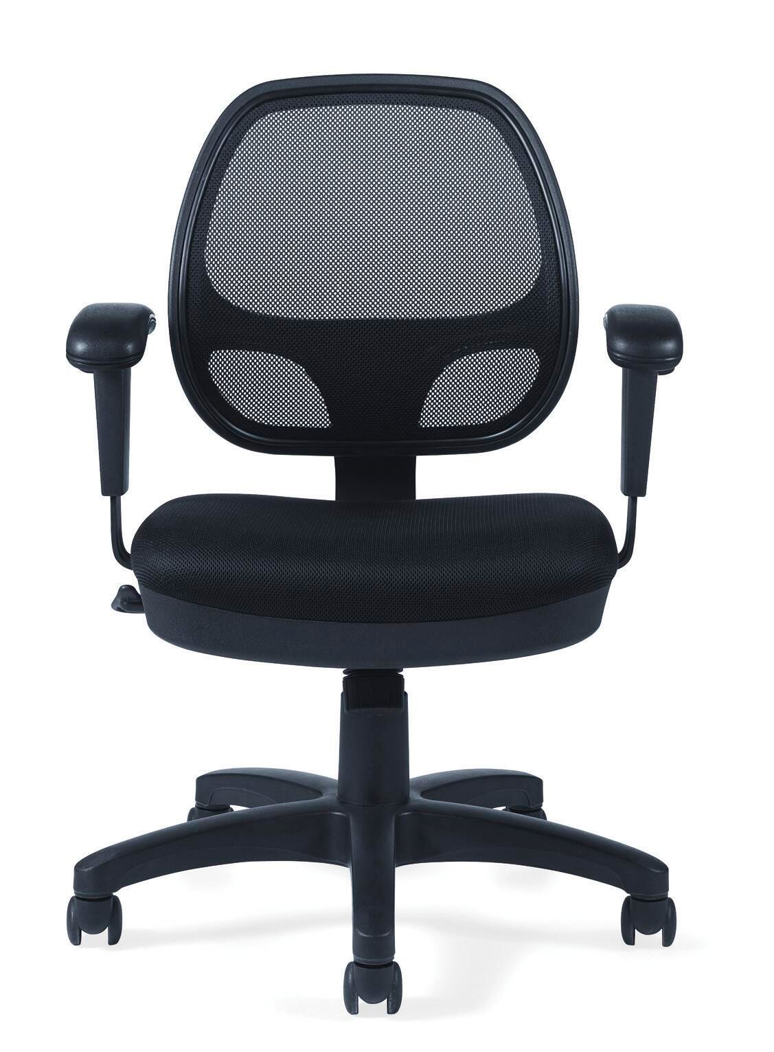Soft black mesh fabric with breathable fabric seat. Synchro-tilt chair control with multi-position tilt lock. Height adjustable arms. Measures 24-1/2 W x 22 D x 37 H inches. Offices to Go 5-year warranty.