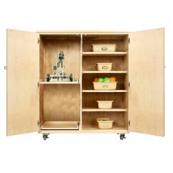 A mobile storage cabinet designed to work perfectly to store your robots and parts. The cabinet is made of maple plywood and has swinging doors that have 3-point locking handles. The interior has two sections; the left-hand section has two pull out drawers with full extension glides for storing completed or partially built robots. The right-hand section has one fixed and four adjustable shelves. The cabinet comes with ten totes and includes heavy duty locking casters. Robots are not included with the cabniet.