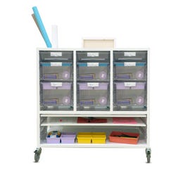 The Innov-8 is the ultimate heavy-duty mobile workstation and storage cart designed for dynamic educational environments, simplifying transportation and classroom organization with a 600-pound load capacity. Made with a durable top that lends a convenient mobile work surface perfect for hands-on learning activities. The comprehensive organization system includes nine high-quality tote trays in three versatile sizes (three 3-inch, three 6-inch, and three 9-inch) to securely store a wide range of creative resources. This see-through design, combined with an intuitive labelling system, makes finding materials quick and effortless, saving valuable prep time. Available in several tray colors to best match your space. Measures 44 W x 27-1/4 L x 44 H inches.Features