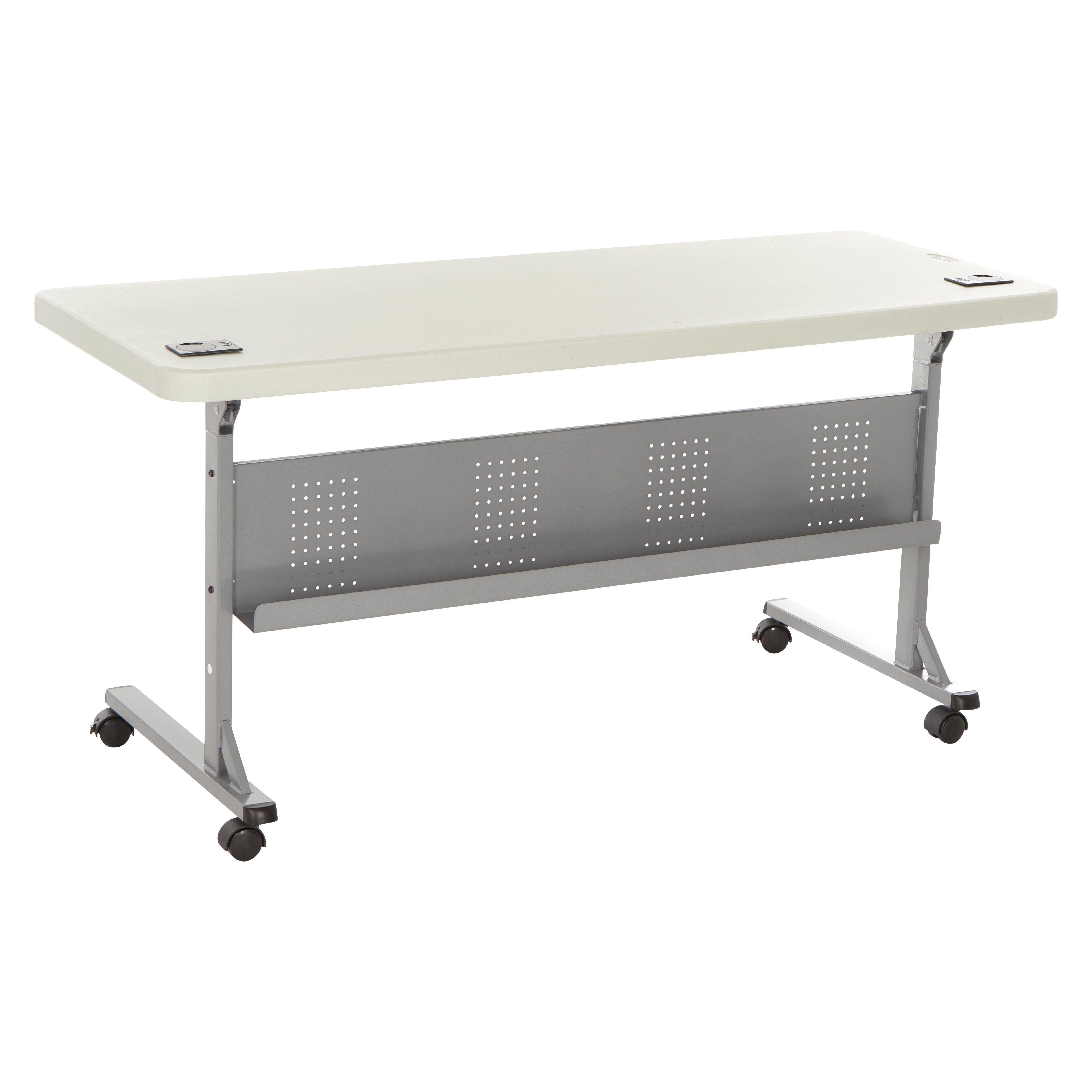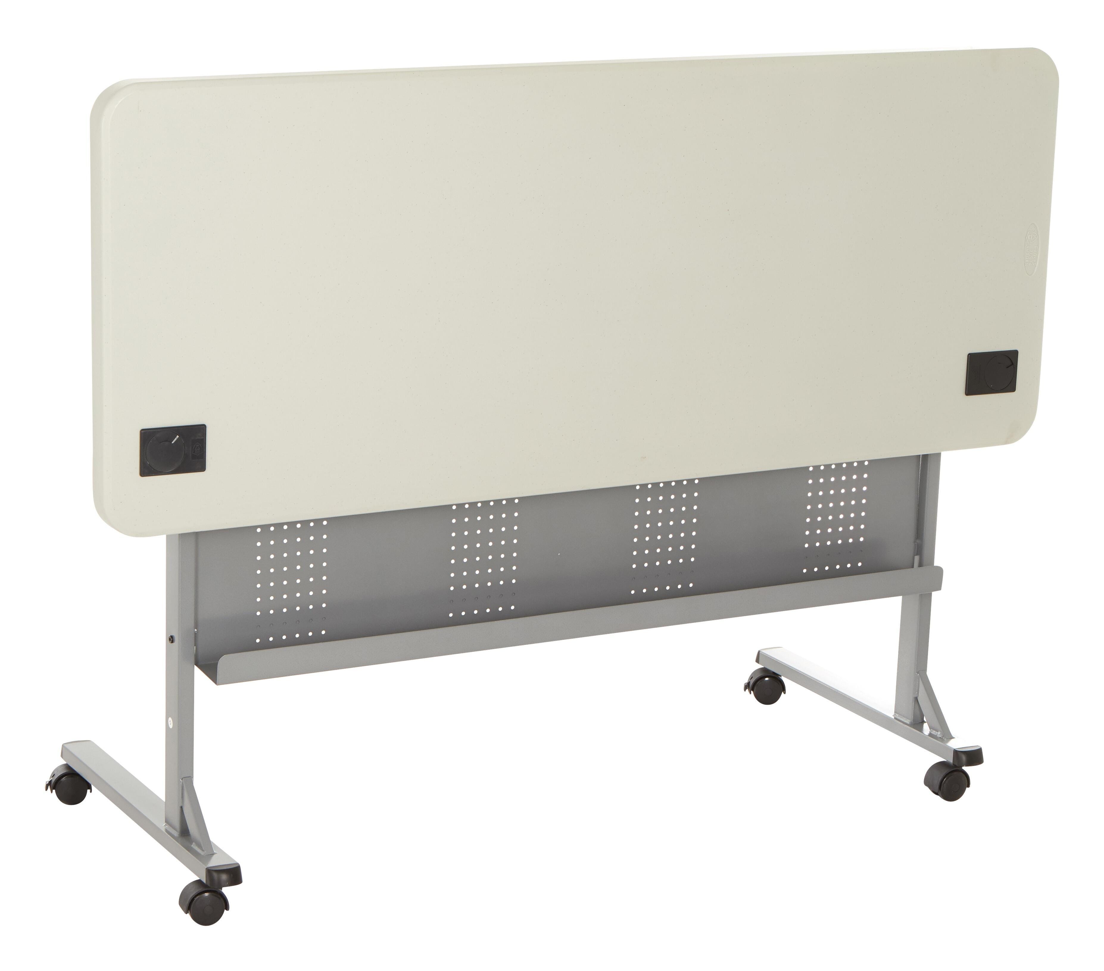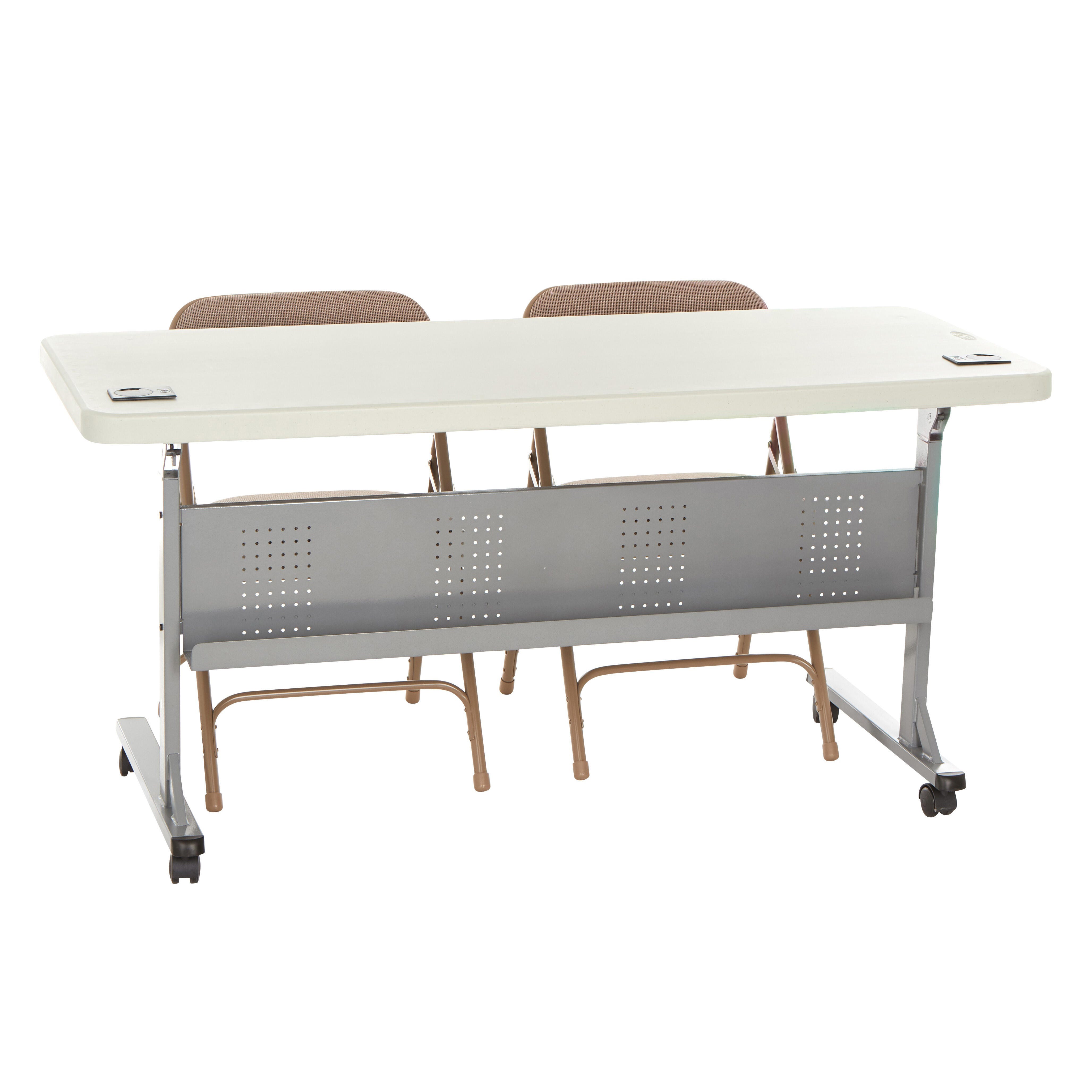 National Public Seating Grey Flip and Store includes wire management grommets and a modesty panel. Perfect for multi-purpose, dynamic spaces like training or conference rooms. These tables are durable when in use and nest together when not in use. Tabletop measures 24 W x 60 D inches. Measures 60 W x 24 D x 29-1/2 H inches in total.