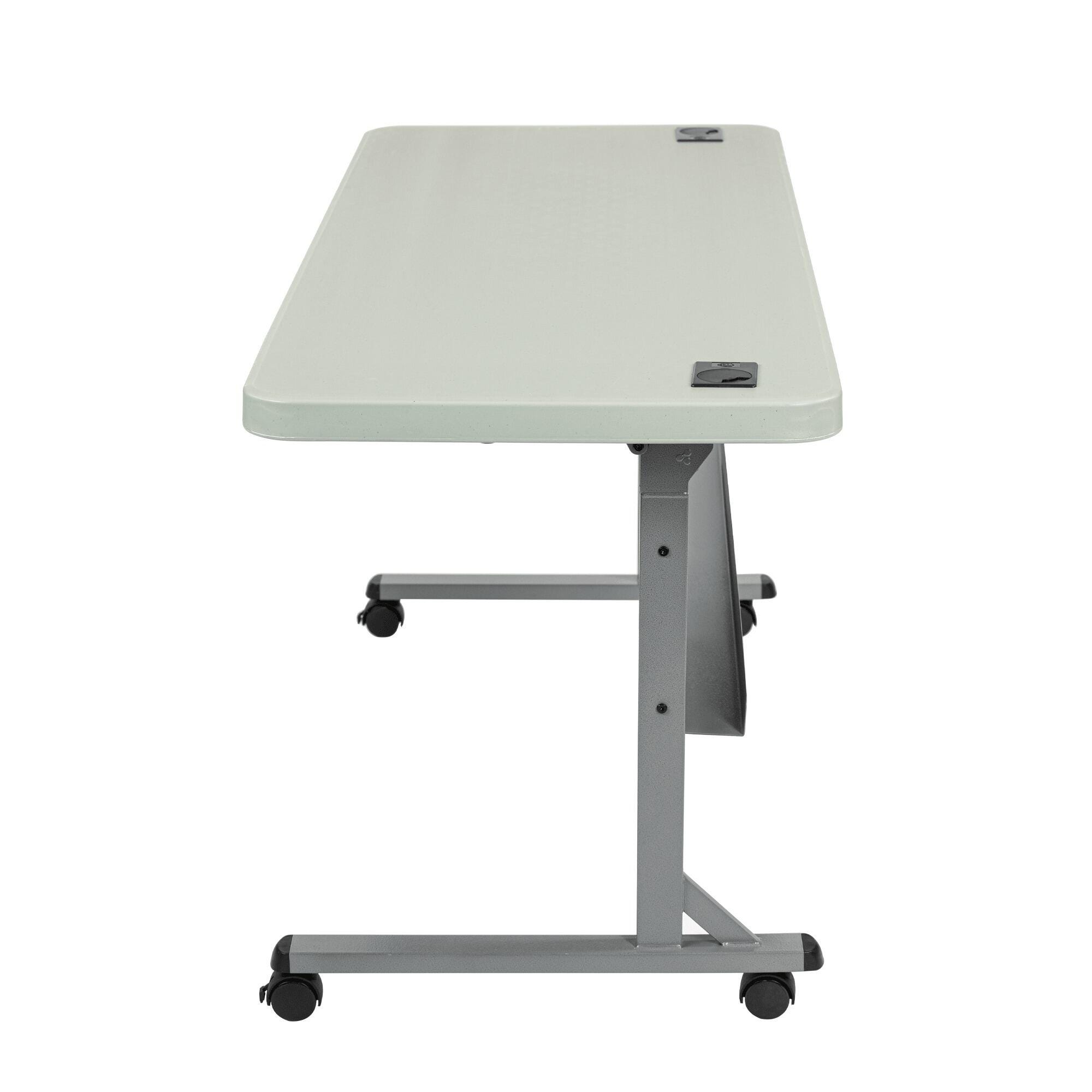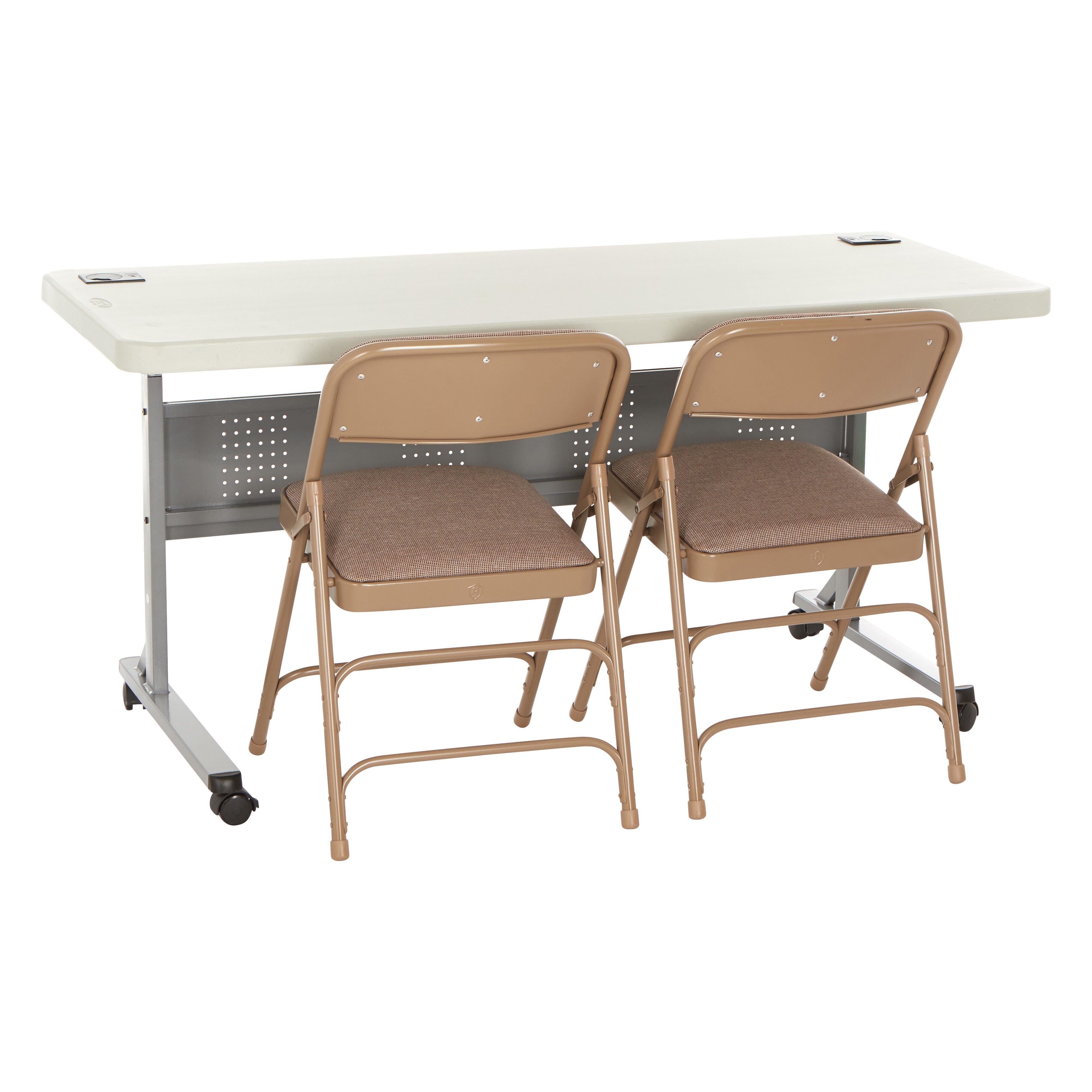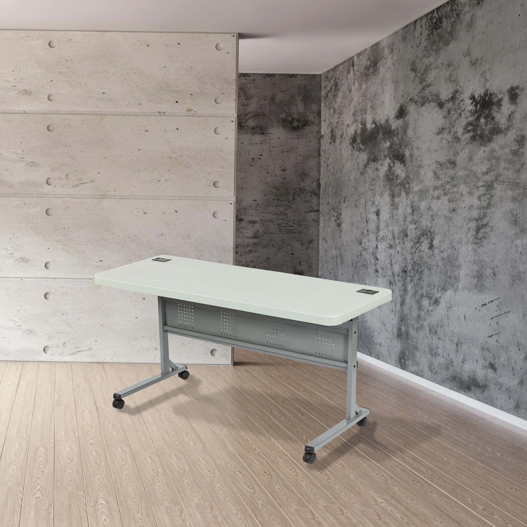 National Public Seating Grey Flip and Store includes wire management grommets and a modesty panel. Perfect for multi-purpose, dynamic spaces like training or conference rooms. These tables are durable when in use and nest together when not in use. Tabletop measures 24 W x 60 D inches. Measures 60 W x 24 D x 29-1/2 H inches in total.