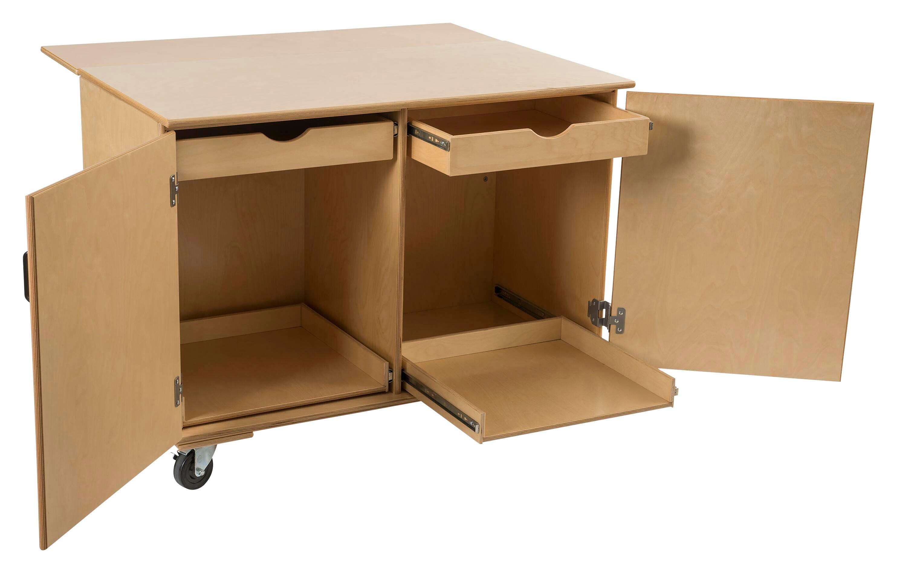 Classroom Select Mobile Workbench provides both storage and work surface space to make the most of your makerspace and robotic project area. Organize components, supplies, or tools with two spacious upper closed drawers; or carefully store and remove those more delicate pieces on the easy pull-out lower shelves. The top expands an additional 12-1/4 inches to a full 36 inch depth work surface for even ample room! Each cubby offers a generously sized capacity of 21 W X 18 D X 23 H inches. The unit includes locking, extra durable casters (measuring 4 inches each) for ease of movement. Full unit is made from durable Birch Maple and has the option to lock. GREENGUARD Certified.