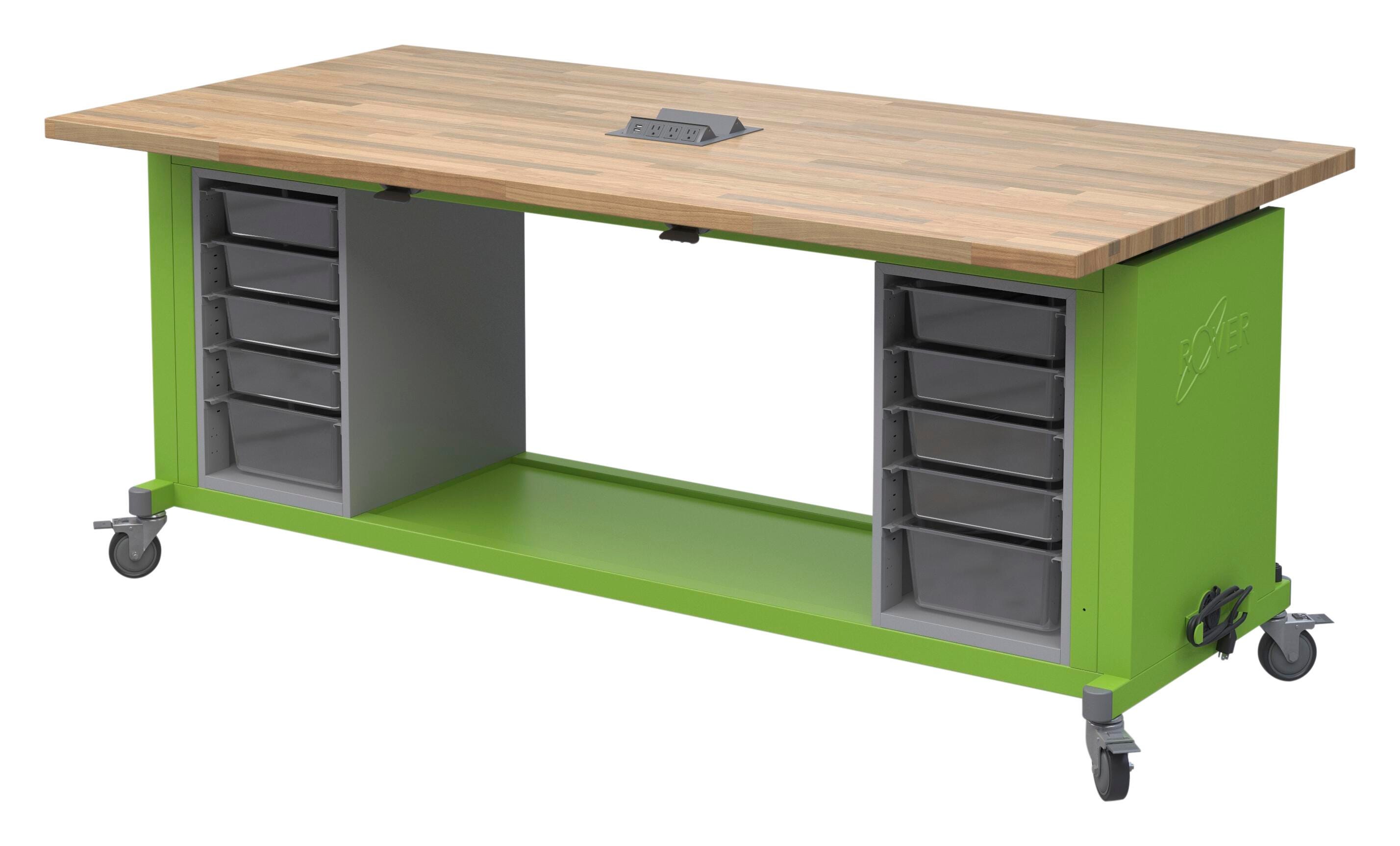A successful project starts with this maker table. Made with solid hard maple butcher block, welded steel tube, and 18 gauge formed and welded steel frame. Rests on 4- x 4-inch locking casters made of high-strength steel with thermoplastic polyurethane (TPU) tread, meaning they're non-marking and corrosion-resistant. The powder-coated paint frame has built-in 4 electrical outlets and 4 USBs. The frame is powder-coated and designed to withstand heavy wear, paired with clear storage bins. Measures 84 W x 29-1/2 D x 50-1/2 H inches when Rover table top is open.Features