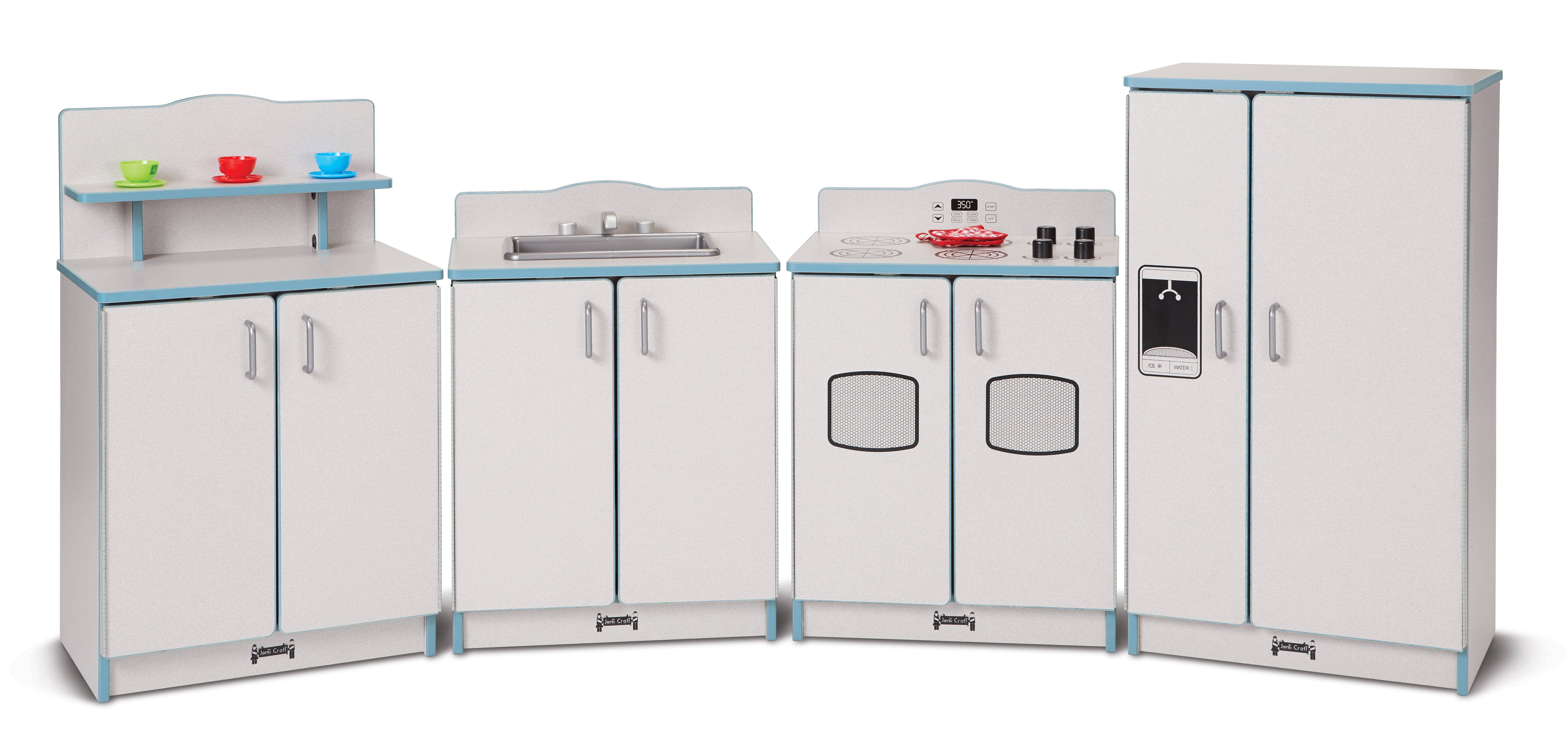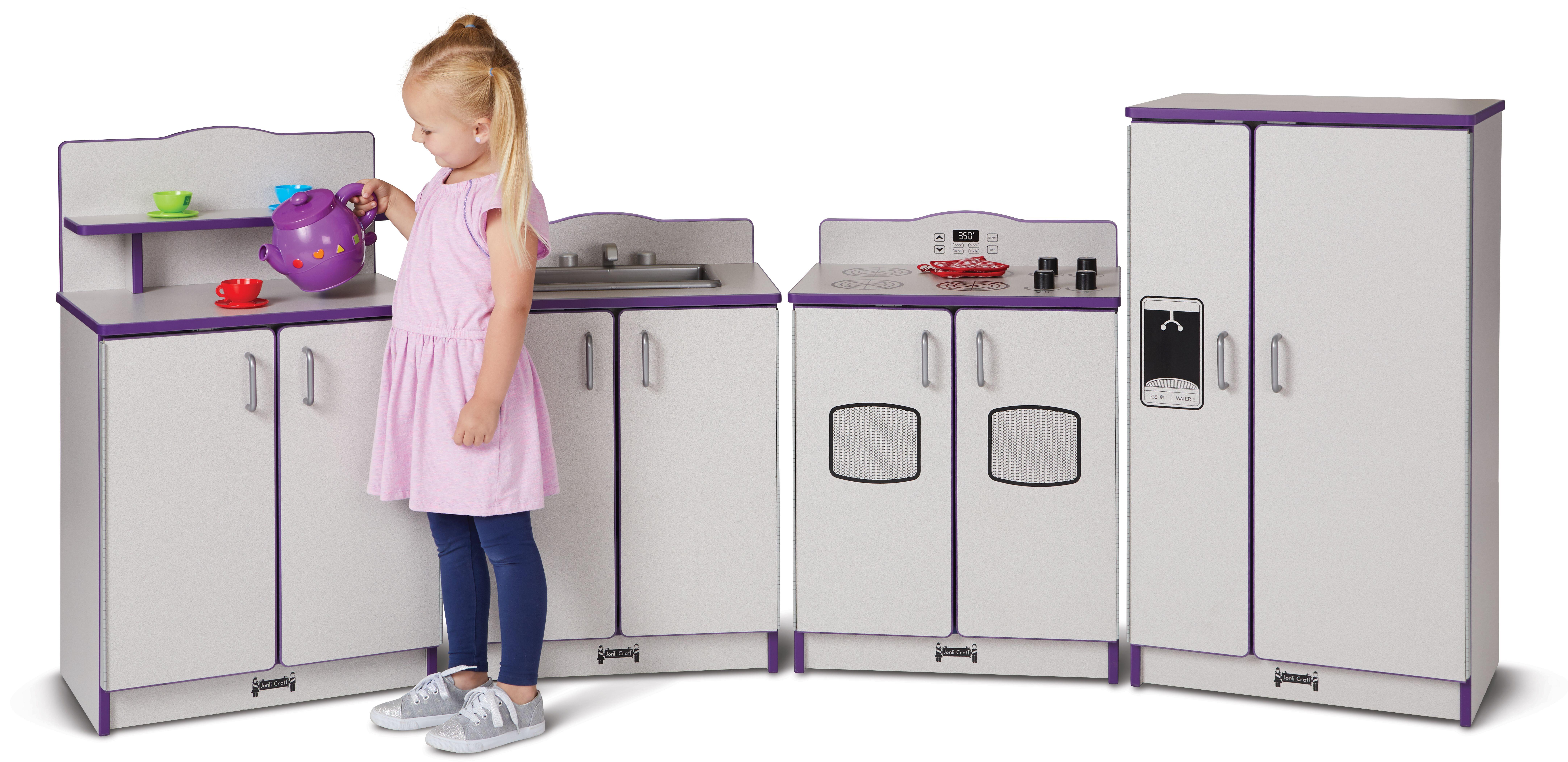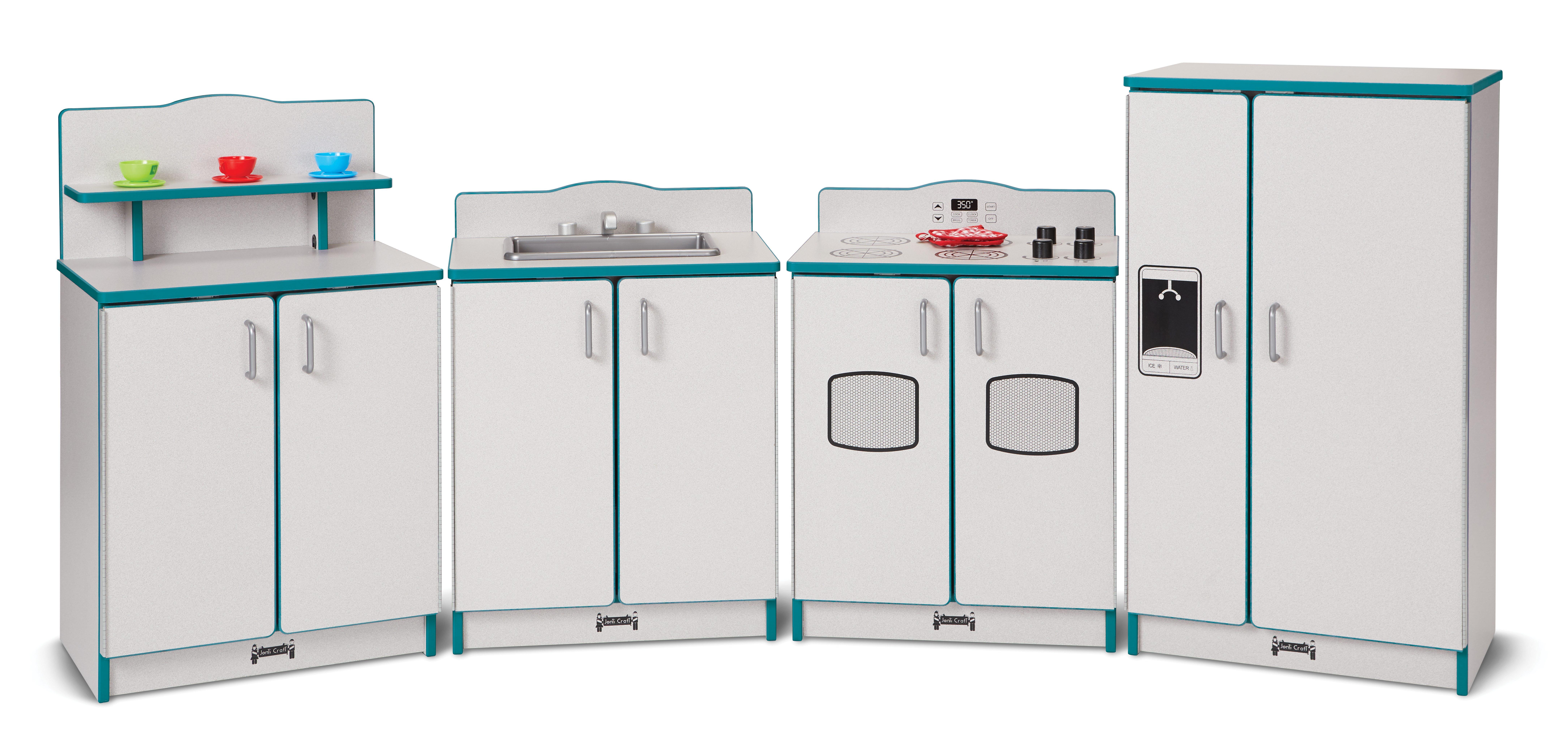 Jonti-Craft® Rainbow Accent Kitchen Set inspires creative roleplay for budding chefs to prepare gourmet meals. Mimic the motions necessary to fire up a four-course meal on the four-burner stove, grab vegetables from the refrigerator and freezer combo, or find the perfect spices from the cabinet storage. And don't forget to wash your hands and your vegetables before serving! Each unit features an interior shelf for storing play food and dishes. Available in black, blue, coastal blue, gray, key lime, navy, purple, and teal trim colors. When ordering, please select the trim color that best fits your space.Features
