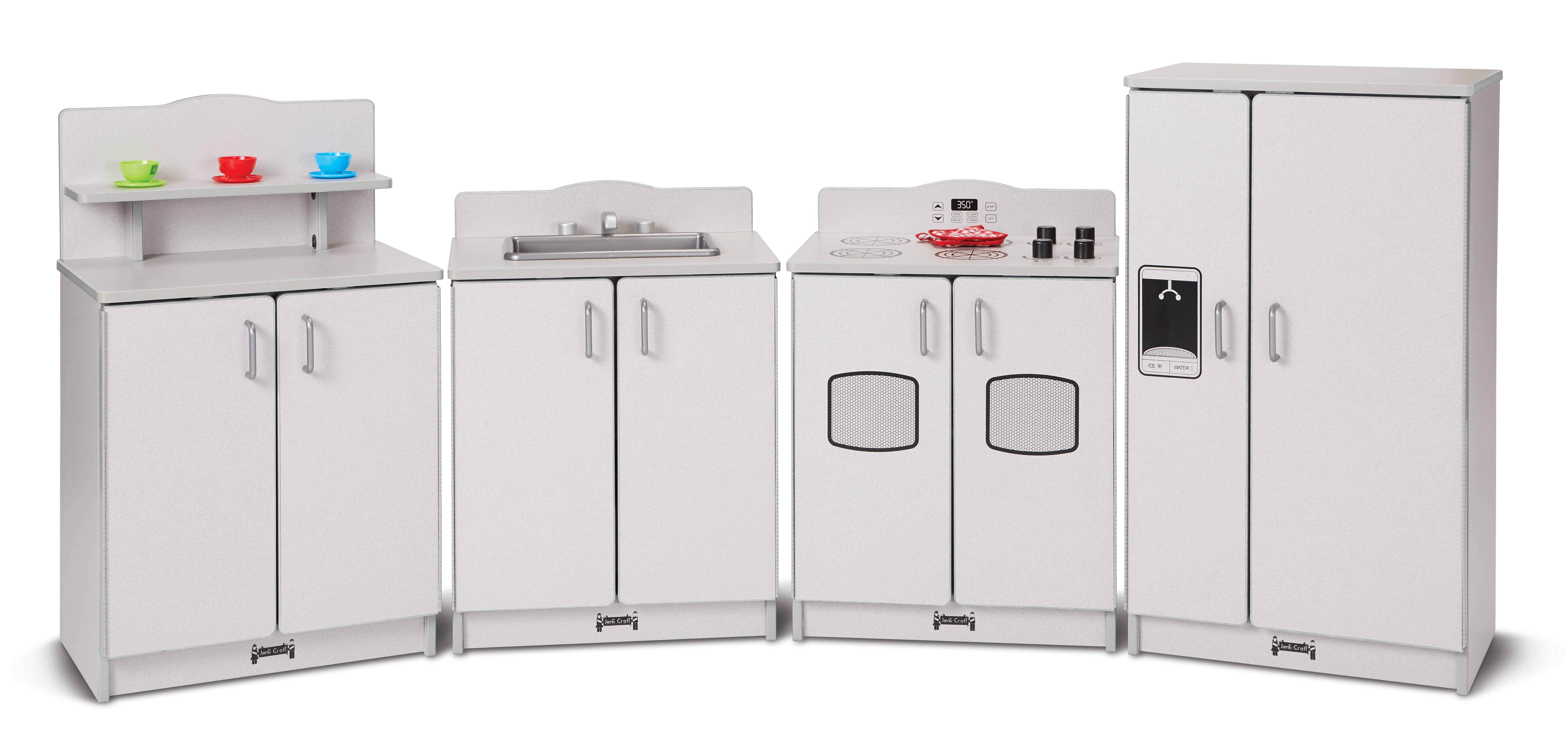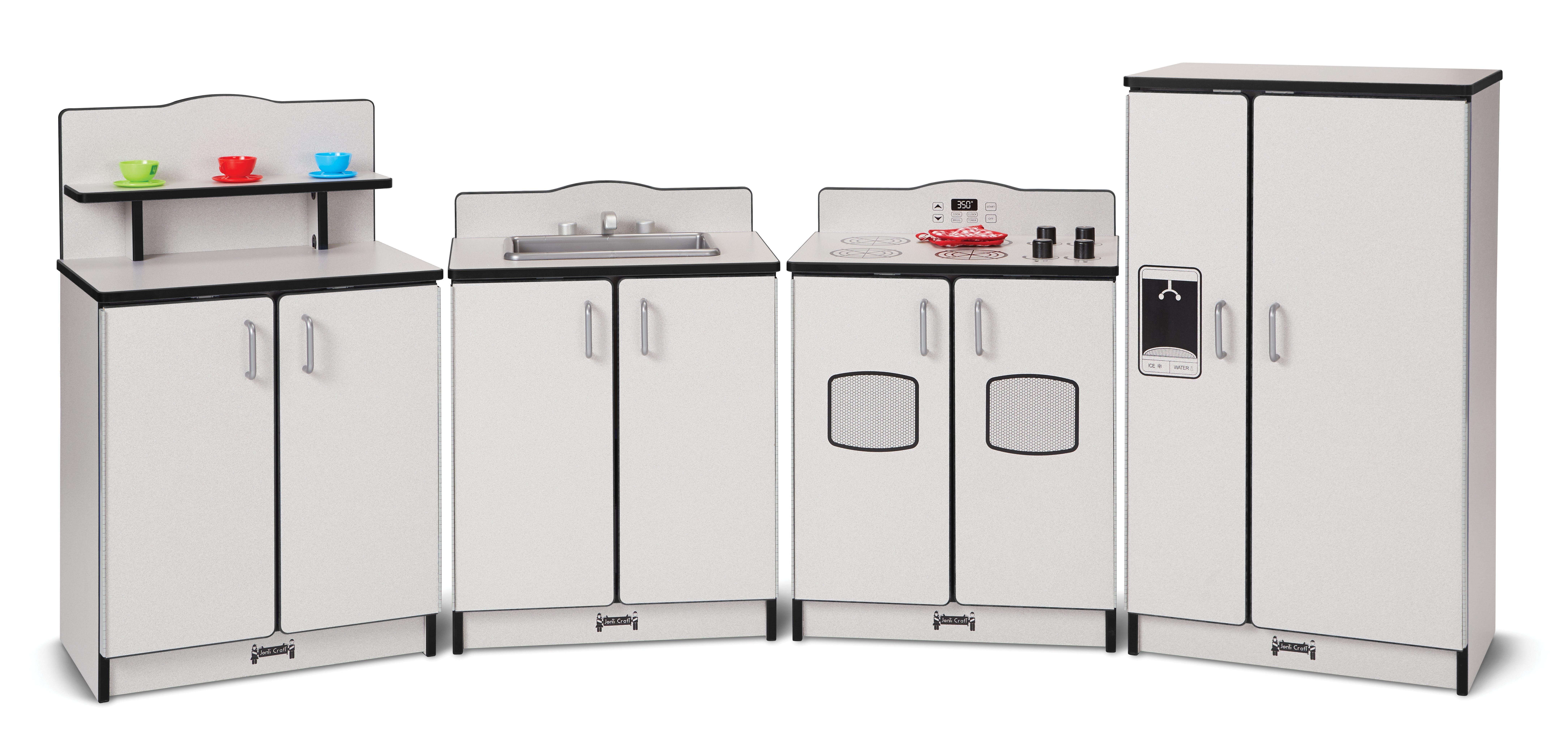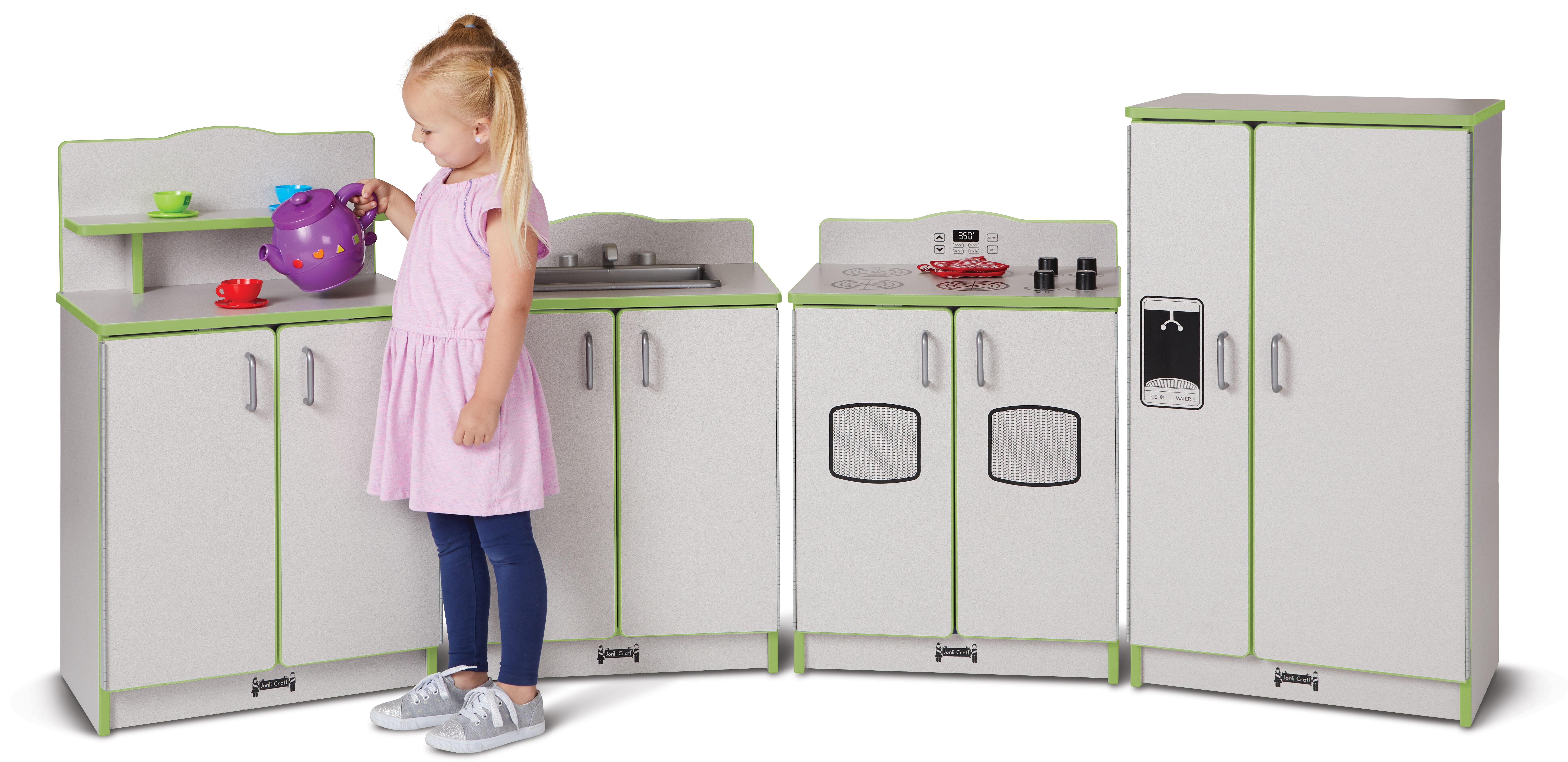 Jonti-Craft® Rainbow Accent Kitchen Set inspires creative roleplay for budding chefs to prepare gourmet meals. Mimic the motions necessary to fire up a four-course meal on the four-burner stove, grab vegetables from the refrigerator and freezer combo, or find the perfect spices from the cabinet storage. And don't forget to wash your hands and your vegetables before serving! Each unit features an interior shelf for storing play food and dishes. Available in black, blue, coastal blue, gray, key lime, navy, purple, and teal trim colors. When ordering, please select the trim color that best fits your space.Features