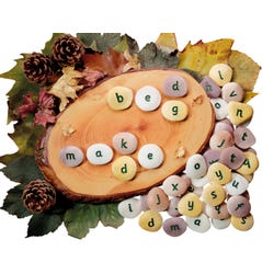 Invite children to explore word-building in a playful way with these tactile pebbles. Each pebble is engraved with a letter of the alphabet and the set includes the right combination of letters for children to make familiar words. Each pebble measures about 1 1/2 inches. Set of 50. Ages 3 and up.Features