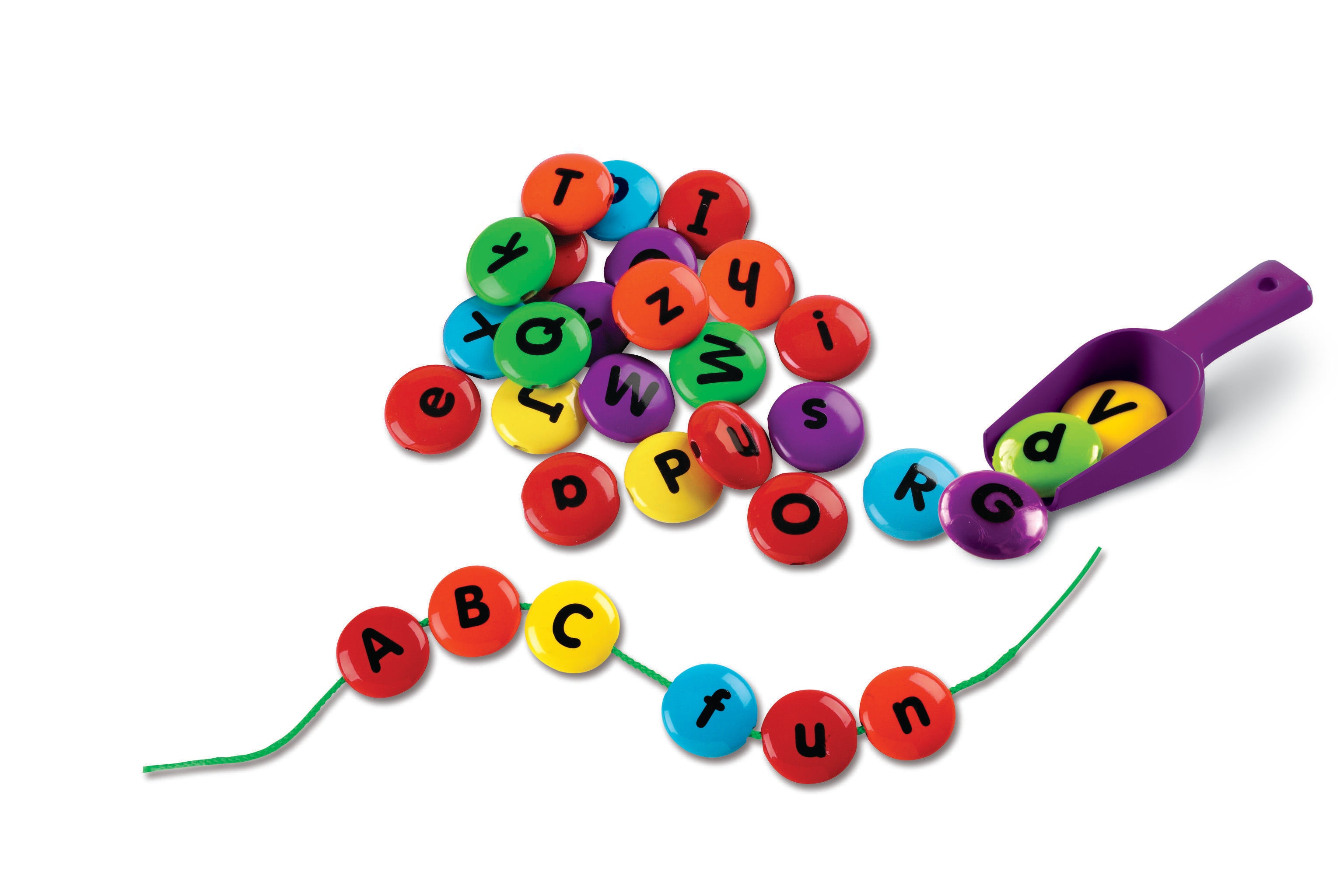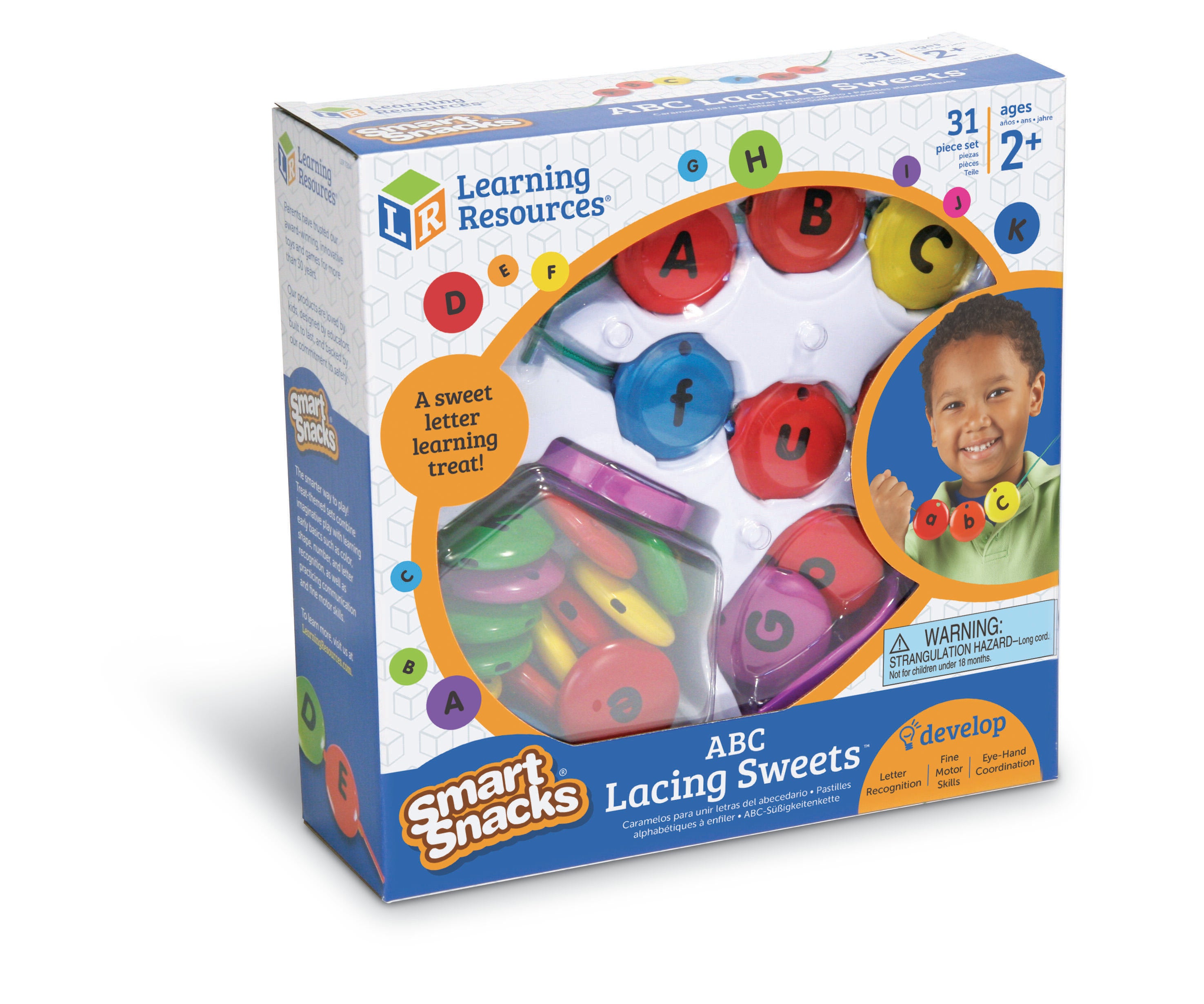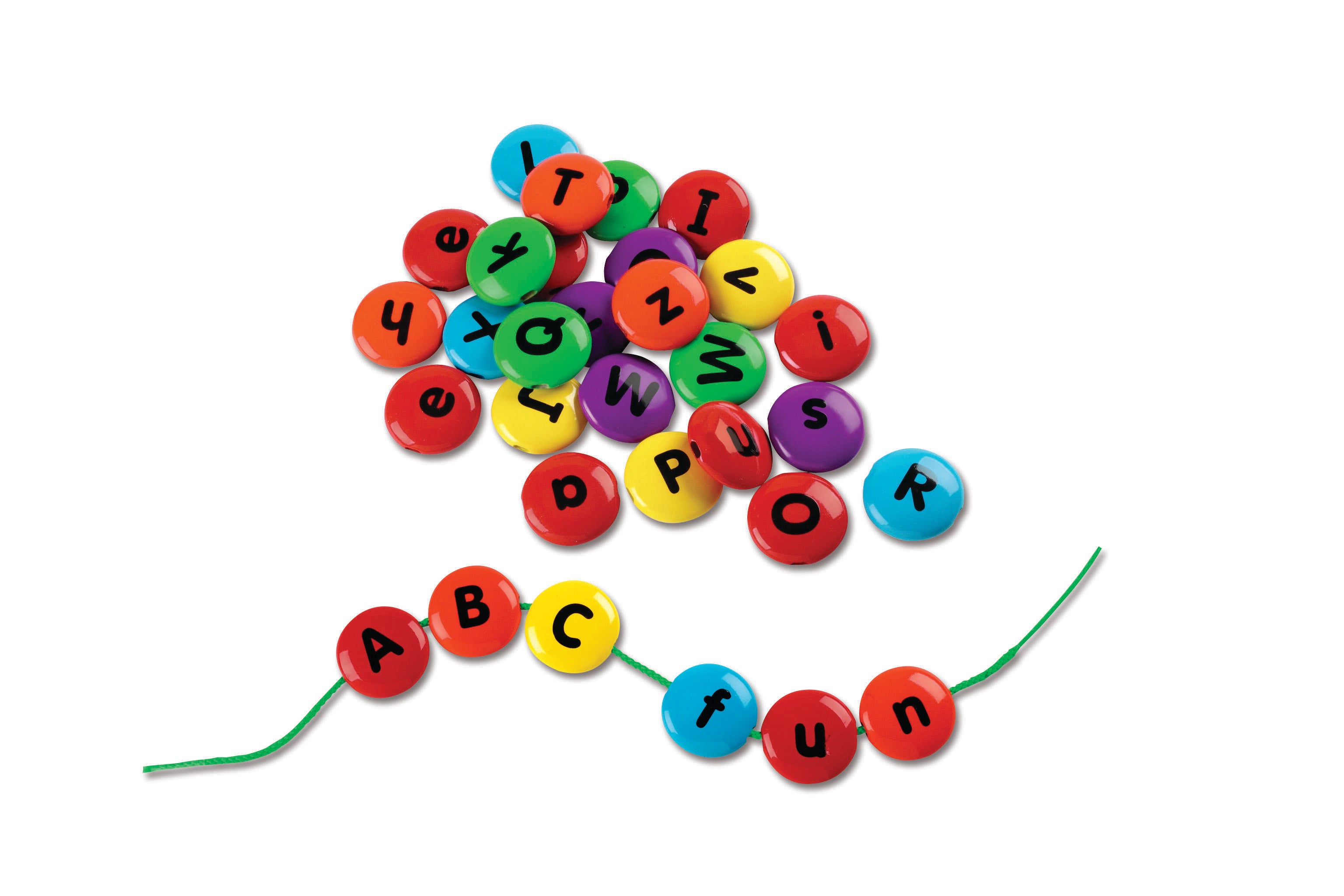 Description The Learning Resources Smart Snacks® ABC Lacing Sweets™ are a fun, hands-on way to build early language skills! Children can string lettered beads together to form words, match letters, group letter types, and much more. These 26 colorful beads have a double-sided design, with uppercase letters on one side and lowercase on the reverse. The set comes with two laces. The plastic beads measure 1-3/4 D inches, and come in a storage jar with snap on lid and scoop. Recommended for ages 2 and up.Features Have young children build words, spell names, identify letters, and a range of other activities that develop foundational language skills Helps build hand-eye coordination, fine motor control, and pincher strength Beads feature an intuitive color-coded design, with vowels in red and consonants in an assortment of bright colors Durable plastic material ensures lasting use and stands up to regular handling Great addition to learning materials in classrooms, childcare centers, and home-school environments Includes: