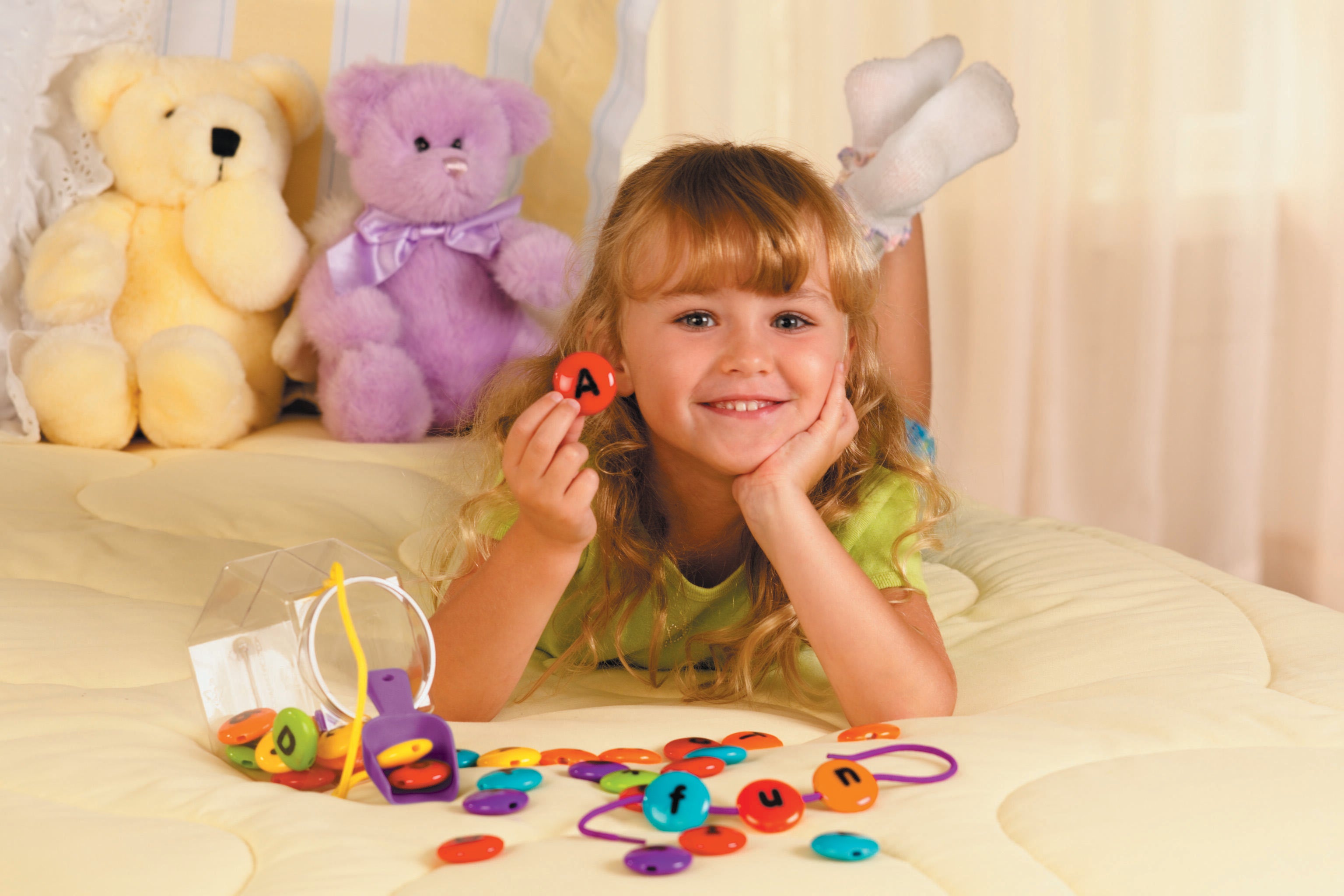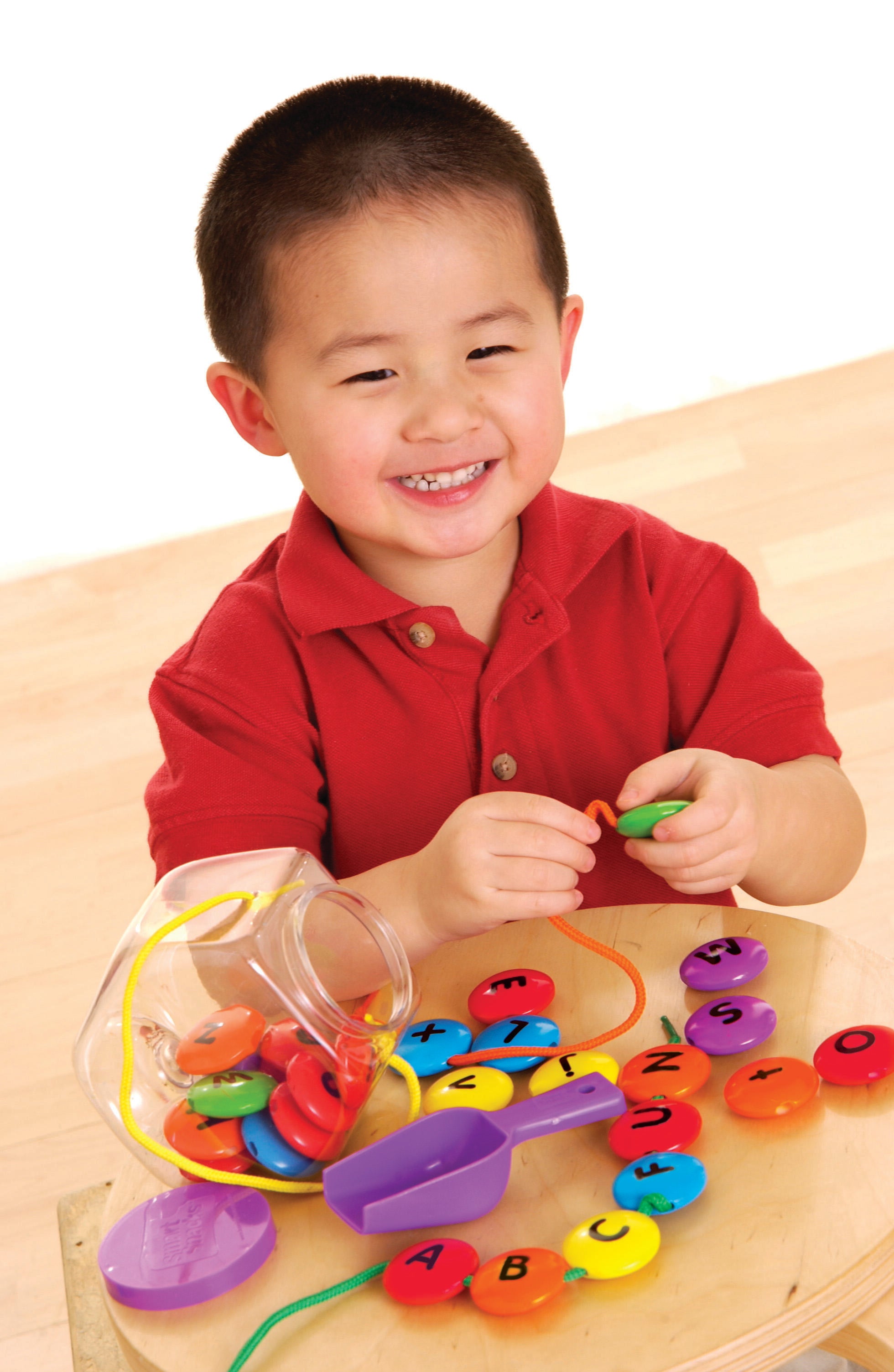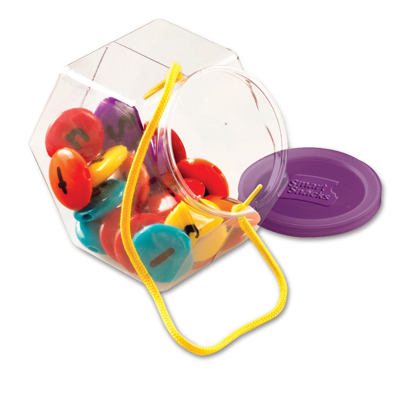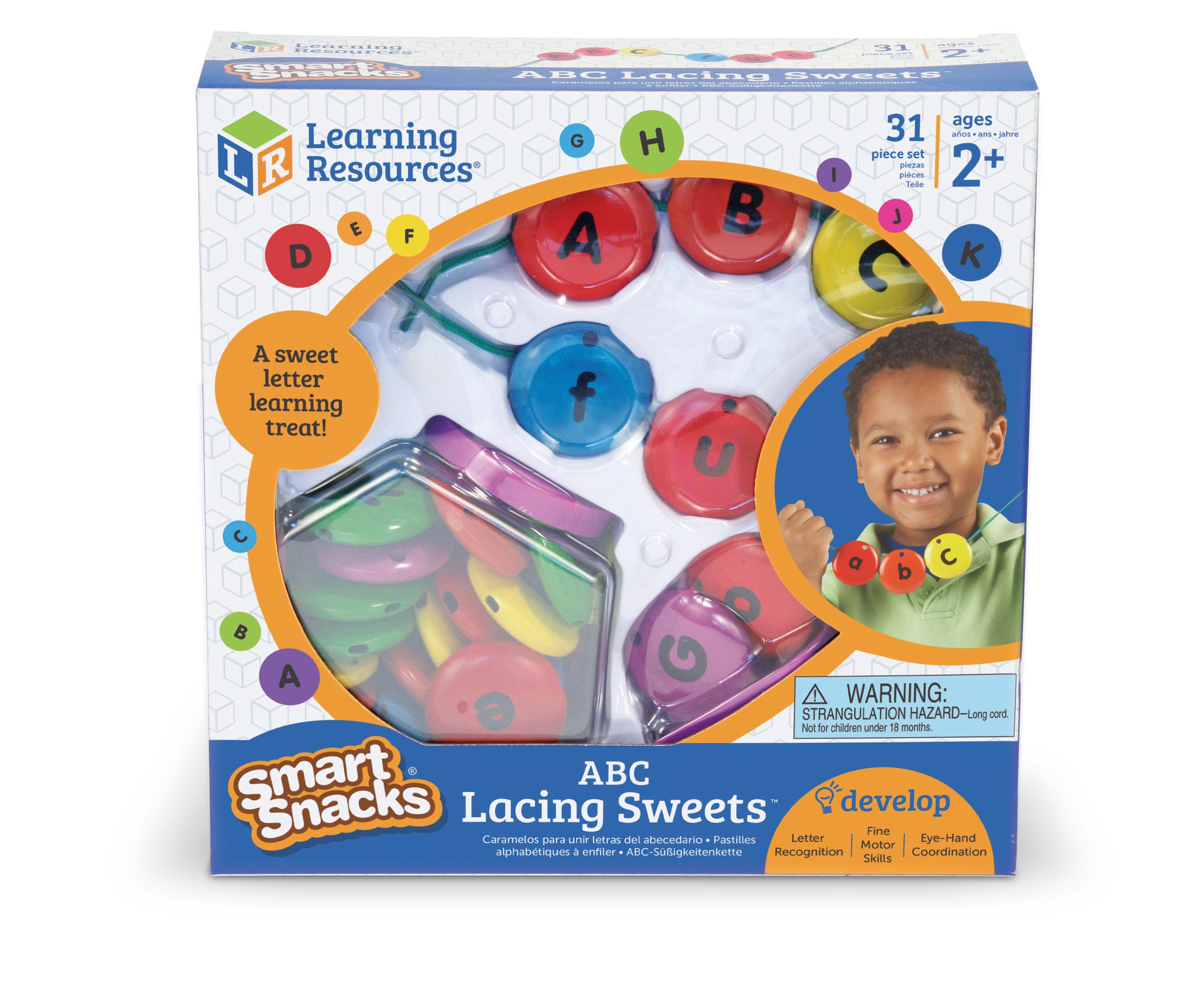 Description The Learning Resources Smart Snacks® ABC Lacing Sweets™ are a fun, hands-on way to build early language skills! Children can string lettered beads together to form words, match letters, group letter types, and much more. These 26 colorful beads have a double-sided design, with uppercase letters on one side and lowercase on the reverse. The set comes with two laces. The plastic beads measure 1-3/4 D inches, and come in a storage jar with snap on lid and scoop. Recommended for ages 2 and up.Features Have young children build words, spell names, identify letters, and a range of other activities that develop foundational language skills Helps build hand-eye coordination, fine motor control, and pincher strength Beads feature an intuitive color-coded design, with vowels in red and consonants in an assortment of bright colors Durable plastic material ensures lasting use and stands up to regular handling Great addition to learning materials in classrooms, childcare centers, and home-school environments Includes: