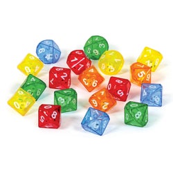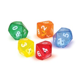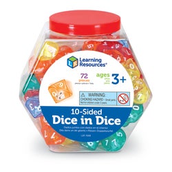 Ten-Sided Dice in Dice are ideal for teaching probability, predicting numerical outcomes, and tracking the statistical results of repeated rolls. Each transparent, colored die measures 1 inch and includes a smaller white die inside. Set includes 72 dice along with a solid hexagonal tub for quick clean-up. Ages 6 and up.Features
