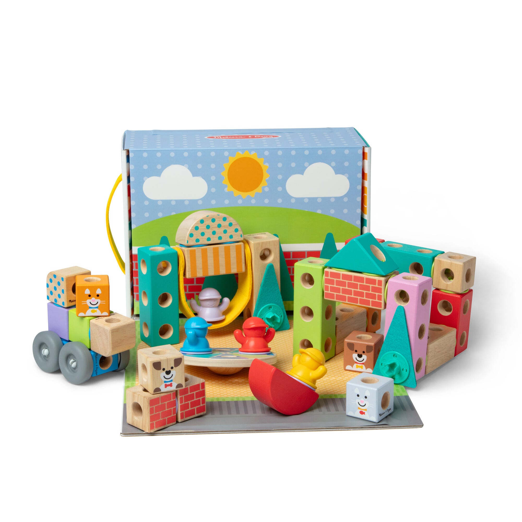 Melissa & Doug Blockables are the perfect manipulative for your playroom, preschool, childcare center, or anywhere children build and gather. These solid wood connect-and-play building blocks are the perfect manipulatives to build out imaginations and create fun in any space. This Town Play Set is the perfect tool to develop skills like fine motor skills, problem-solving skills, matching, and storytelling, all while building self-esteem through self-guided play. An illustrated guide shows how to arrange and link the Blockables to create unique towns using pieces resembling swings, rockers, carousels, vehicles, pets, buildings, and more. Children can also use their imaginations to mix, match, and combine pieces to make unique figures and play their own way! This 73-piece Town Play Set is compatible with all other Blockables play sets. Patent pending.Features