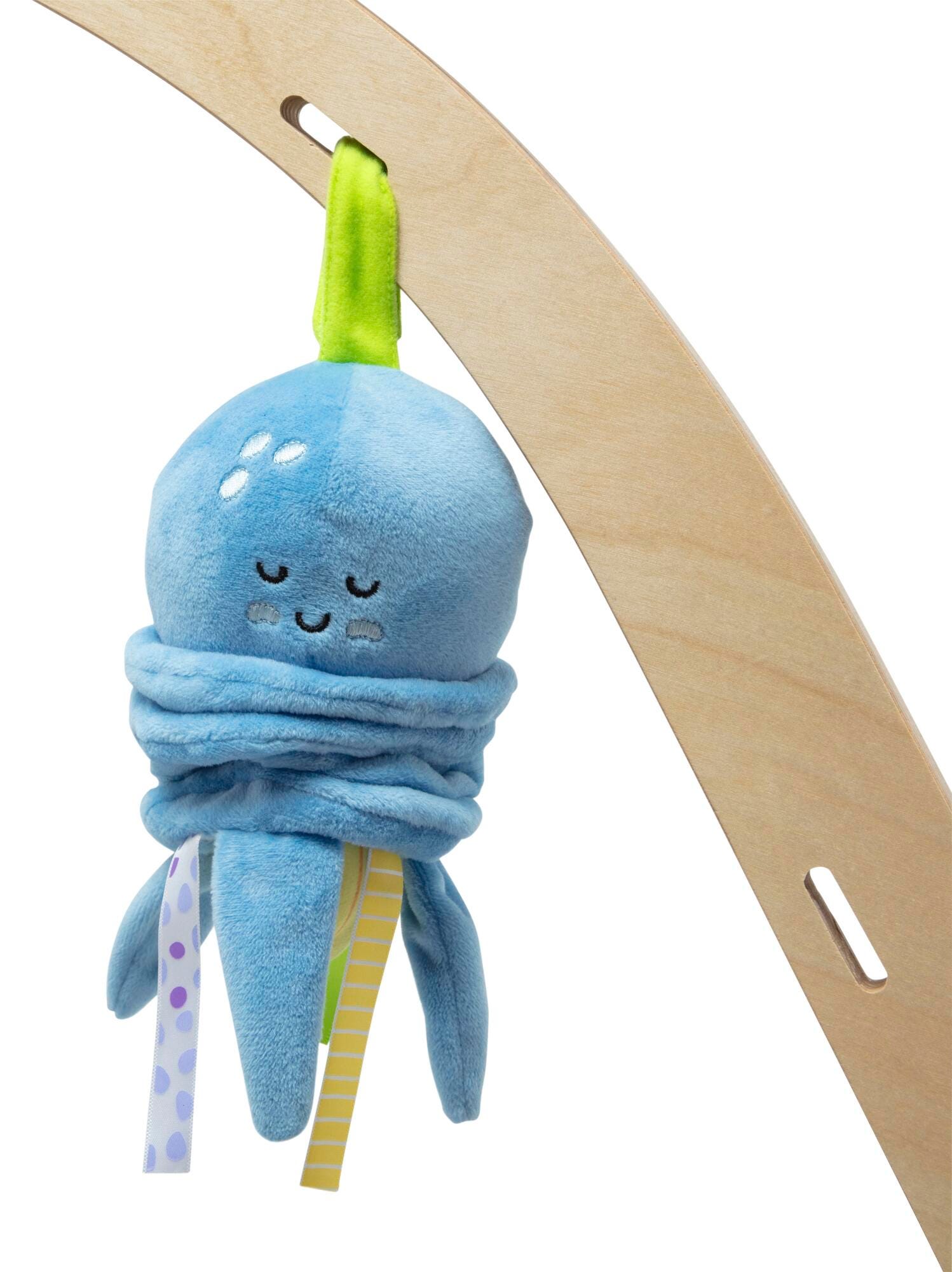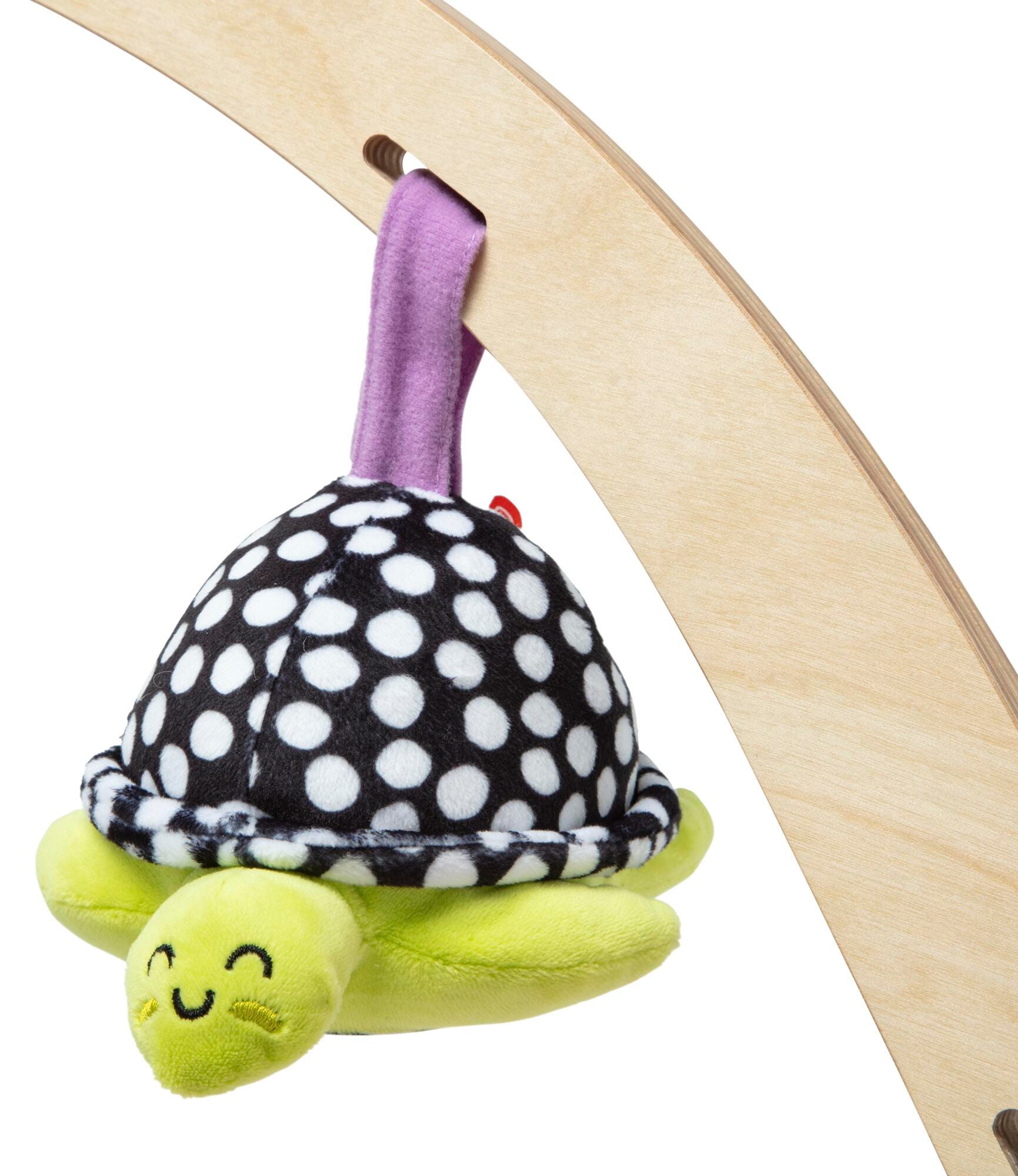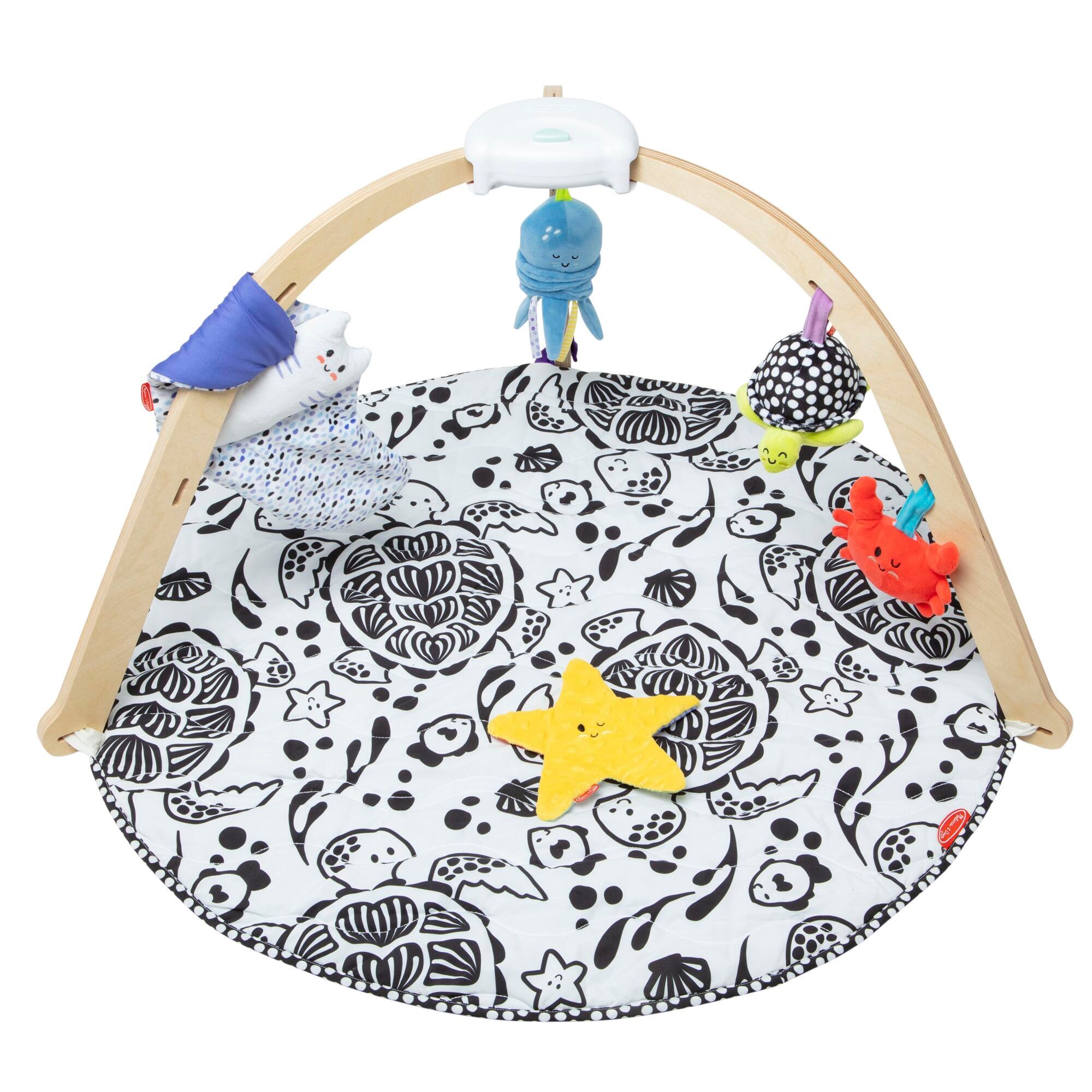 Perfect for infants and toddlers who need an engaging mat in the playroom or on the go - equipped with built-in child-safe mirror, a multi-textured sea star, a squeaking crab, and much more to inspire tactile play and fine motor development. This ocean-inspired Easy-Fold Play Gym is equipped with Quick-Close storage for simple transportation and is thoughtfully designed to guide babies from birth to 9 months through multiple developmental stages. Sturdy, wide wooden arches are pre-assembled for easy set-up and offer caregivers easy access and monitoring. Comfortable, reversible play mat is equipped with sensory ribbons and a crinkling peek-a-boo clam shell. One side of the mat features high-contrast black-and-white graphics for early visual stimulation, and the other includes a full-color ocean scene to keep older babies engaged as vision develops. Measures 29-1/2 L x 9-1/2 D x 6-2/5 H inches.Features