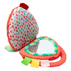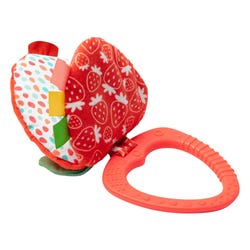 Sensory stimulation meets adorable clip-on on-the-go teething ring - a portable entertainment center that's designed to engage and inspire without turning on a screen. This soft plush berry has crinkle leaves for interesting sensory exploration and sound play, with smooth ribbon tabs that are easy for small hands to grasp, shake, and squeeze. Open the berry slice to reveal a peek-a-boo mirror and a silicone teething ring to surprise and delight. Multi-patterned fabric is textured to tempt tiny fingers to touch! Bring the fun wherever baby goes - easily clip the three-piece, multi-textured toy onto a stroller, car seat, diaper bag, or high chair to keep it close at hand. Perfect for infants newborn to 1 year old.Features