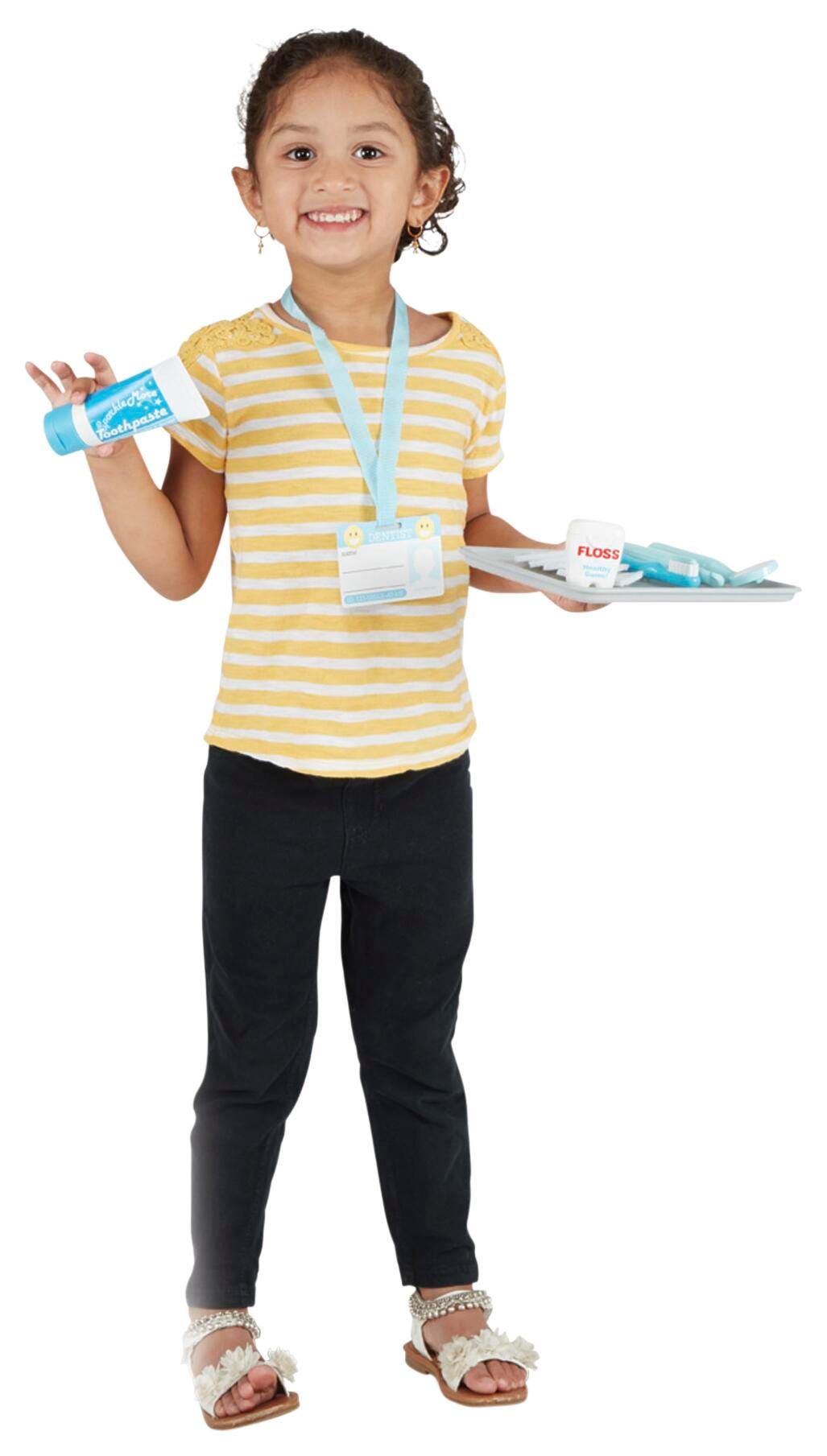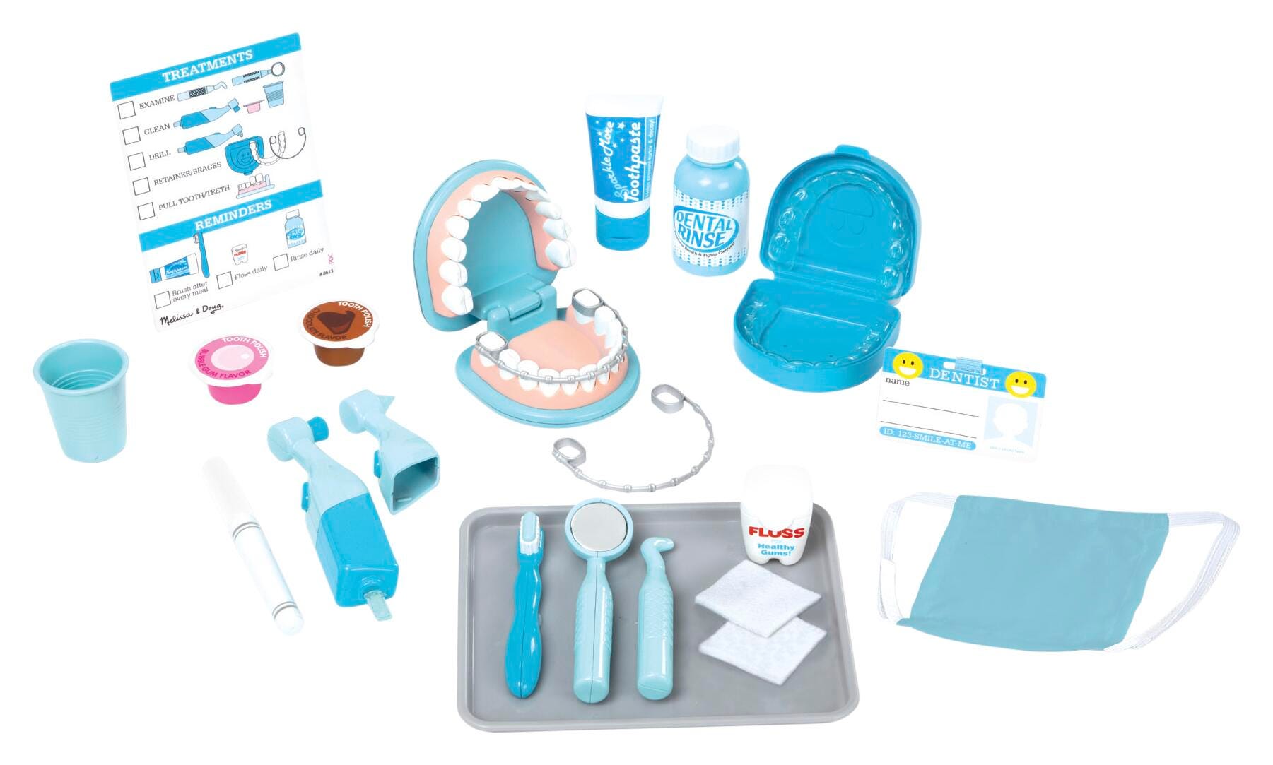- Includes set of pretend teeth, dry-erase marker, examination tools, toothbrush, toothpaste tube, dental rinse bottle and cup, 2 gauze pads, 3 tooth polish cups, top and bottom retainers and braces, mask, reusable ID tag on a lanyard, double-sided reusable activity card