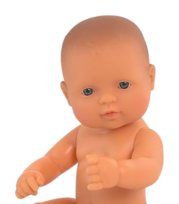 This anatomically correct baby doll by Miniland features detailed facial features, soft stitched-on faux hair, articulated arms, legs, and a neck, making it easy to switch apparel pieces on or off. Each soft, flexible vinyl doll is lightly vanilla-scented and can be washed and bathed! It comes with an undershirt and underpants, additional clothing is sold separately. This doll stands 12 and 5/8 inches high.Features