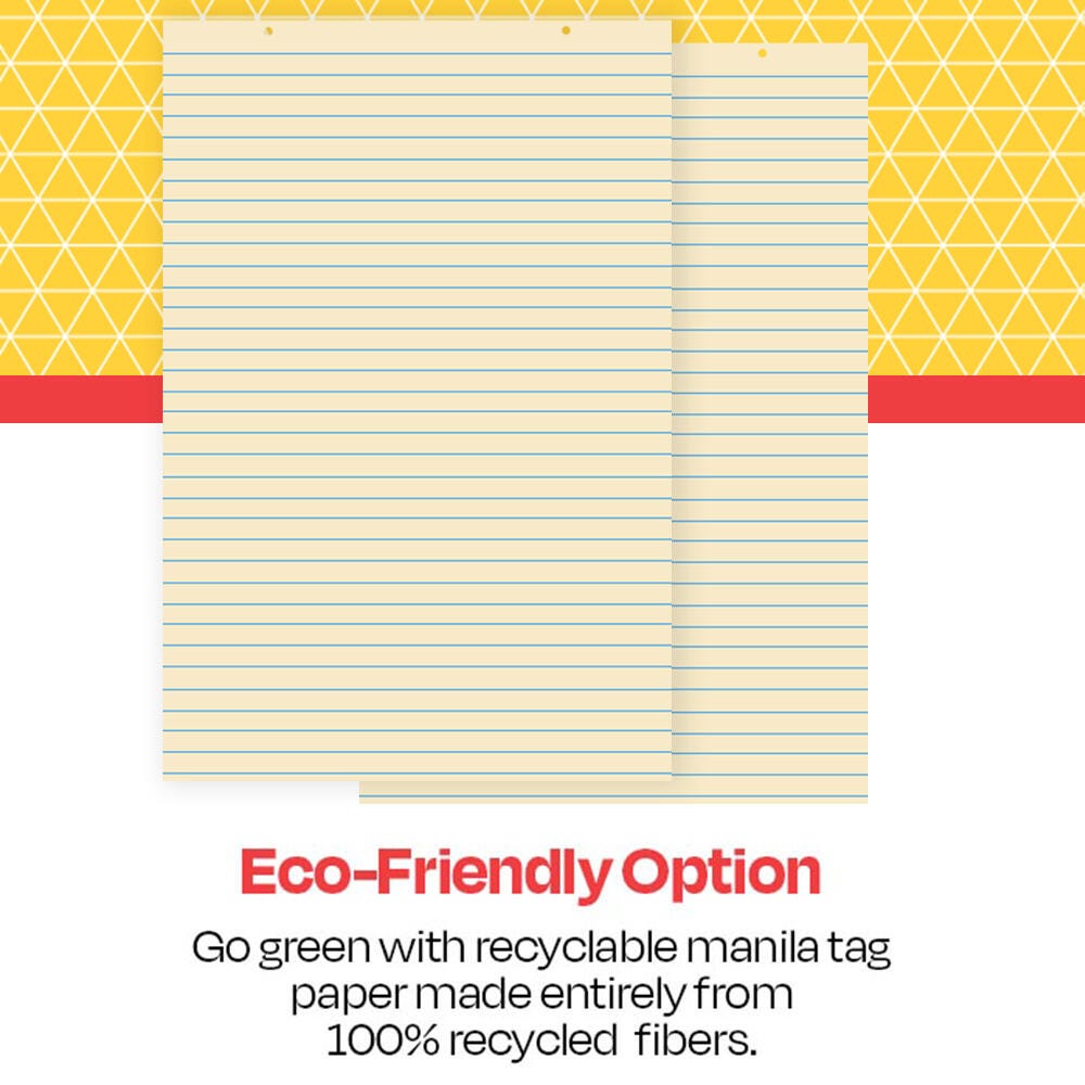 Description Take lesson plans and handwriting practice to the next level with the School Smart Manila Tag Chart Paper. The sturdy, buff-colored design has a 15 lb. basis weight that prevents common bleed-throughs from markers or pens, and features ruled lines (short way) on both sides for double the writing surface. Measurements include a 1 inch ruling and a 3/4 inch guideline. Two small punched holes at the top make it easy to hang on teacher easels or bulletin boards. The full manila chart includes 36 double-sided ruled sheets with each sheet measuring 36 x 24 inches. Recommended for Grades K to 3.