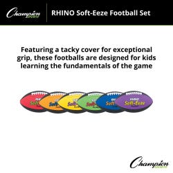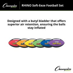 The RHINO® Skin Soft EEZE Footballs from Champion Sports are perfect for introducing young athletes to the sport of football. These balls feature the exclusive non-sting RHINO Skin coating and a rubber/butyl bladder for superior air retention. The tear-proof footballs offer a soft and tacky, and stylish classic design. This set includes 6 footballs, one each in red, green, yellow, orange, blue, and purple.Features