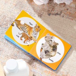 Little ones will go wild when they discover these animal families! See the pictures, name the wild animals and their babies, and poke the irresistible buttons on every page to hear satisfying “clicks” and “pops.” This sturdy 10-page interactive board book invites children to pop along as they explore full-color photographs of adorable wild animals and their babies (a panda and cub, kangaroo and joey, hippo and calf, etc.). Poke-a-Dot® books help encourage language development, animal recognition, and fine motor skills.Features