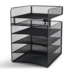 Hanging organizer provides easily accessible desktop storage whether you are sitting or standing at your desk. It prevents you from excessive bending or reaching to access your storage. Hanging organizer fits up to 1-3/4 inch thick desktop and secures with a hex key clamp (hardware included). Steel mesh construction features a durable, black powder coat finish. Hanging storage includes five horizontal sections with a built in accessory tray. Each section is designed to hold not only your active papers and notes but standard size file folders.