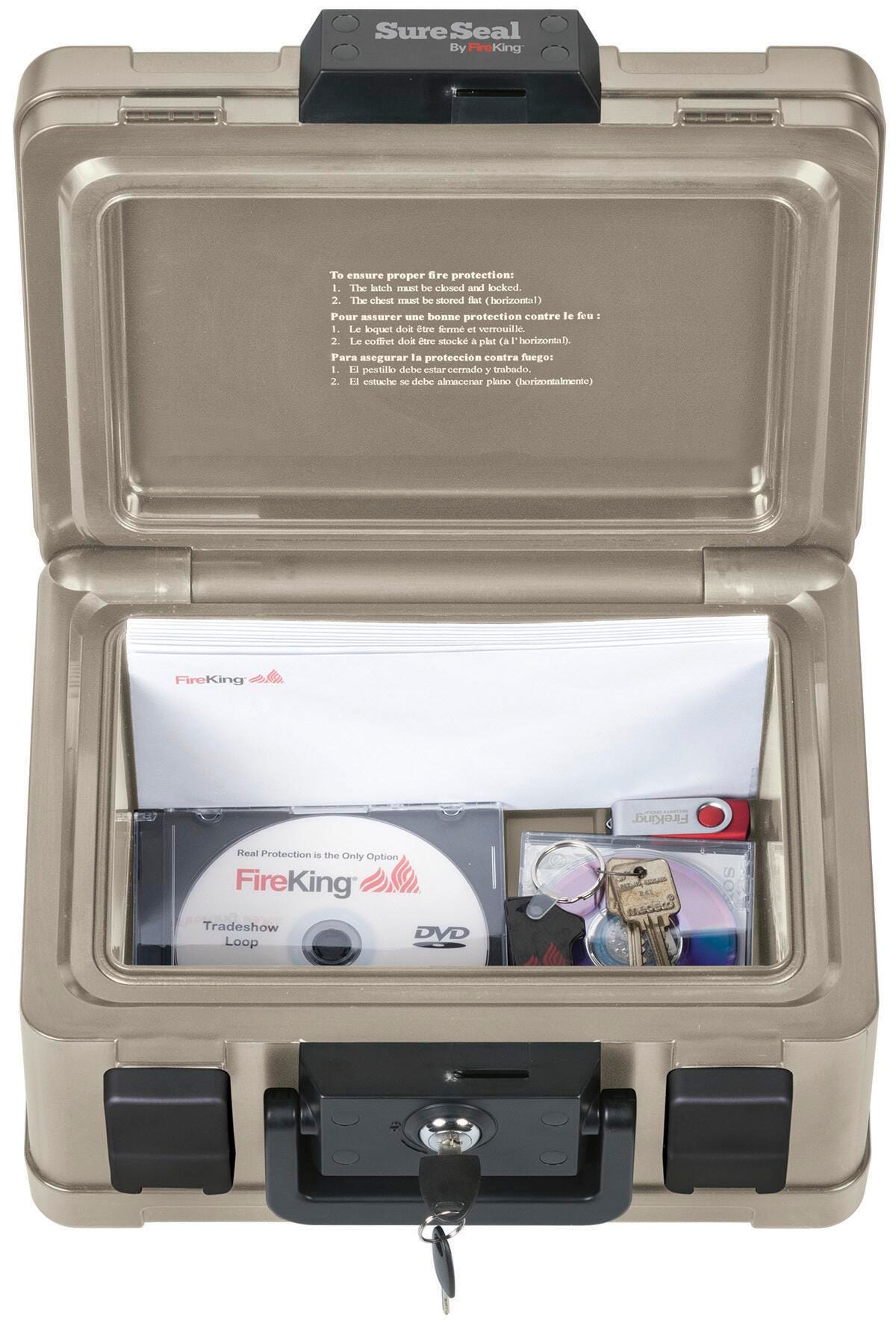 FireKing SureSeal Taupe Fire Chest measuring 12-3/16 W x9-13/16 D x 7-5/16 H inches features dual compression latches and key lock. Chest is perfect for protecting paper documents as well as digital media from fire and water. Fire resistant chest is waterproof till 1 m deep for a minimum of 48 hrs.