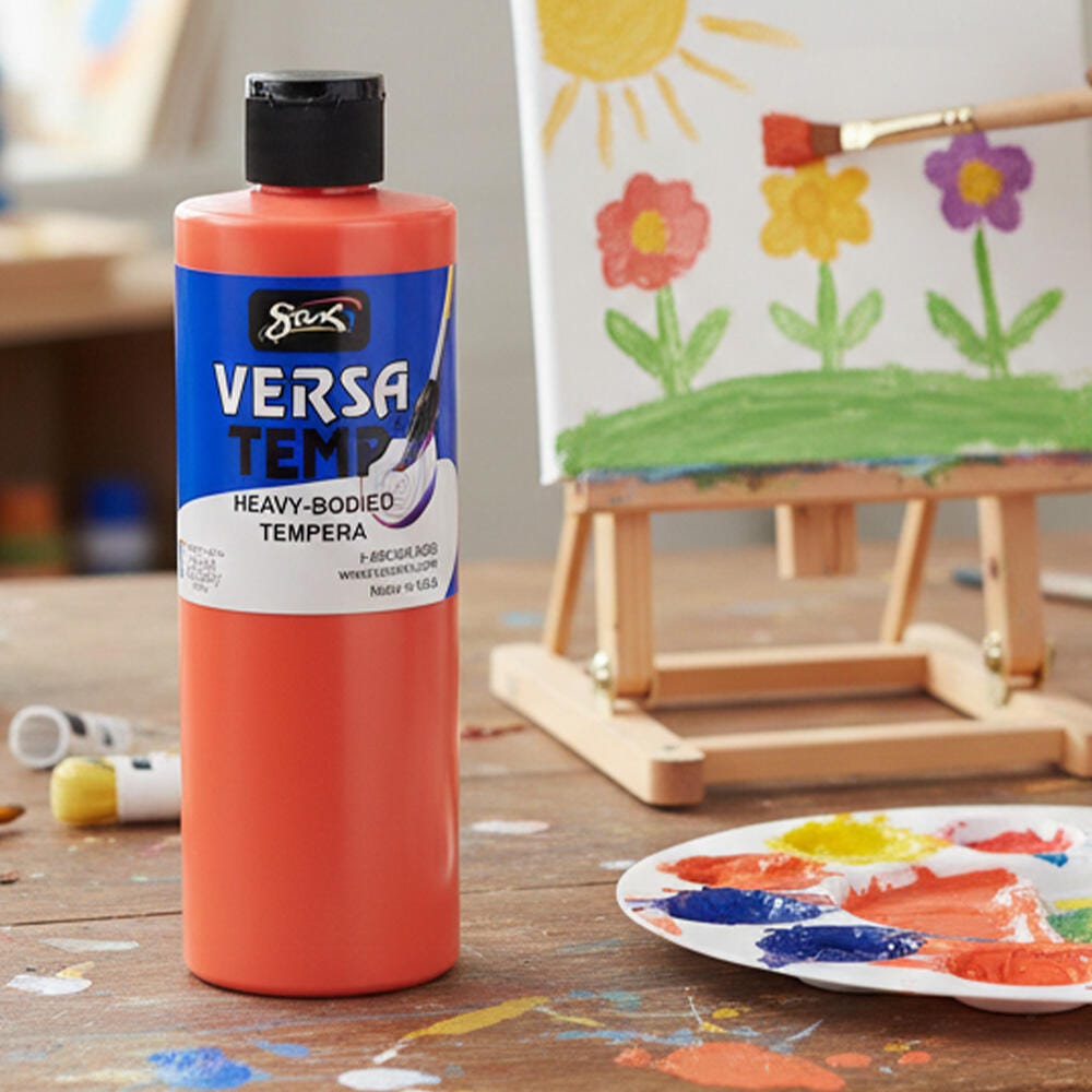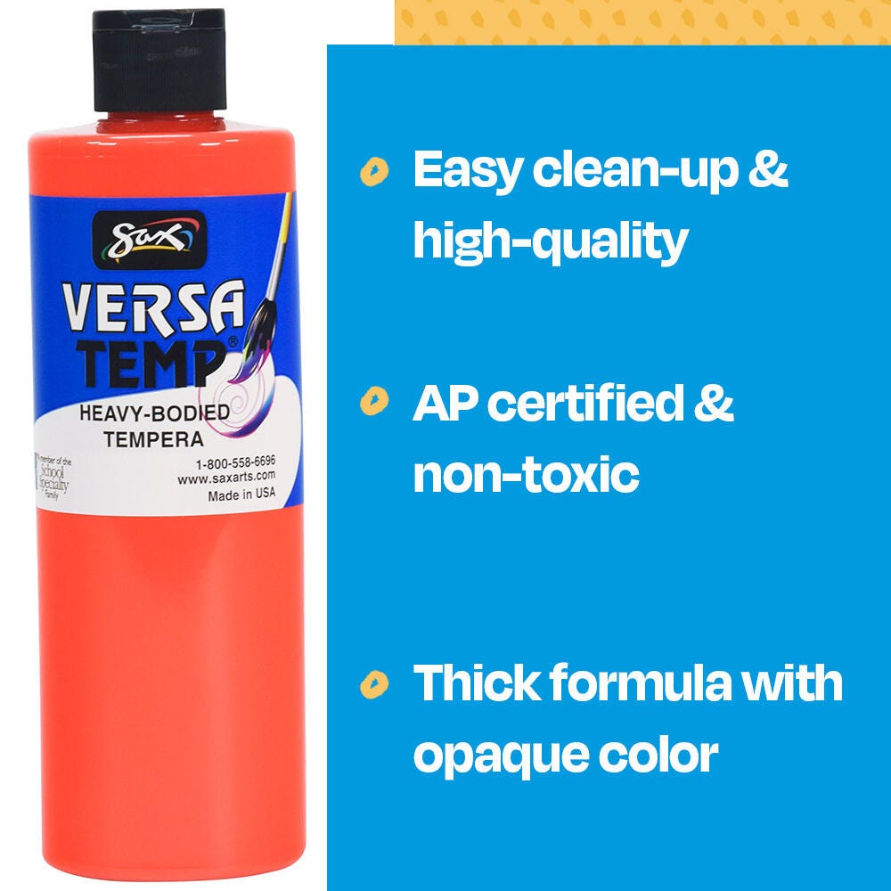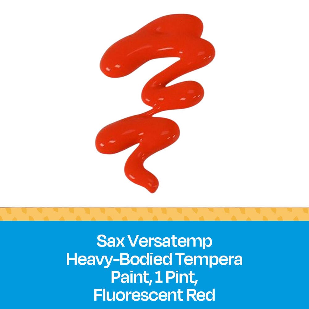 Description Sax Versatemp heavy-bodied tempera paint in fluorescent red produces bold, vibrant results. Foster creativity with a paint that resists cracking and chipping. The convenient pint bottle is easy to pour and store, and is perfect for sharing in the classroom. Complete art projects, posters, and signs that stand out with one shade or craft new hues by mixing. The heavy formula is easy to apply and mix.