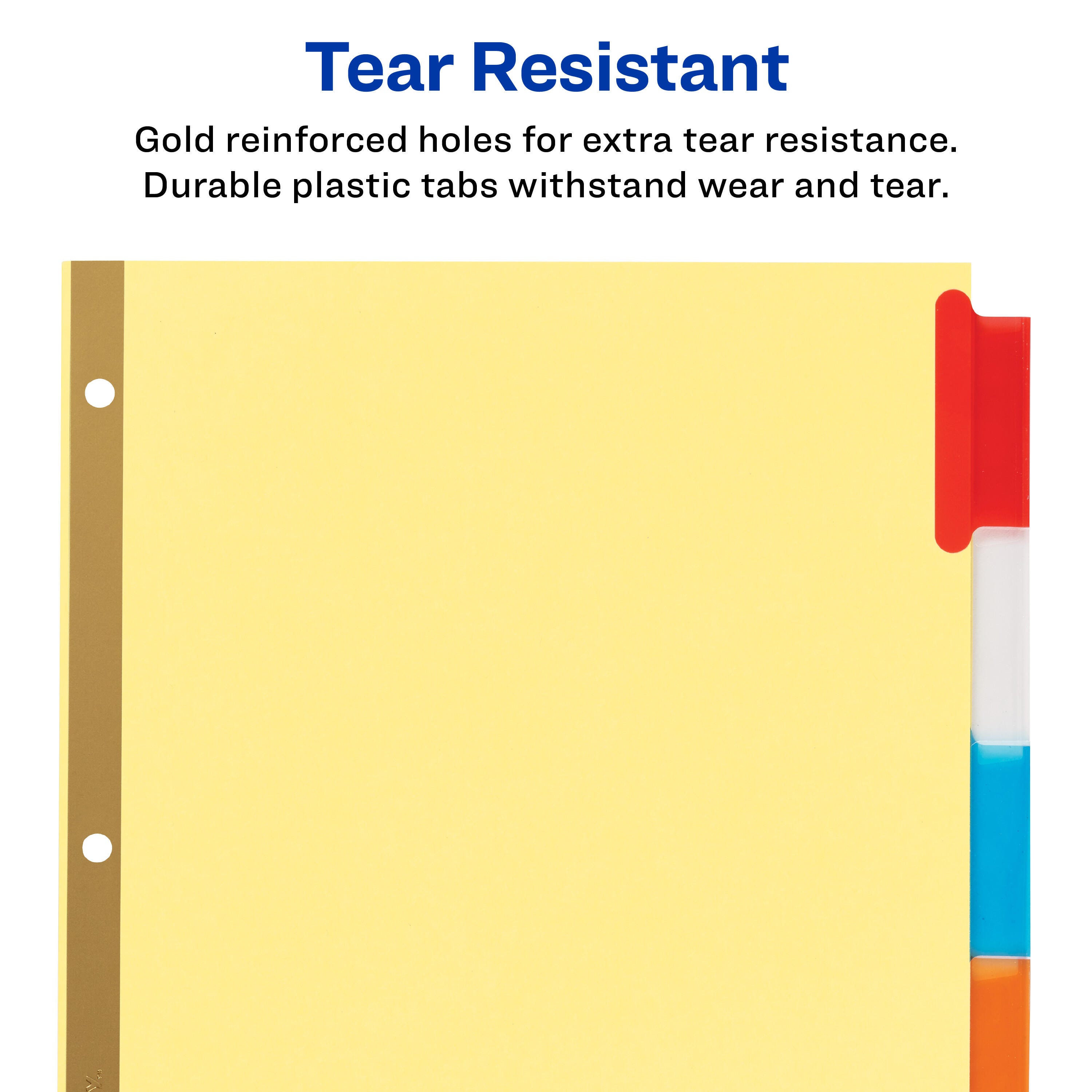 Double-sided gold reinforced holes provide extra rip-resistant durability to paper folder dividers