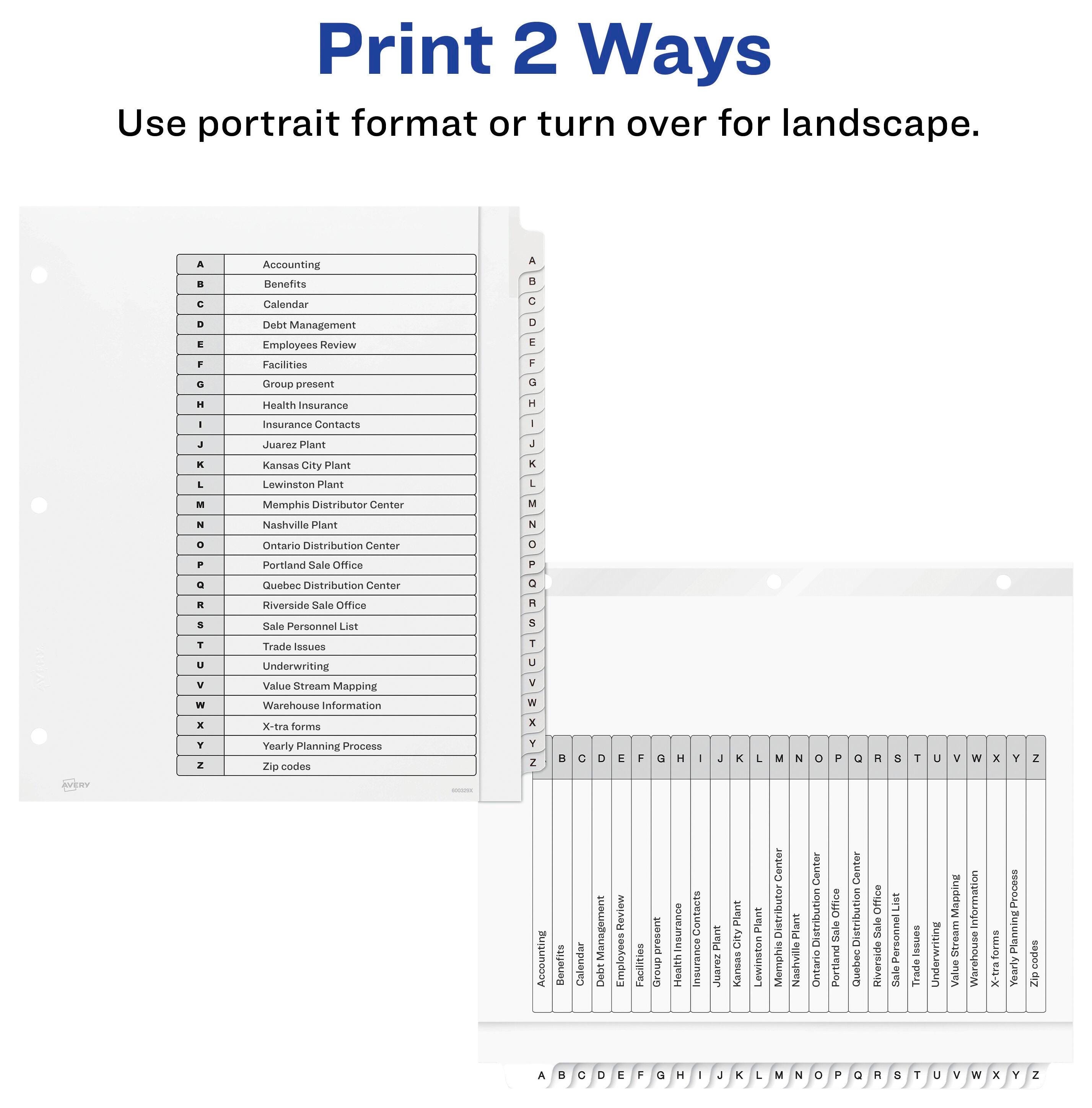 Coordinated divider system makes referencing easy and delivers a professional look. The set includes a reinforced Table of Contents page, matching preprinted tab dividers in black/white, added tab reinforcement, double-sided hole reinforcement on tabbed dividers and paper made of heavy stock. 2-in-1 tab design lets you pick between portrait and landscape formats. Simply print the section titles onto the Table of Contents page using your inkjet or laser printer. Tab dividers are also compatible with typewriters and copiers. Dividers are three-hole punched for use in binders. Avery offers many easy-to-use templates for Microsoft Word and other popular software programs.