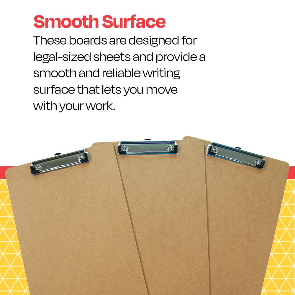 School Smart clipboards provide a smooth and reliable work surface wherever you need it! These practical masonite clipboards measure 9 x 15-1/2 inches and are designed to be used with legal-size paper. Each board has a low-profile clip that holds up to 100 sheets of paper, so you can comfortably tackle almost any task. This pack includes 3 clipboards.