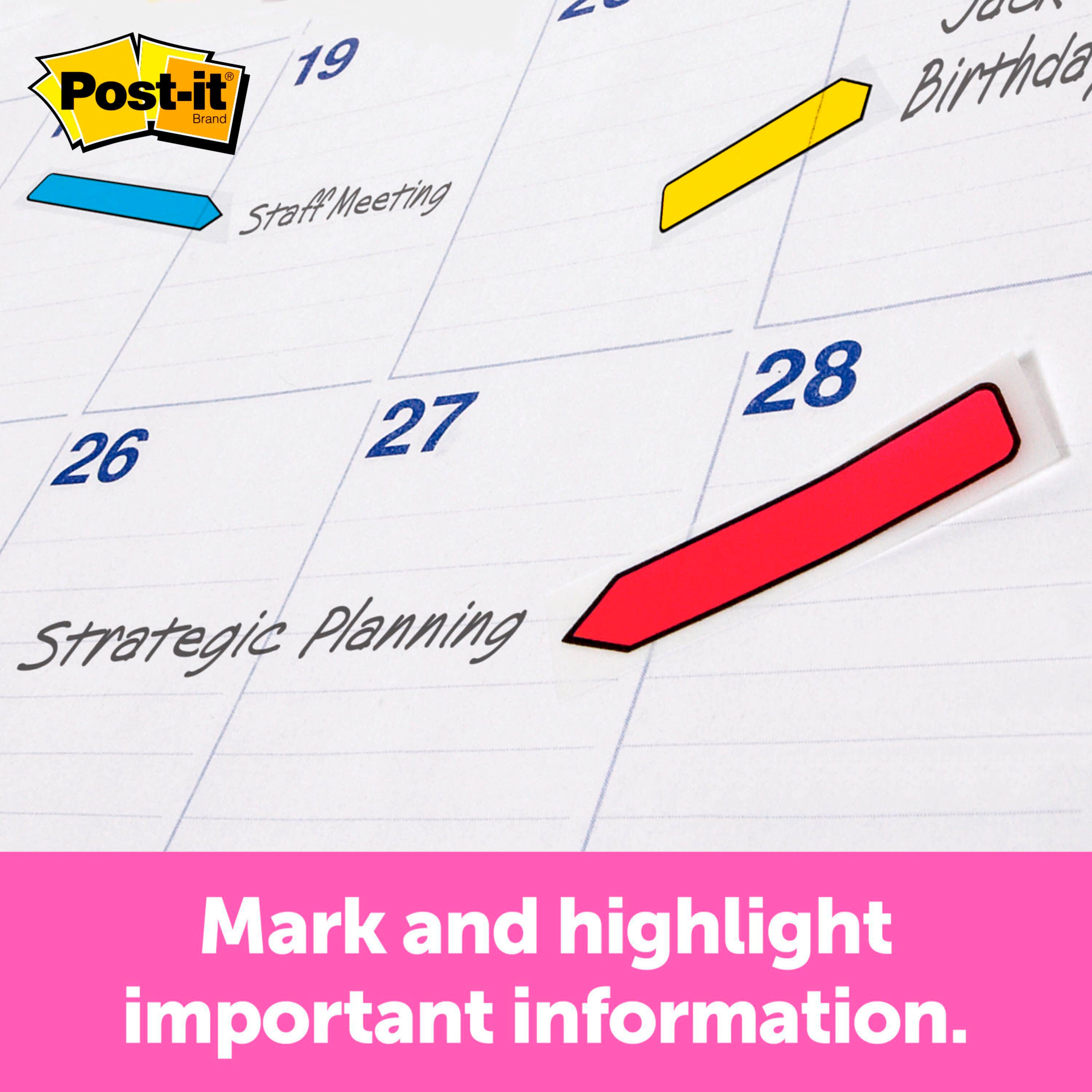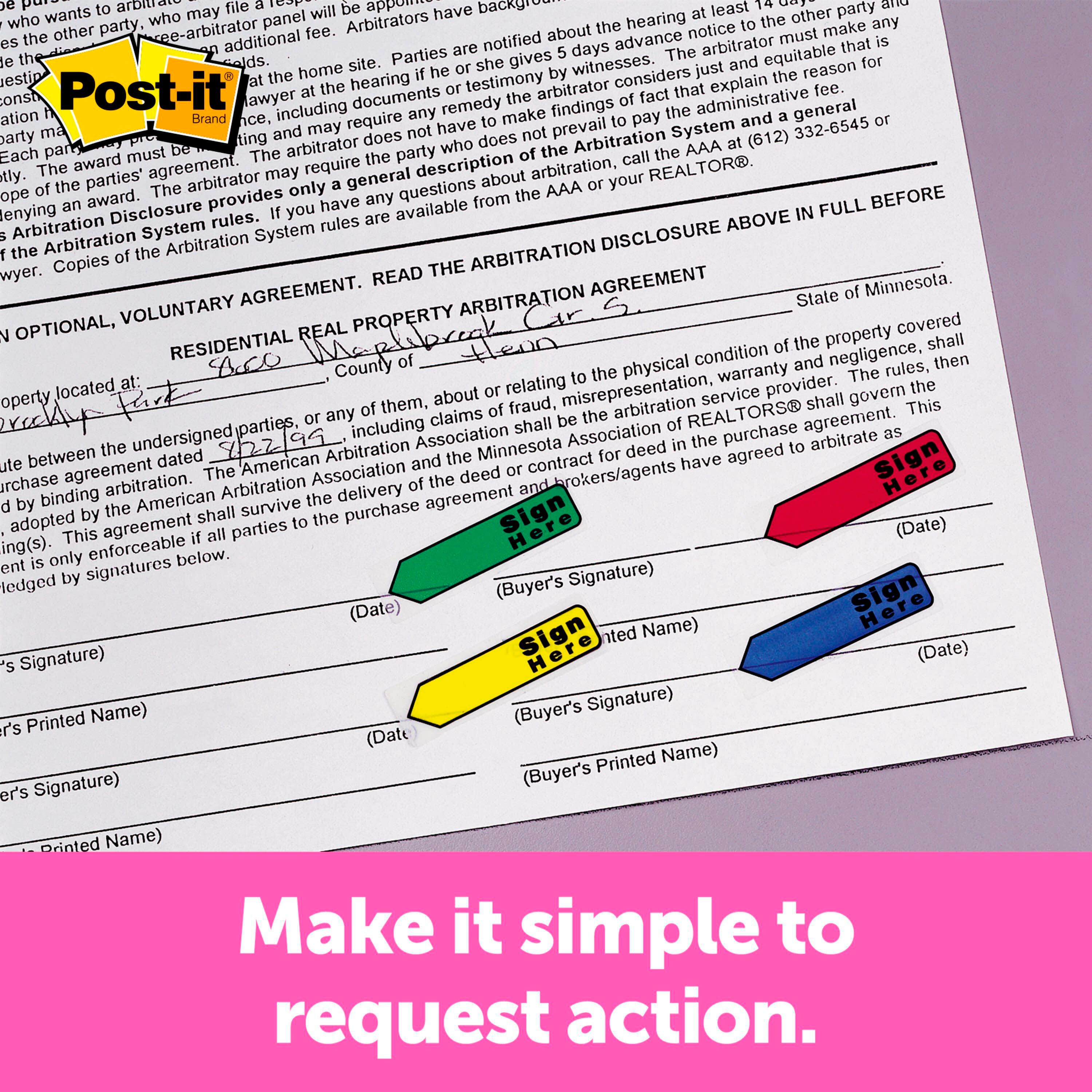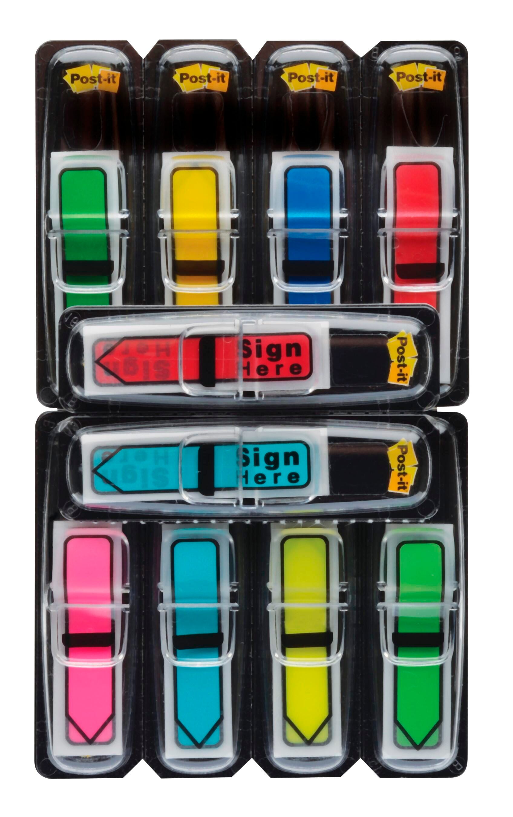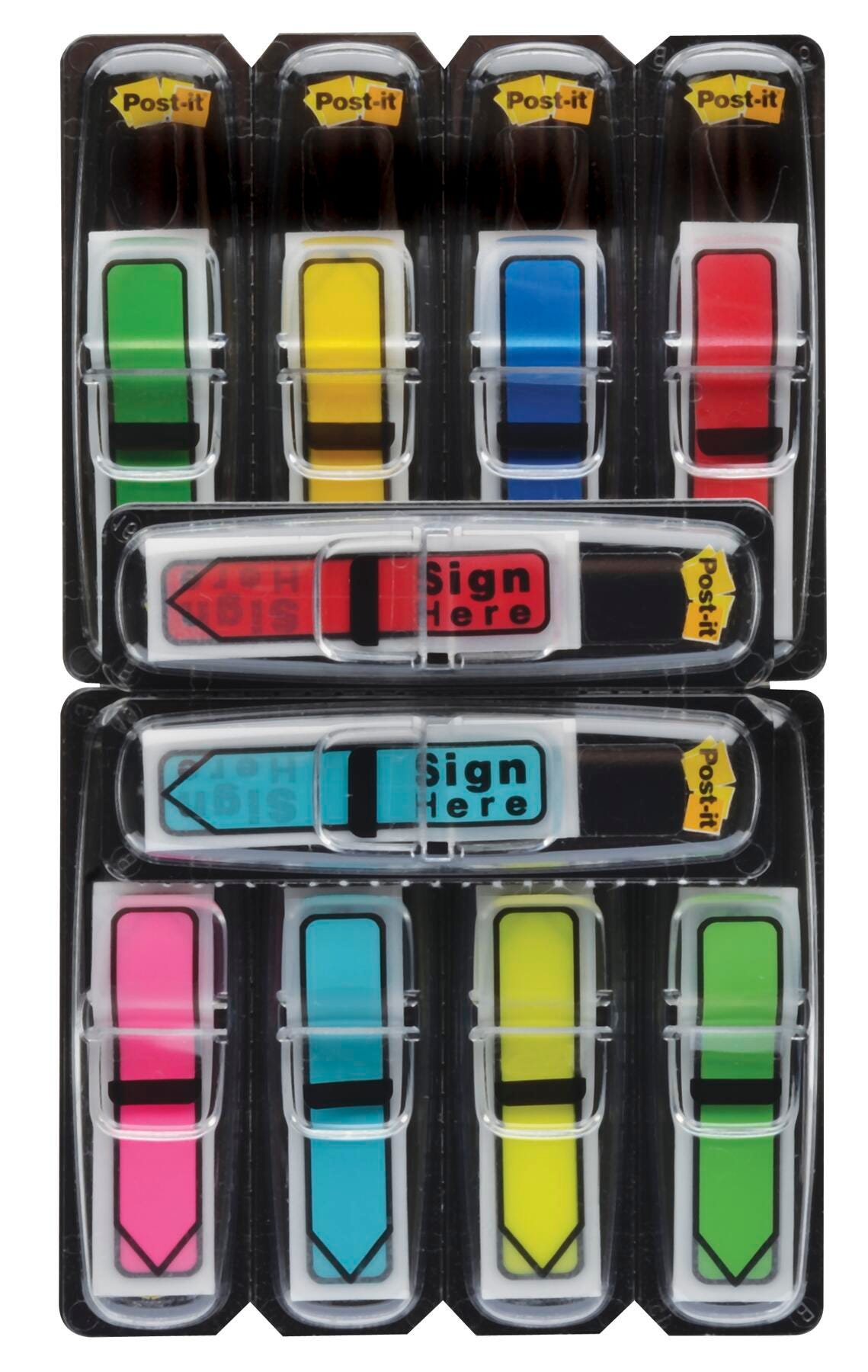 Description The Post-it Arrow Flags Value Pack includes 8 different colors of 1/2 inch wide arrow flags. There are 24 of each color plus an additional 60 "Sign Here" flags in two colors. Flags stick securely for long-lasting use. The dispenser keeps flags organized and easy to find.Features The dispenser keeps flags organized and easy to find Keeps notes on your desktop at your fingertips Use "sign Here" flags to highlight where signatures are needed in a document Created with durable, reliable materials