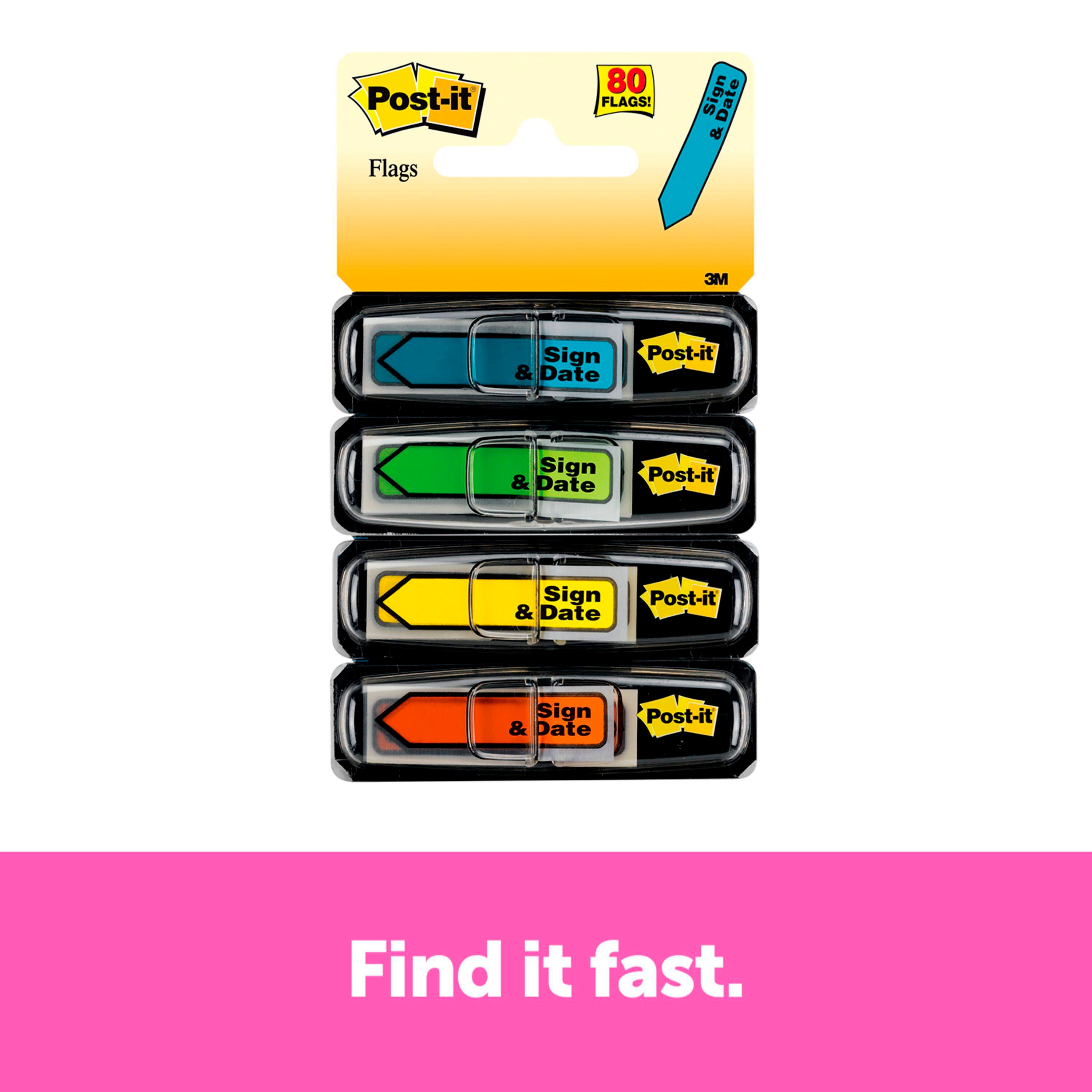Post-it 'Sign & Date' Message Flags, 1/2 x 1-7/10 Inches, Blue, Lime, Yellow, Orange, 20 Flags per Color, Pack of 80