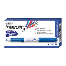 BIC Intensity Low Odor Dry Erase Fine Tip Markers bring your ideas to life in bold, easy-to-erase ink. These dry-erase markers feature an ergonomic barrel with a rubberized grip for enhanced writing comfort and control. They feature blue ink that is low-odor and nontoxic, excellent for brainstorming and presenting in classrooms and offices. Each marker features a fine tip that delivers consistent, thin lines that are great for detailed writing and drawing. The high-quality ink wipes away with minimal smudging and smearing on whiteboards, glass, and other non-porous surfaces. This pack contains 12 blue dry-erase markers.