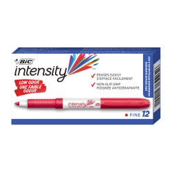 These BIC Intensity Low Odor Dry Erase Fine Tip Markers offer lasting comfort and performance to help you bring your ideas to life! They feature an ergonomic barrel with a rubberized grip for enhanced writing comfort and control. The premium ink formula is low-odor and nontoxic, excellent for brainstorming and presenting in classrooms or offices. These markers feature a fine tip that delivers consistent, thin lines that are great for detailed writing and drawing. The high-quality ink wipes away with minimal smudging and smearing on whiteboards, glass, and other non-porous surfaces. This pack contains 12 red dry-erase markers.Features