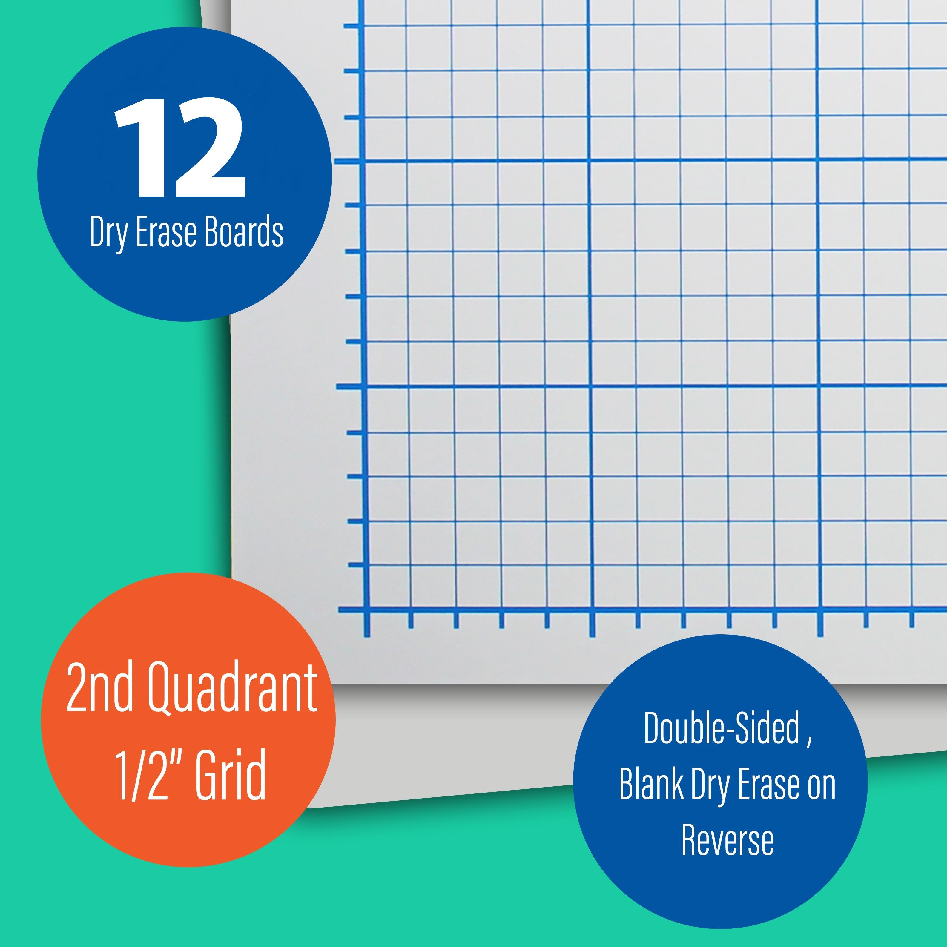 Quadrant Grid Dry Erase Board is ideal for bar graphs, line graphs, pictographs and more! Two-sided board features a 15 row by 20 column grid of 1/2 inch squares in Blue on white surface. Bold lines marking every 5th row or column help students stay organized while learning to graph. Back side is plain white dry erase surface. Rounded corners and smooth edges for safety and comfort. Hardboard backing will not warp or chip. Board measures 12 inch wide x 9 inch high x 1/4 inch deep. Class Pack of 12.