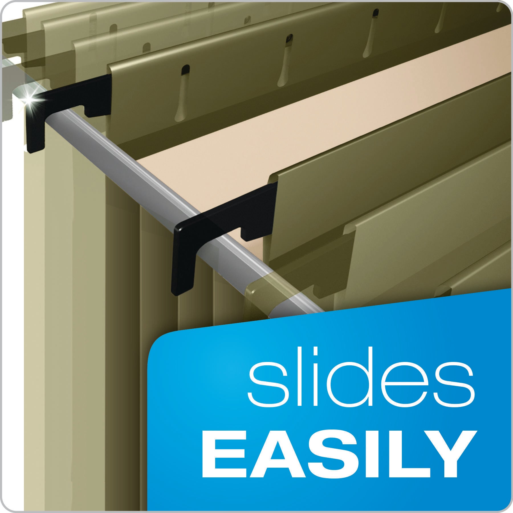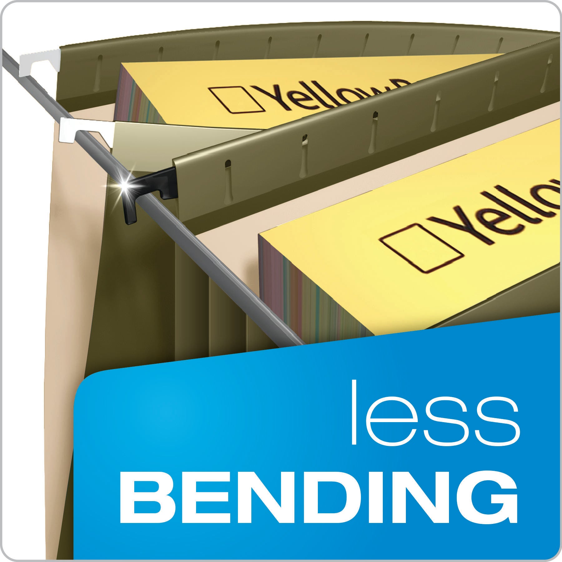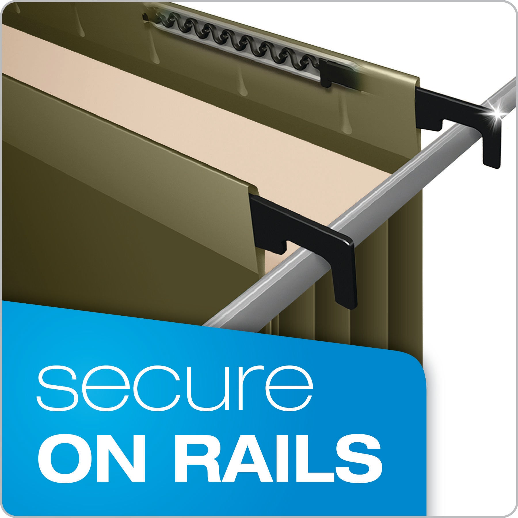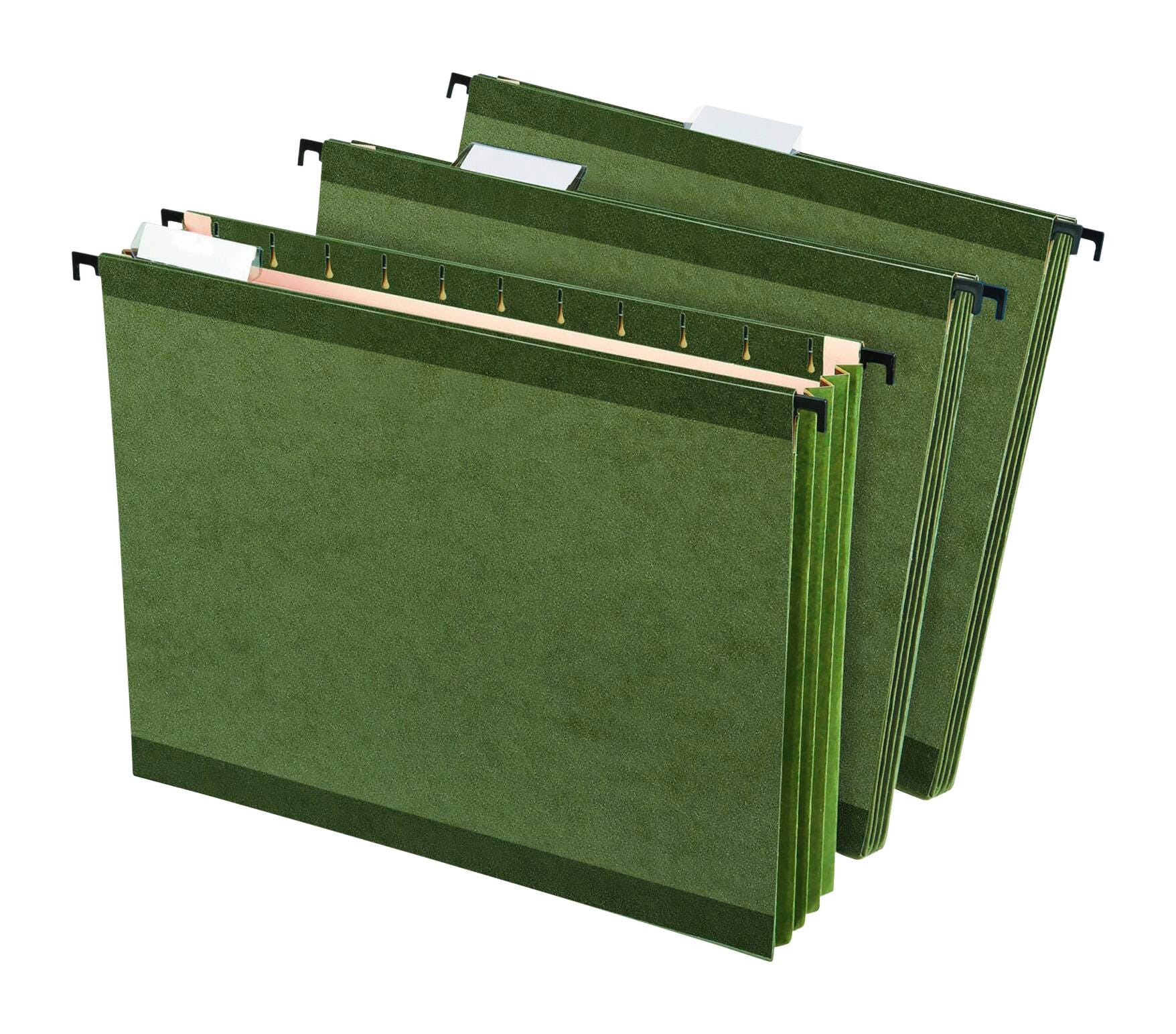 Pendaflex SureHook Letter Size Hanging File Pocket with built-in tension springs to ensure that rods bend less has polylaminated strips to reinforce top and bottom edges. Extra capacity hanging file pocket featuring 5 tab positions has full height gussets that won't get caught on the file drawer rails. File pocket expands up to 3-1/2 inches and is a perfect choice for larger projects with lots of paper. Acid free file pocket offering superior durability has folders that stay on rails and slide more easily. Standard green file pocket contains 10% post-consumer fiber and is sold as 4 per pack.