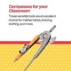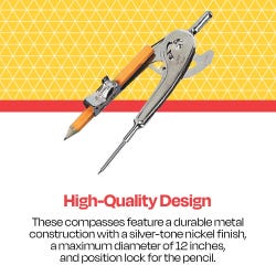 Create perfect circles for your art, geometry, or drafting class with the School Smart ball bearing compass with long point. The technical drawing instrument consists of two parts (a long point with a spike at the end and a pencil holder with a positive lock) that are connected by a hinge that is easy to adjust for drawing smaller or larger circles. Simply set the geometry compass for your desired size. This metal compass can draw up to a circle 12 inches in diameter as a maximum. Our geometry compass set comes with 12 compasses per pack; pencils sold separately.Features