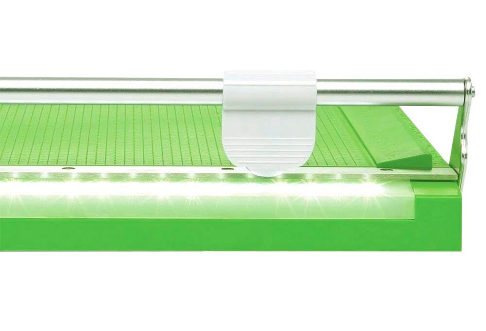 The Pro Paper Trimmer from Cutterpillar delivers the best of both worlds with a gear-driven rotary blade that passes smoothly by a stationary blade for clean cuts through a variety of materials. The board features a powerful LED light track that illuminates the cutting edge for enhanced visibility and accuracy while cutting. The ABS composite construction is light and strong enough to stand up to years of use. The base of the board has rubber feet that provide stability without leaving marks on your work surface. The large size allows you to cut up to 12-inch sheets of paper, cardboard, and more! Requires 4 AA batteries, not included.Features