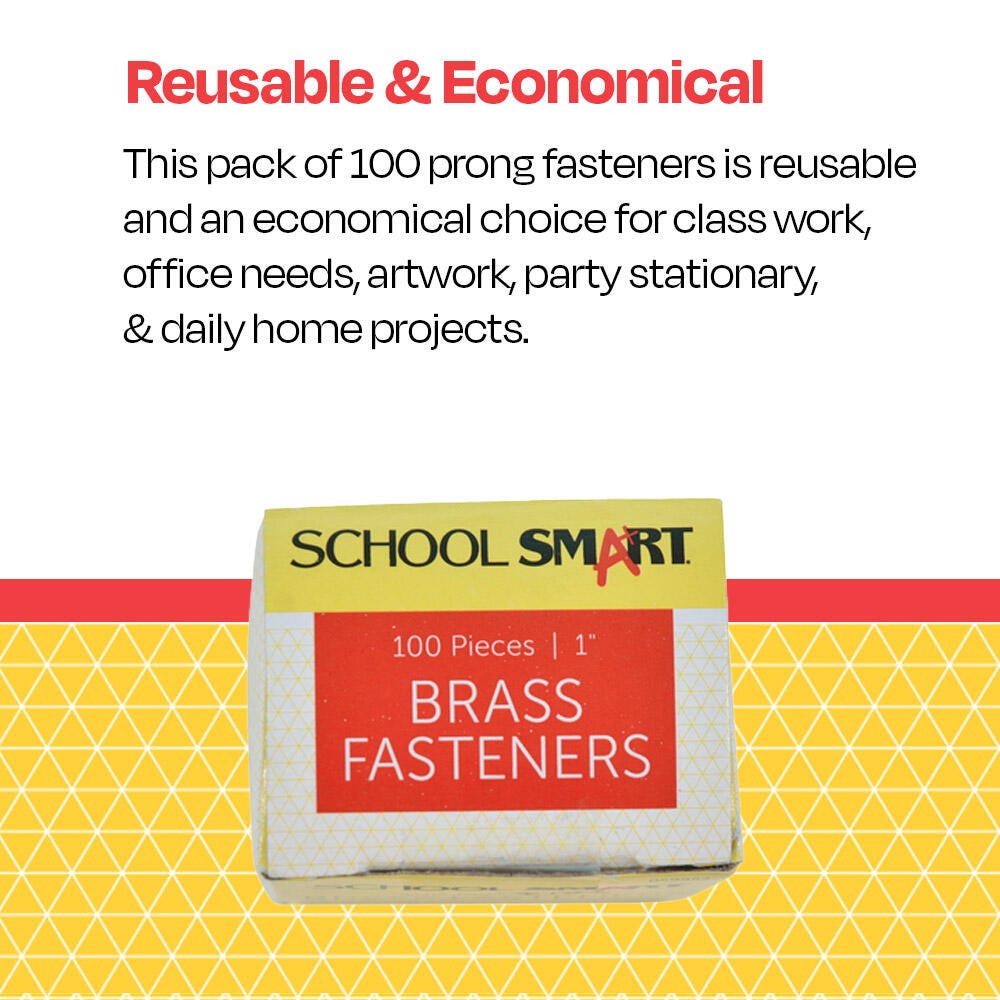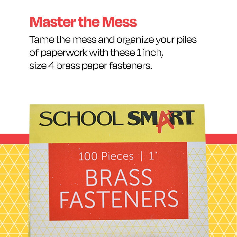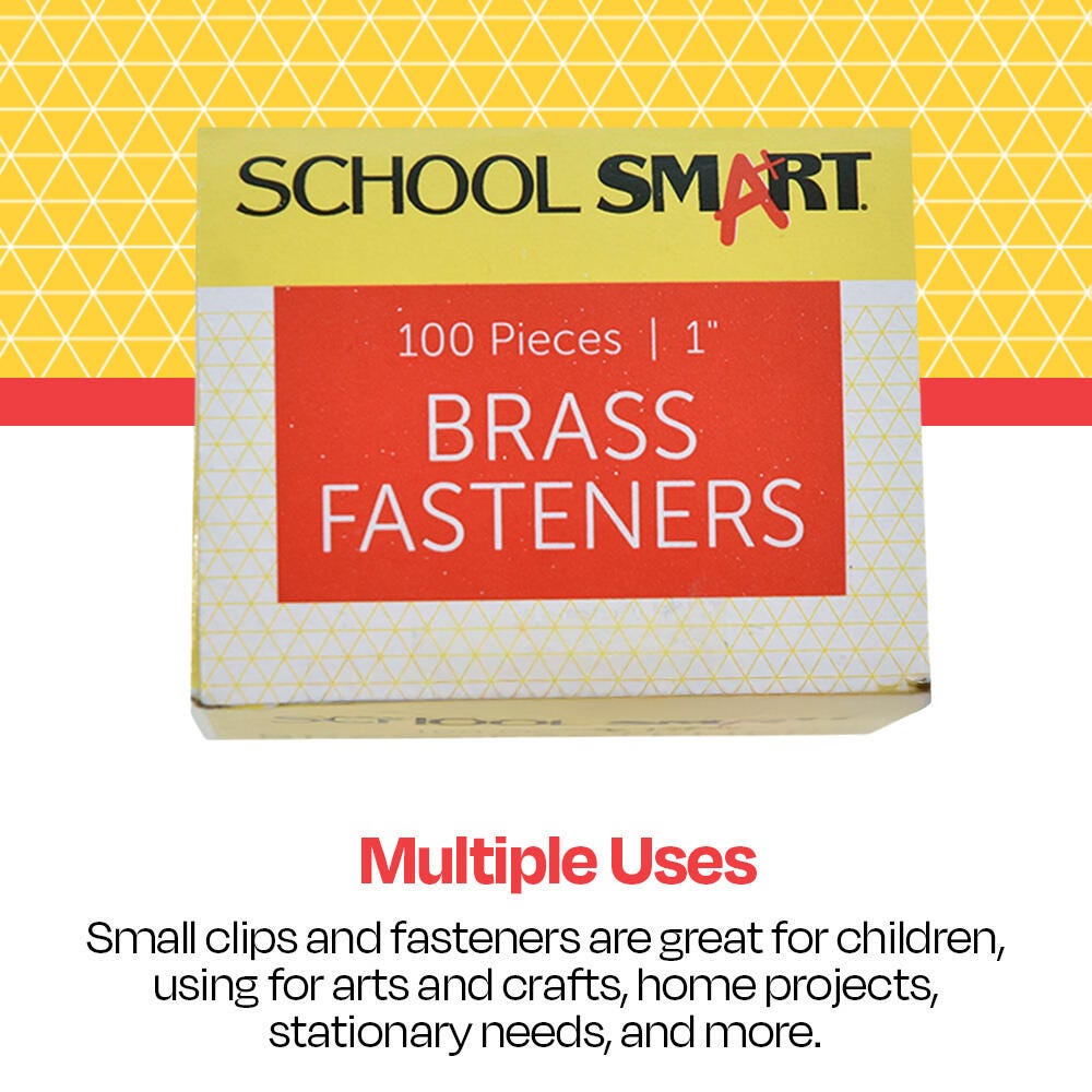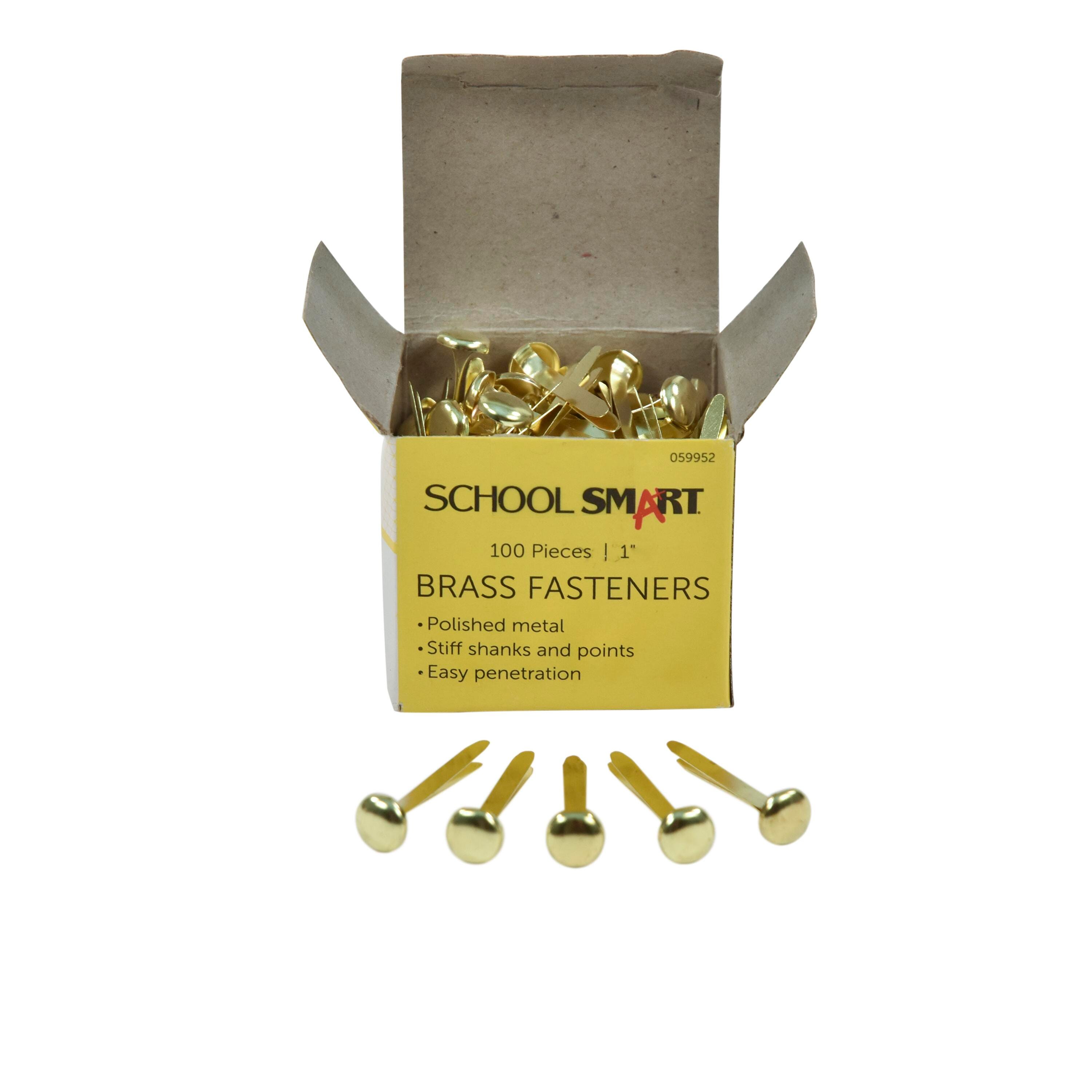 Description These Brass-Plated Fasteners from School Smart offer a handy organization solution for important documents. Ideal for school and office use, each fastener measures 1-inch and is constructed of finely polished metal with stiff shanks and sharp points that are easy to push through papers or into pre-punched holes. Once inserted, the fastener shafts spread evenly for a secure hold. This pack contains 100 Size 4 fasteners.Features Brass fastener head measures 0.315 inches Easy to push through papers School Smart offers quality teaching and education products at a great price Classroom tested and ready for home or school