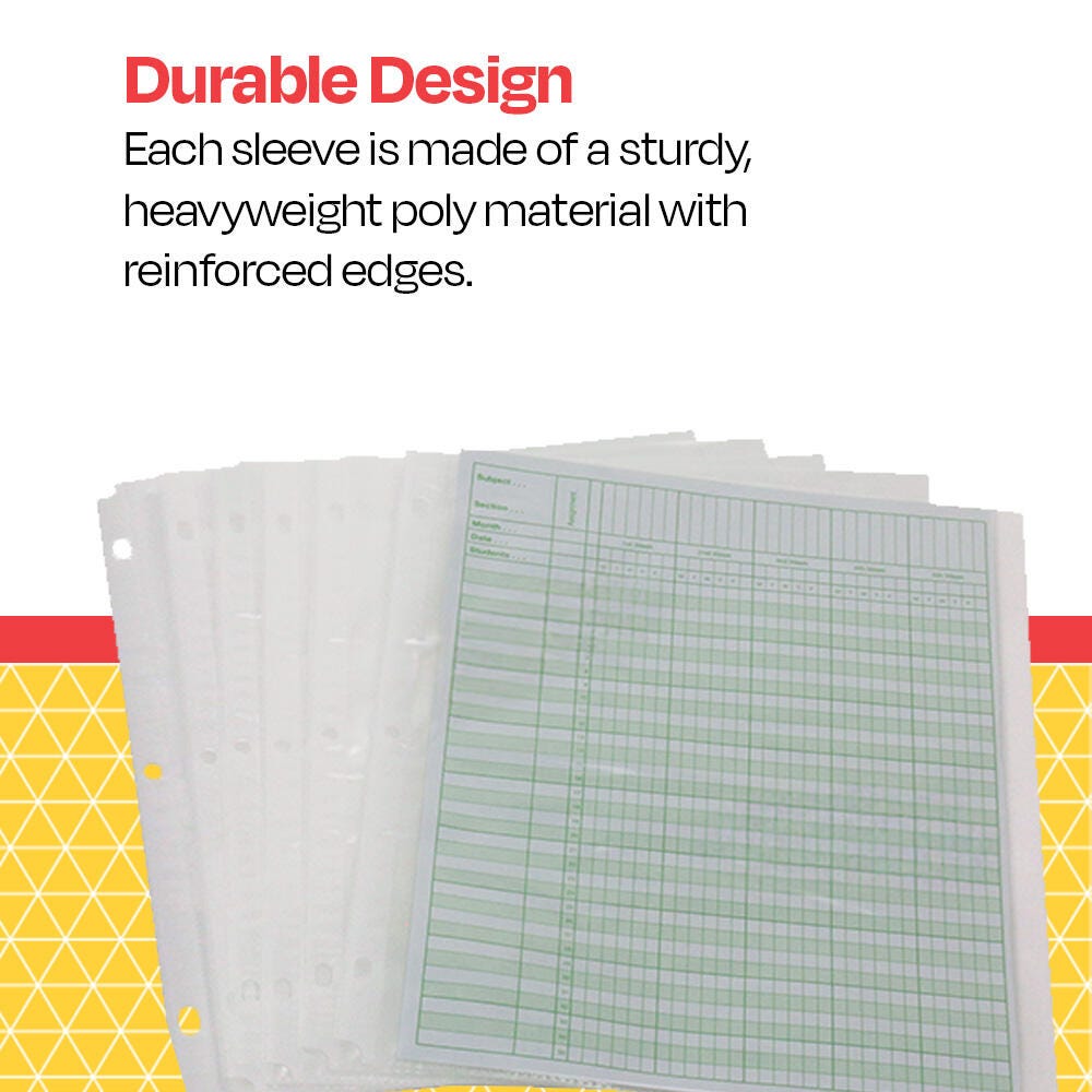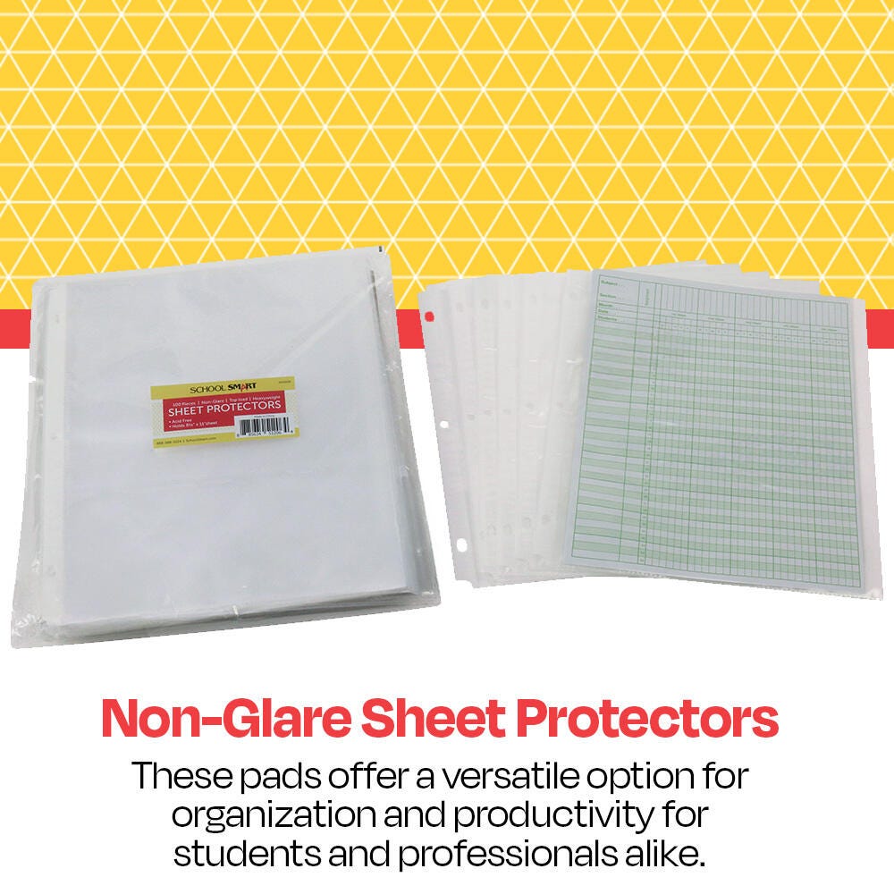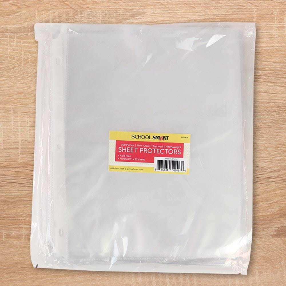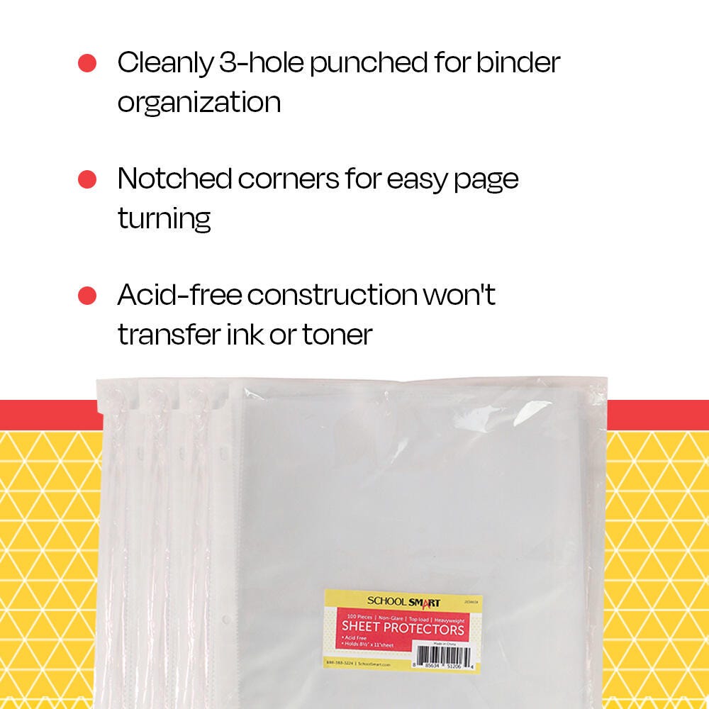 The School Smart Heavy Duty Sheet Protectors for 3-ring binders accommodate standard letter-size 8-1/2 x 11 inch sheets for versatile document storage. The finish allows you to see your documents with no glare while protecting them from tears, greasy fingerprints, and other wear. The binder sleeves fit perfectly in a three-ring binder, allowing you to organize and keep all your documents safe. These versatile page protectors can also be used as a dry erase sheet, perfect for classrooms, DIY transparency sheets, doctor offices, signage, and more. They are designed with extra capacity to hold between 10-12 sheets of paper for additional project flexibility. This pack contains 100 non-glare sheet protectors.Features