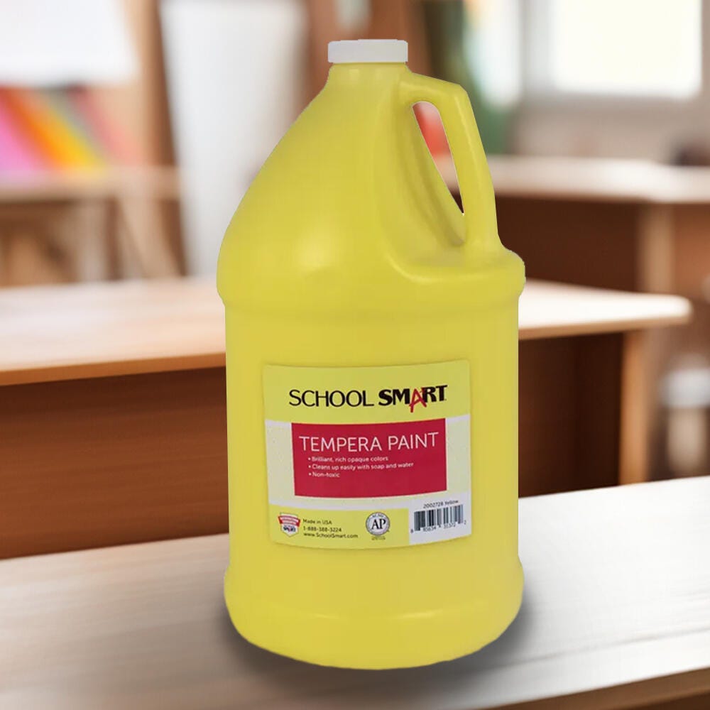 Description The School Smart traditional tempera paint gallon comes in a yellow color. This paint is an economical value size bottle for classrooms and childcare centers. Our brilliant and rich opaque paint color offers students endless creativity and color blending possibilities. The non-toxic tempera paint cleans up easily with soap and water and won’t chip, flake, or crack when dry. This large bottle of yellow tempera paint is great for classrooms, schools, art classes, and after school programs.
