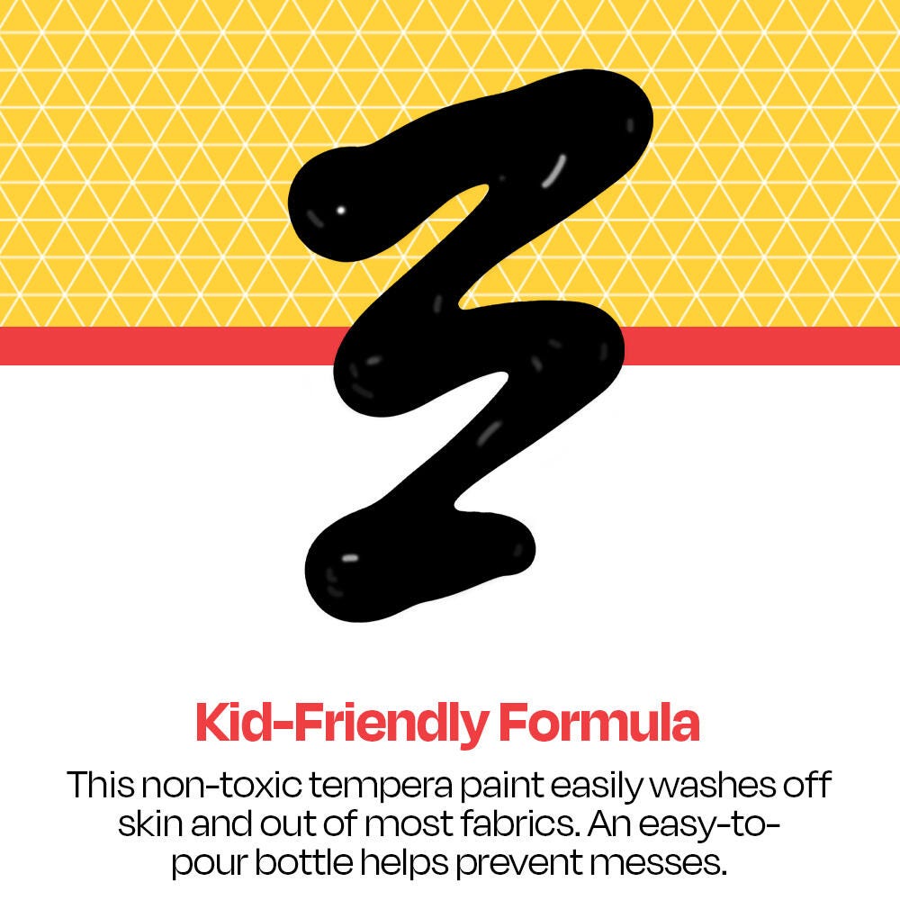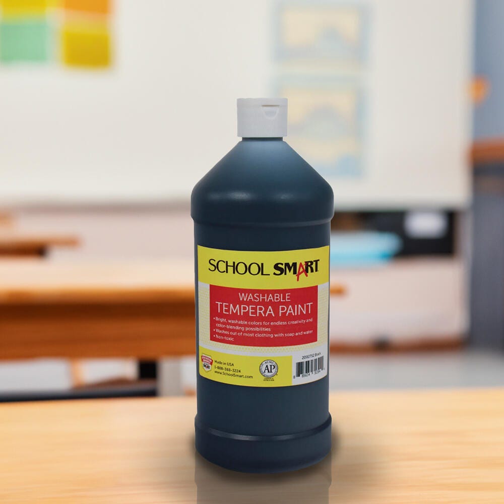 Description The School Smart washable tempera paint comes in a black color. This bottle of black tempera paint is great for classrooms, schools, art classes, and after school programs. The brilliant and rich opaque paint color offers students endless creativity and color blending possibilities. Our non-toxic tempera paint cleans up easily with soap and water and won't chip, flake, or crack when dry.