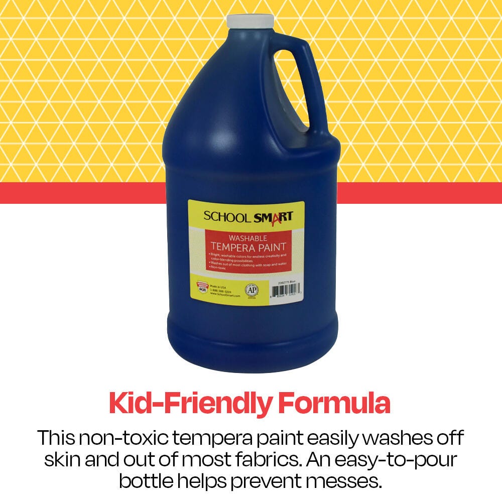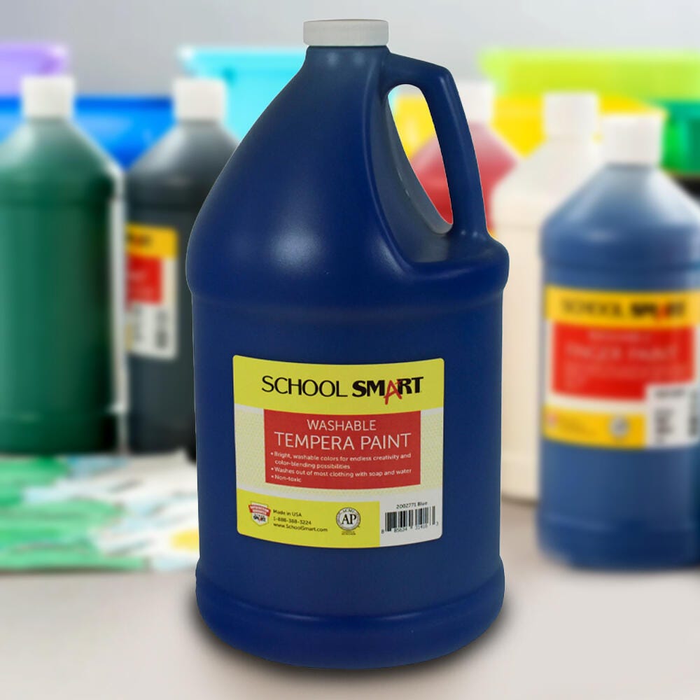 Description The School Smart washable tempera paint gallon comes in a blue color. This large bottle of blue tempera paint is great for classrooms, schools, art classes, and after school programs. The brilliant and rich opaque paint color offers students endless creativity and color blending possibilities. Our non-toxic tempera paint cleans up easily with soap and water and won’t chip, flake, or crack when dry.