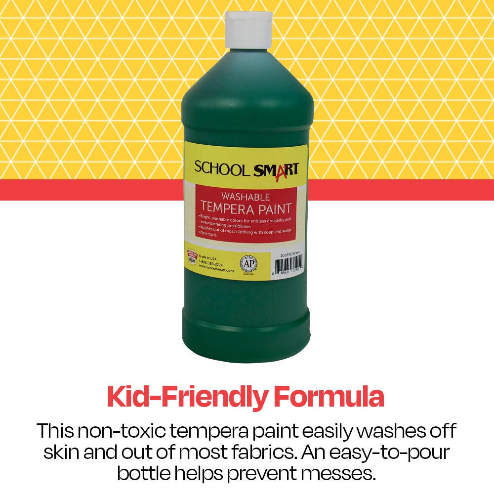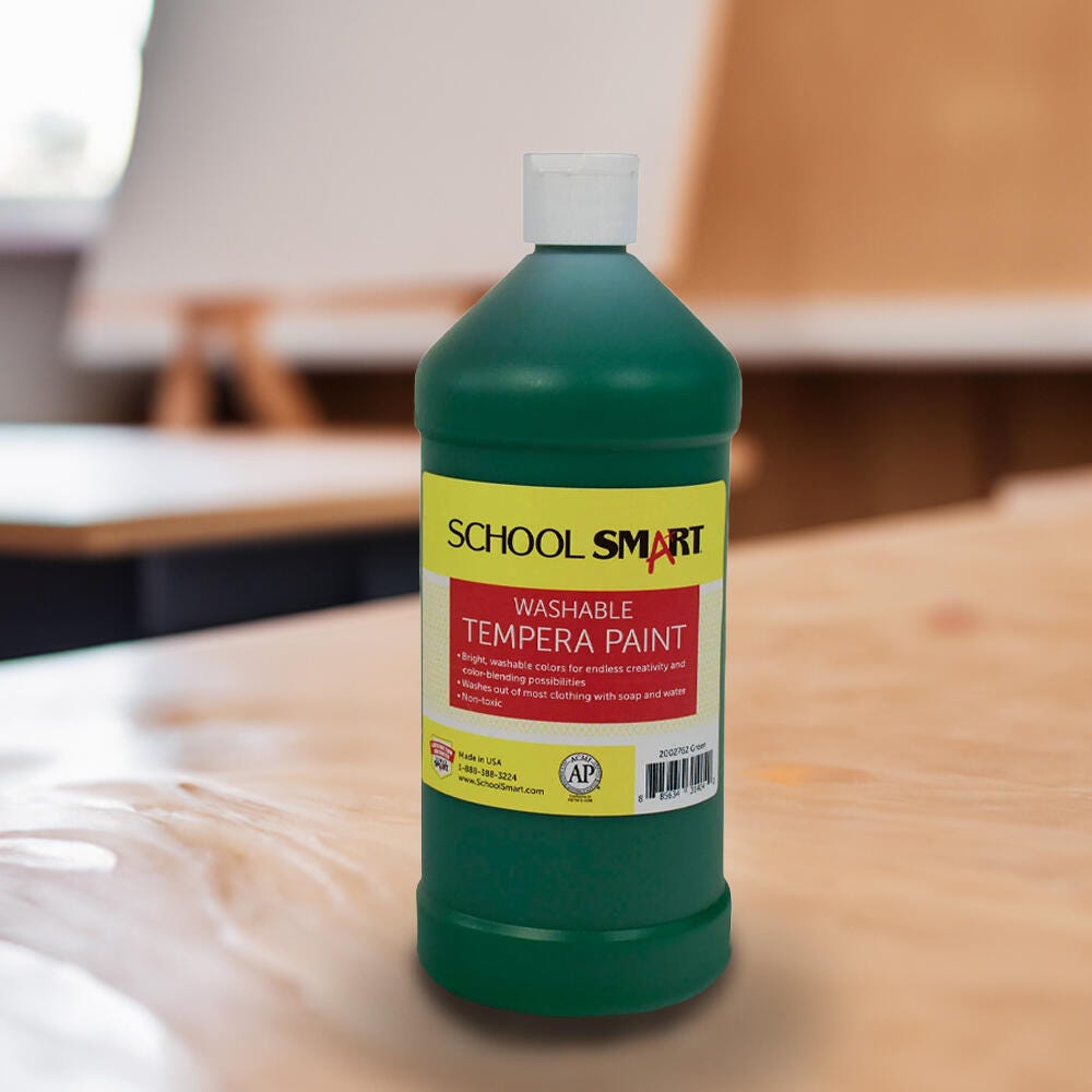 Description The School Smart washable tempera paint comes in a green color. This bottle of green tempera paint is great for classrooms, schools, art classes, and after school programs. The brilliant and rich opaque paint color offers students endless creativity and color blending possibilities. Our non-toxic tempera paint cleans up easily with soap and water and won't chip, flake, or crack when dry.