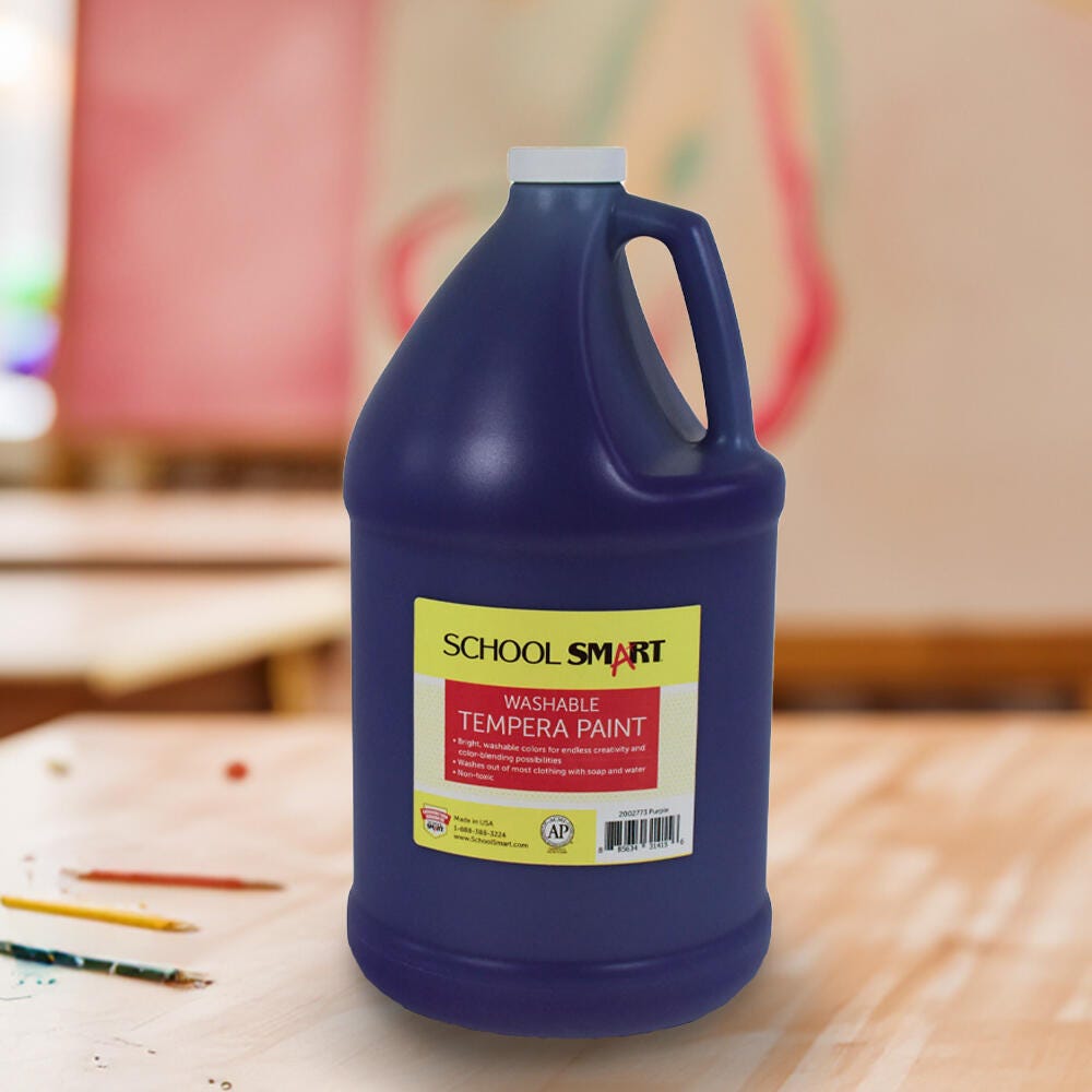 Description The School Smart washable tempera paint gallon comes in a purple color. This large bottle of purple tempera paint is great for classrooms, schools, art classes, and after school programs. The brilliant and rich opaque paint color offers students endless creativity and color blending possibilities. Our non-toxic tempera paint cleans up easily with soap and water and won’t chip, flake, or crack when dry.