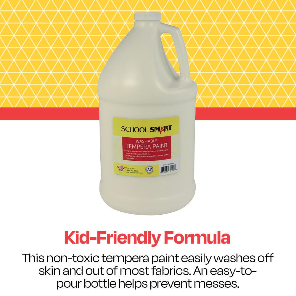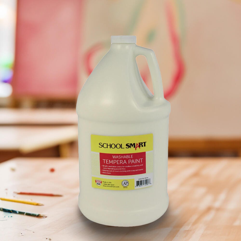 Description The School Smart washable tempera paint gallon comes in a white color. This large bottle of white tempera paint is great for classrooms, schools, art classes, and after school programs. The brilliant and rich opaque paint color offers students endless creativity and color blending possibilities. Our non-toxic tempera paint cleans up easily with soap and water and won’t chip, flake, or crack when dry.